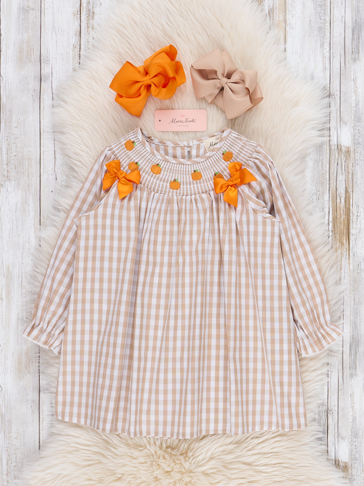 Embroidered Pumpkin Patch Gingham Smocked Dress