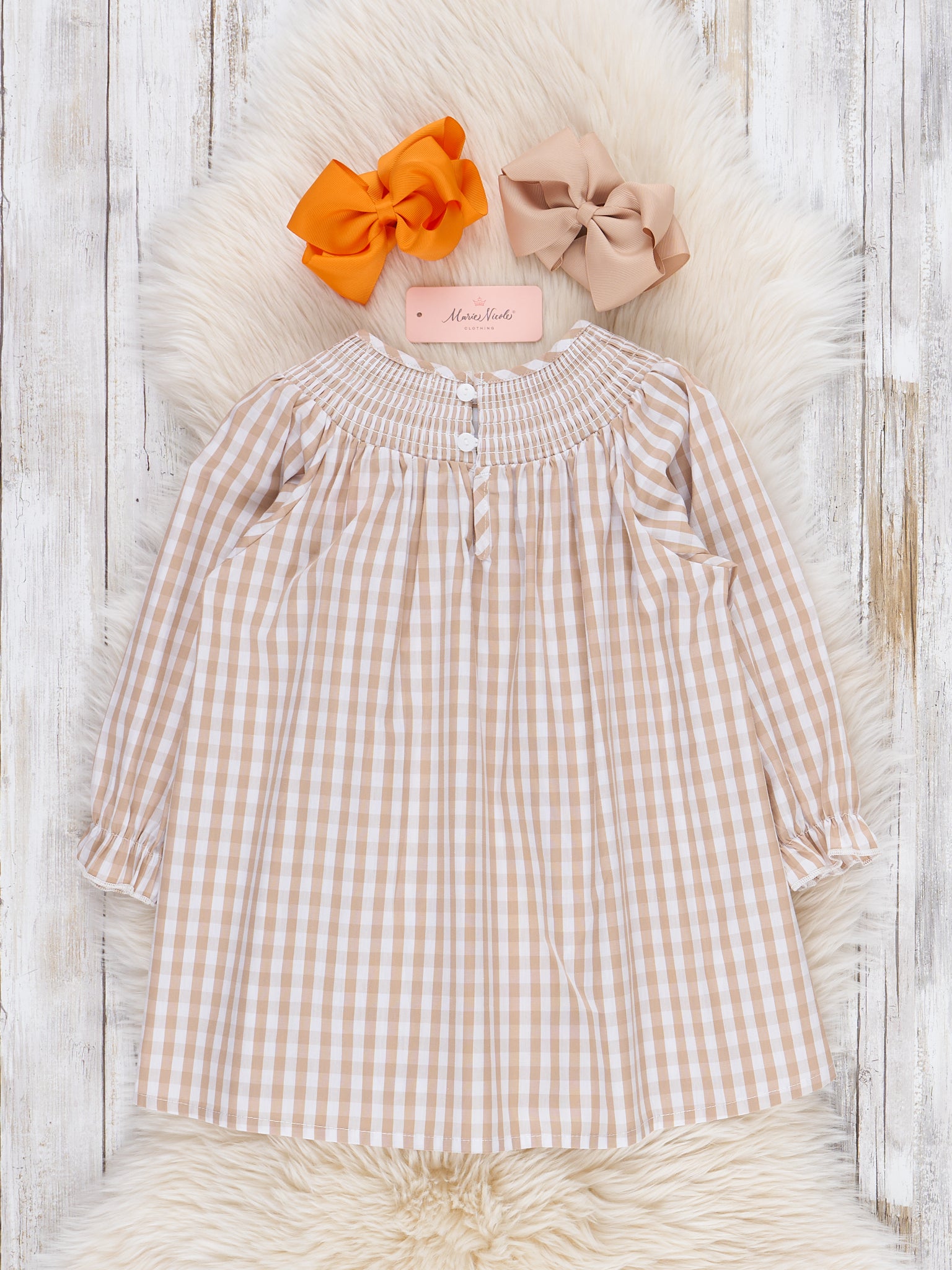 The Embroidered Pumpkin Patch Gingham Smocked Dress is a charming and timeless choice for fall festivities. Featuring delicate pumpkin embroidery over a classic gingham pattern and detailed smocking, this dress from Marie Nicole Clothing blends vintage-inspired style with cozy comfort. Crafted from soft, breathable fabric and finished with ribbon bows, it’s perfect for pumpkin patch adventures, family gatherings, and picture-perfect autumn moments.
