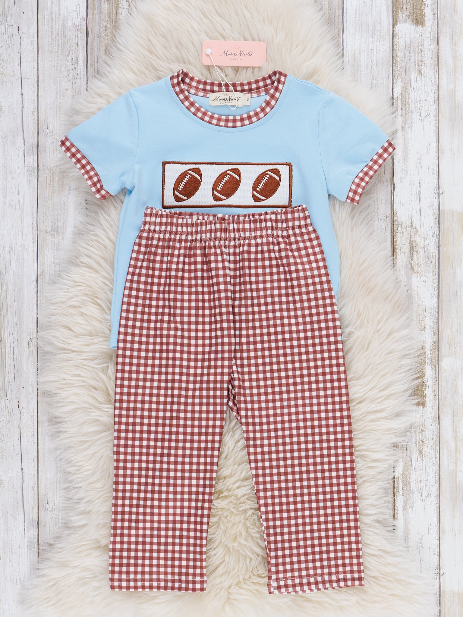 The Field Goals & Gingham Smocked Embroidered Outfit is for the football lovers! This two-piece set by Marie Nicole Clothing features embroidered footballs and charming gingham pants. With promised comfort, your child will enjoy all his running and playing in this outfit!