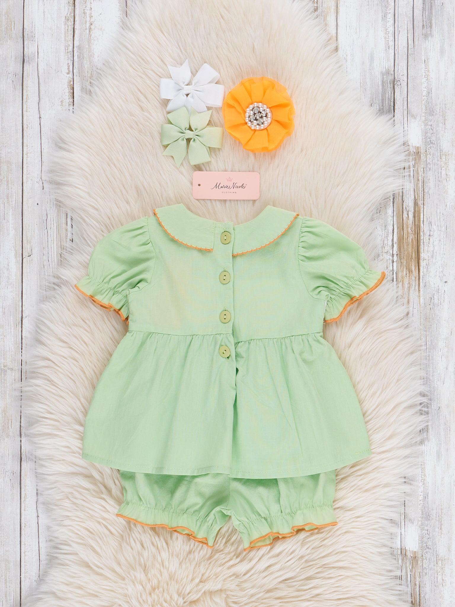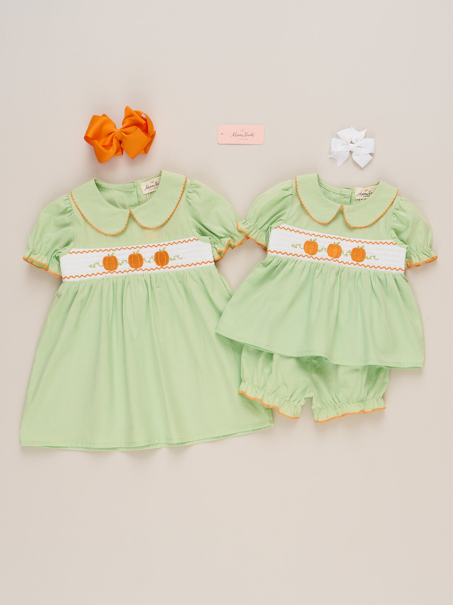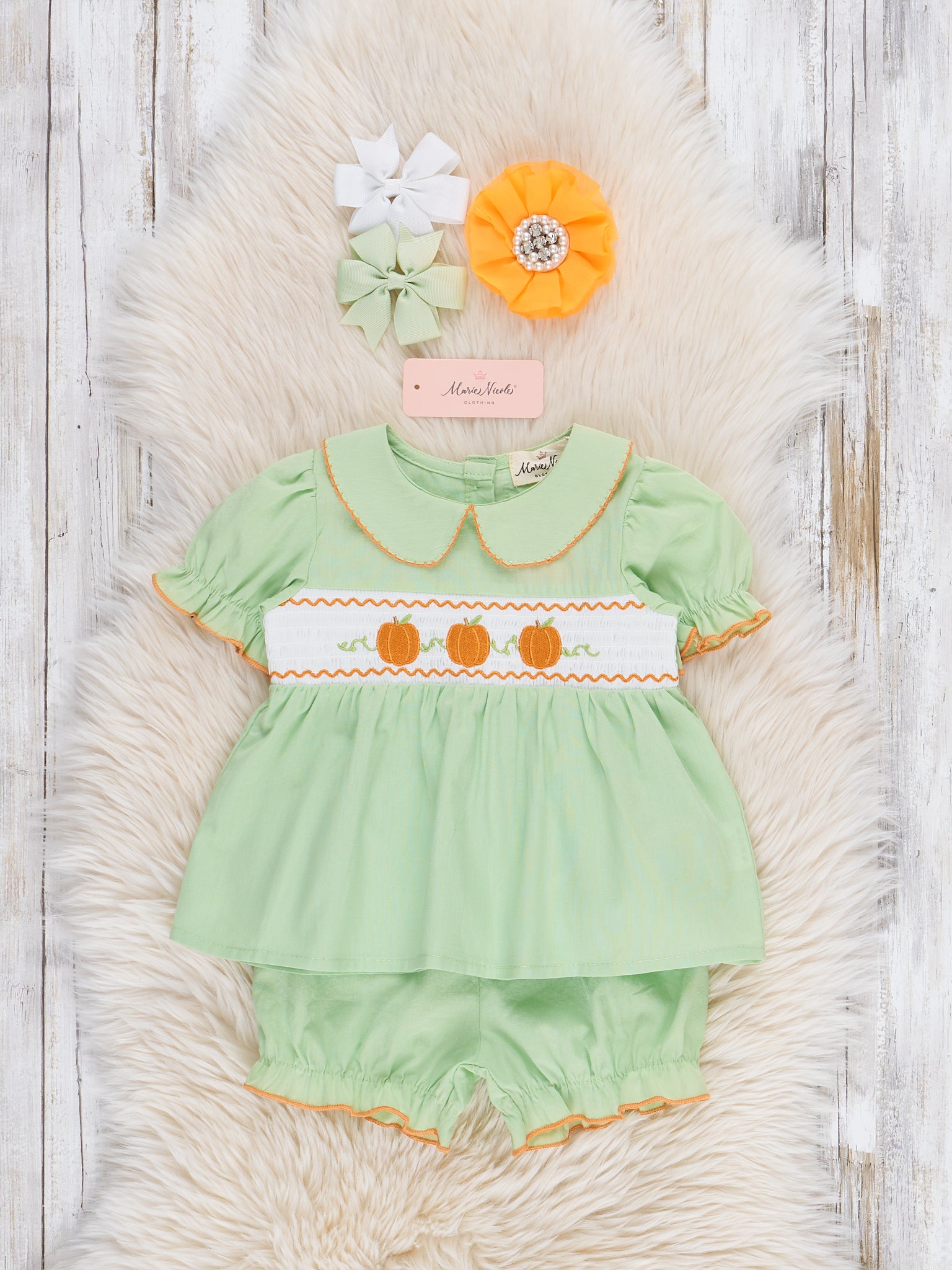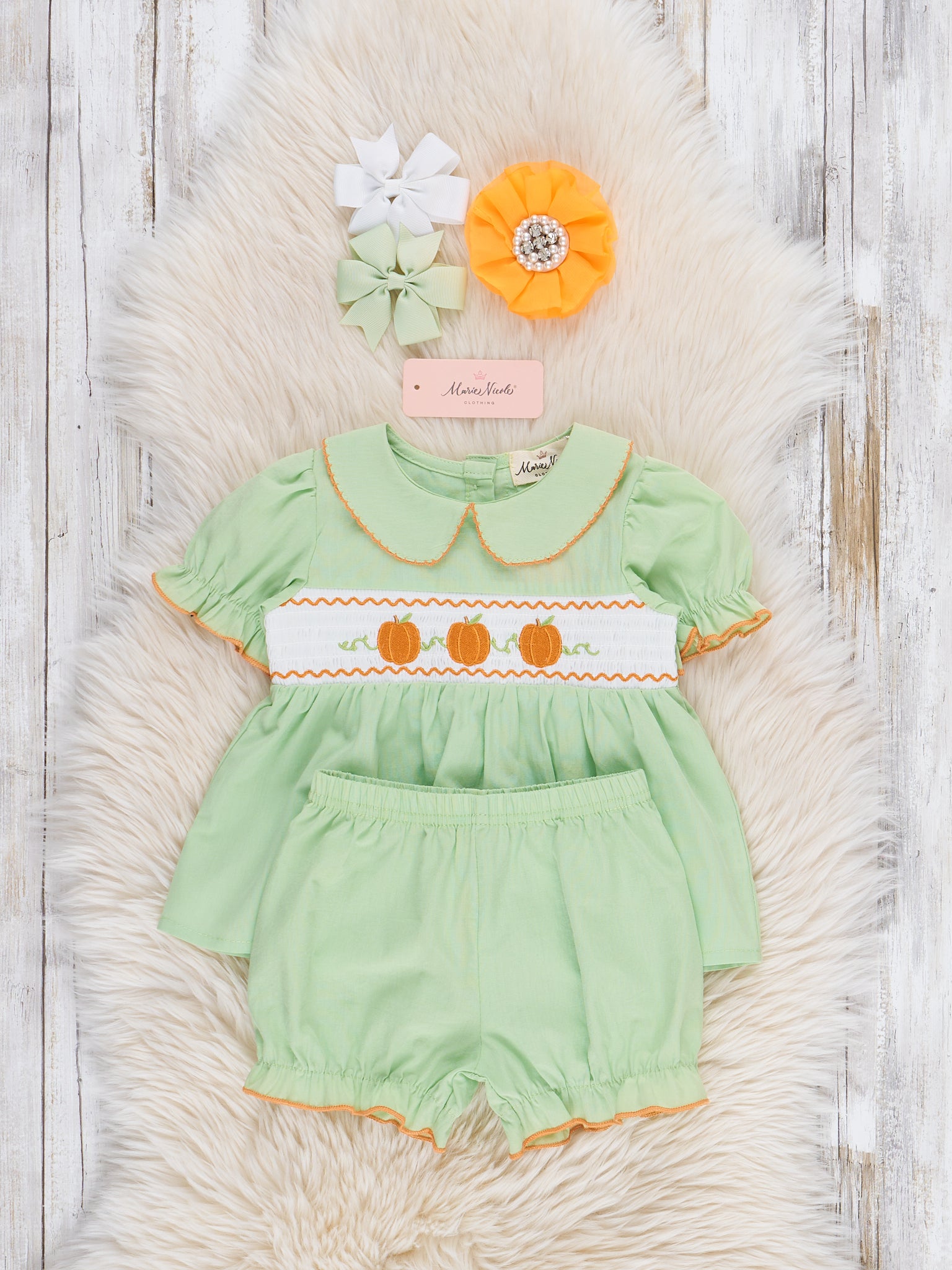 The Smocked Embroidered Sweet Pea Pumpkin Bloomers Outfit is perfect for days in the garden and visits to the pumpkin patch! From Marie Nicole Clothing, this two-piece set features a smocked bodice and the cutest pumpkin embroidery. The delightful green fabric is soft and comfy and makes for a charming look, fit for fall photos and family gatherings!