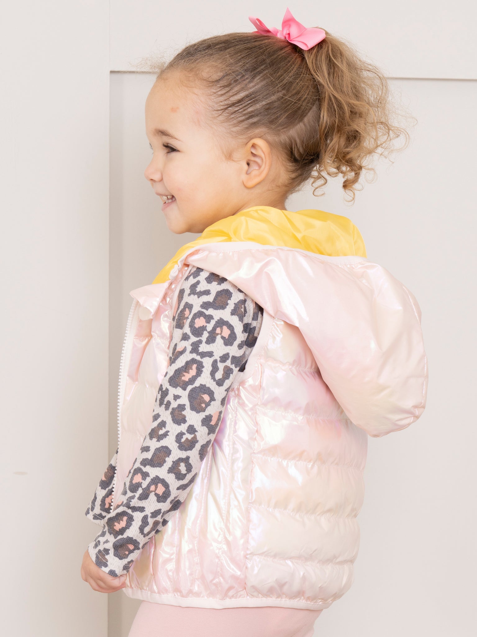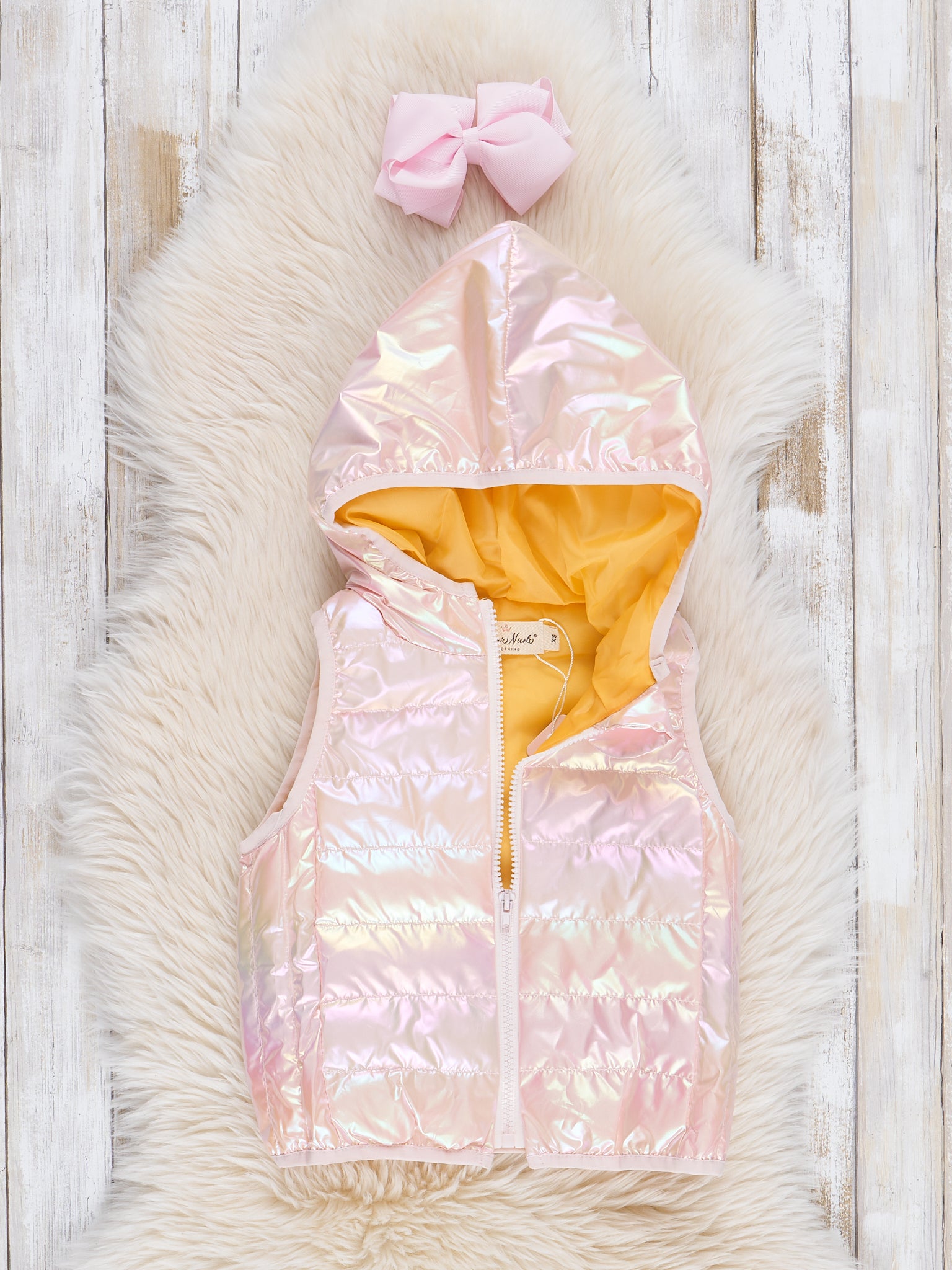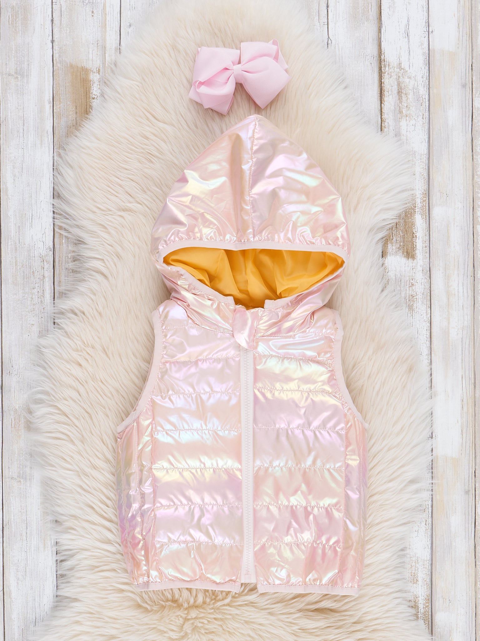 Elevate her winter wardrobe with our Girls' Hooded Iridescent Puffer Vest! ✨ This trendy vest adds a touch of sparkle to chilly days, featuring a shimmery iridescent finish that captures attention effortlessly. Perfect for layering, it's a stylish choice to keep her warm while shining bright through the season!