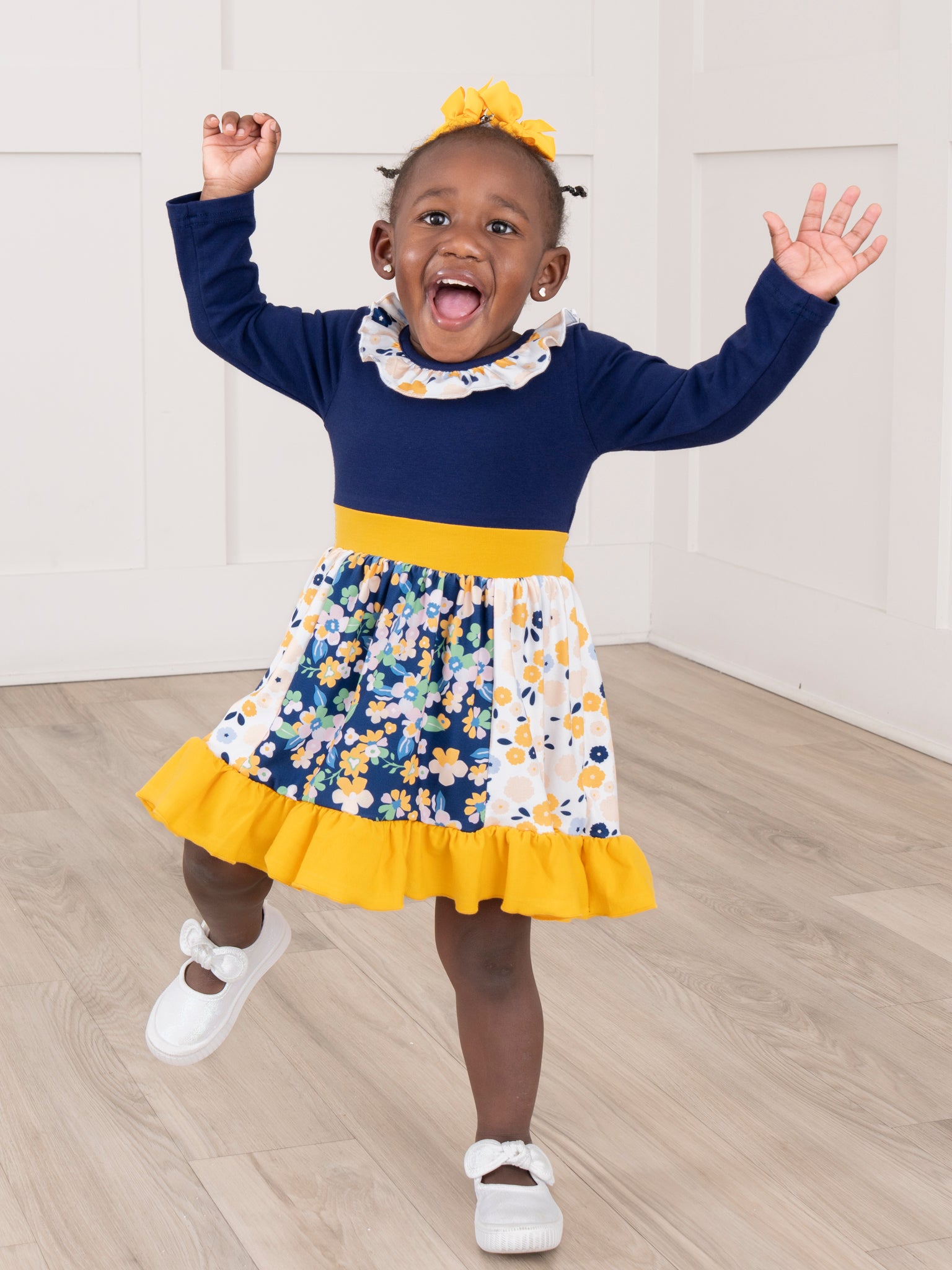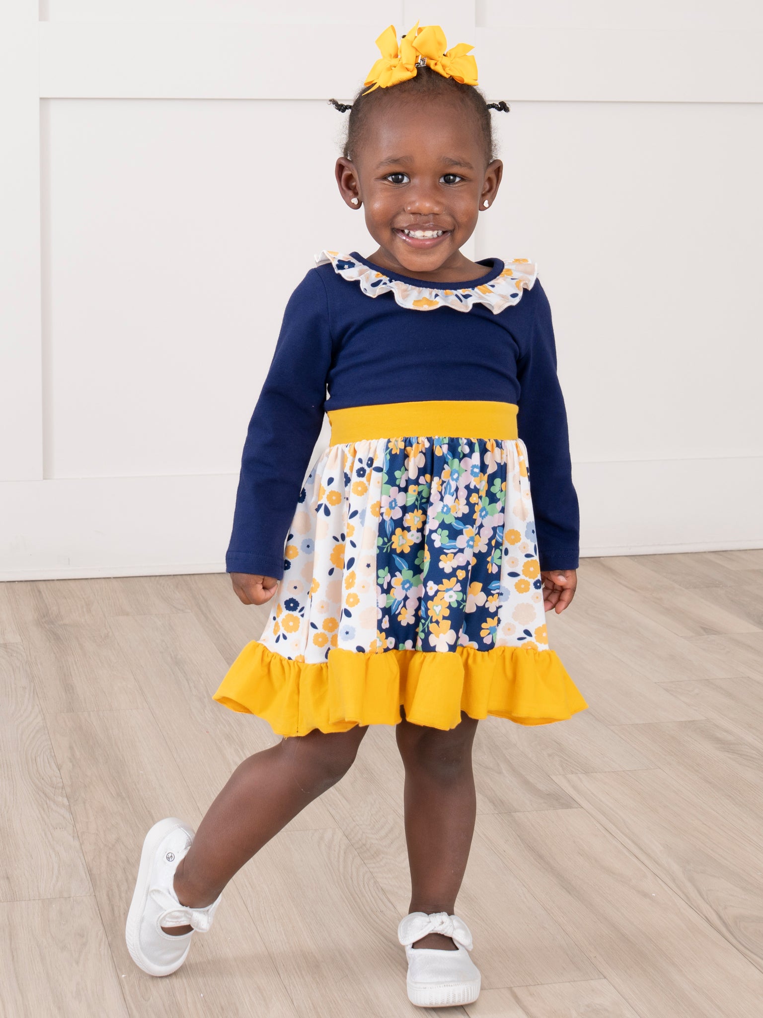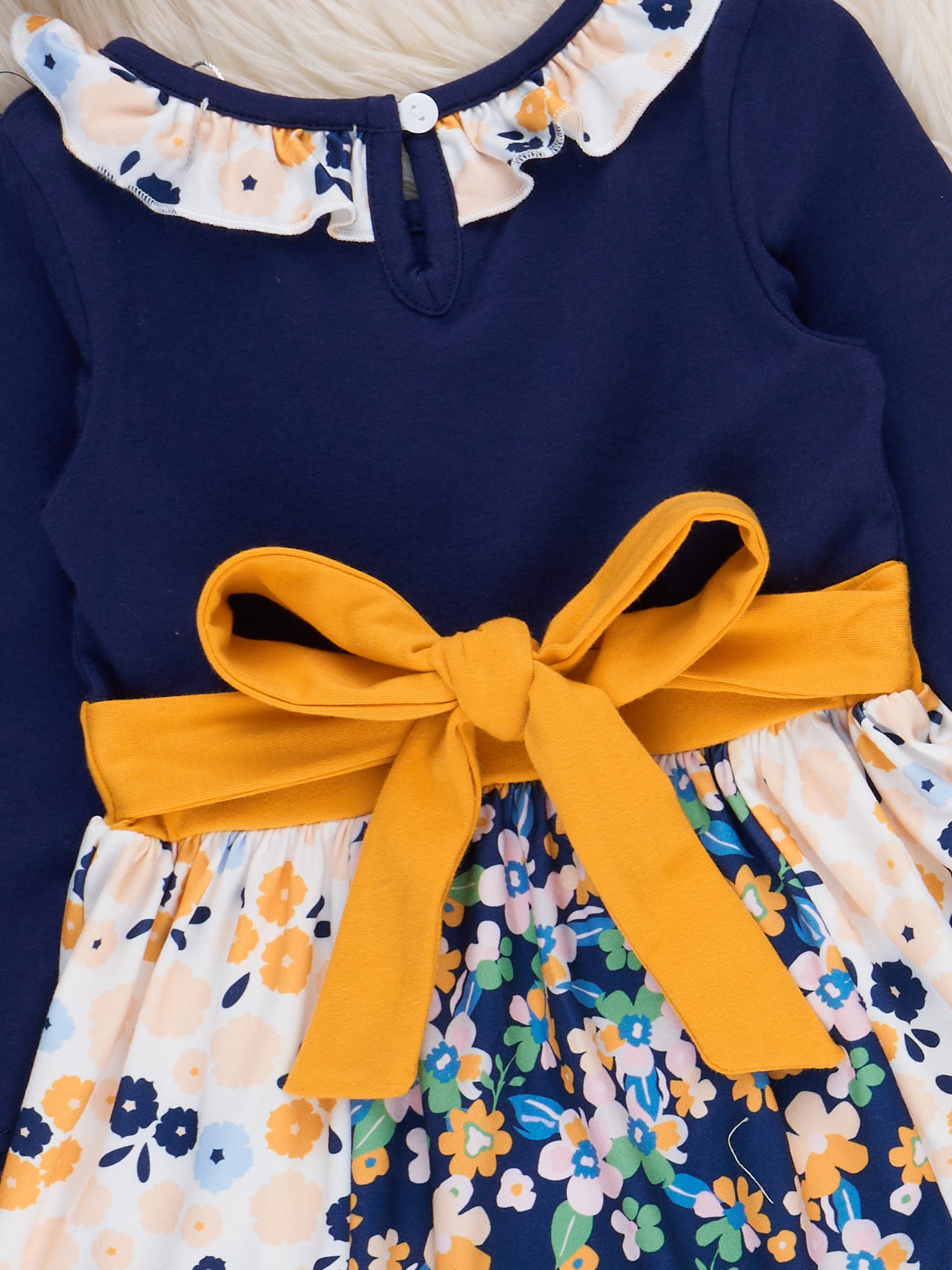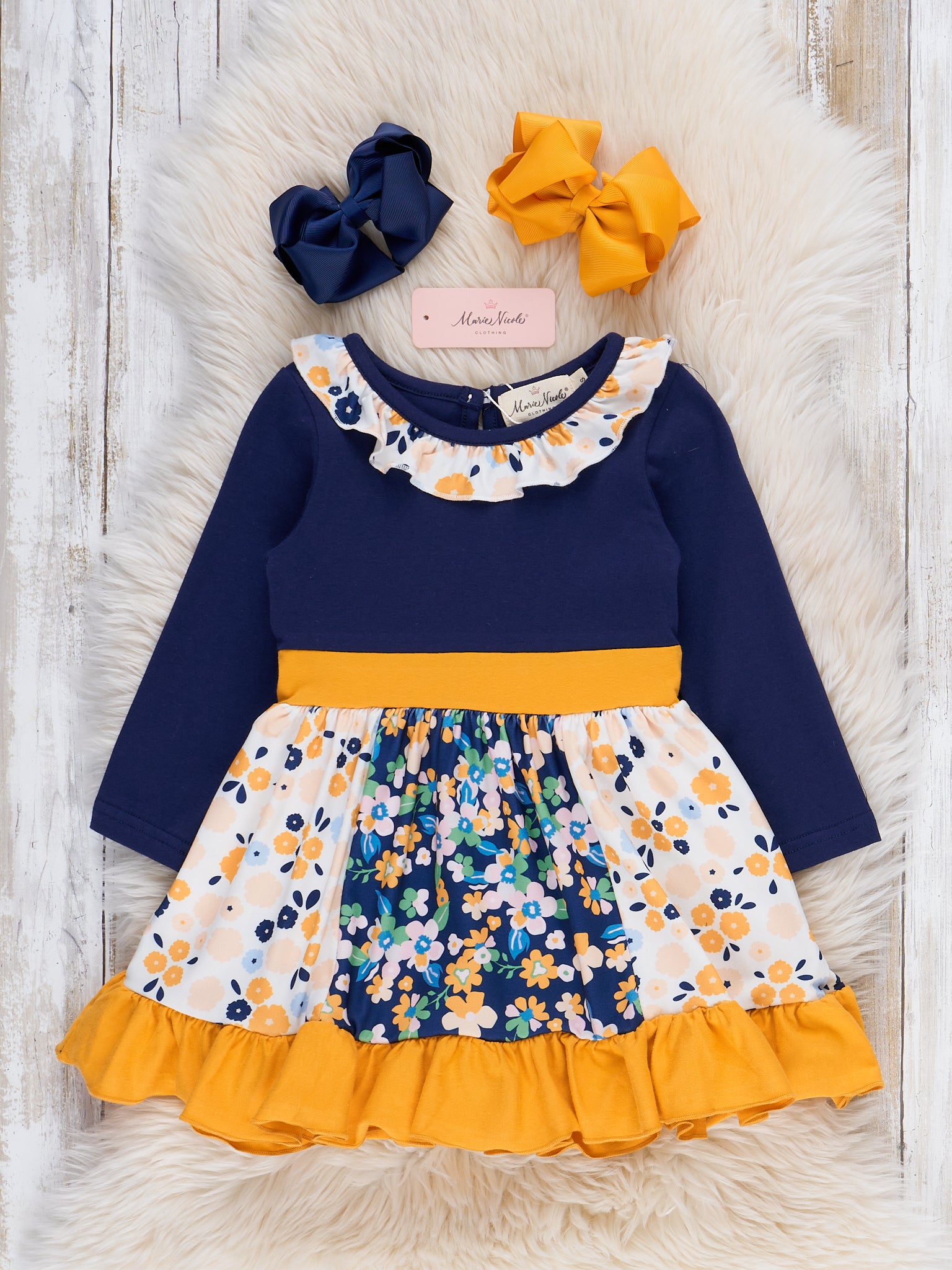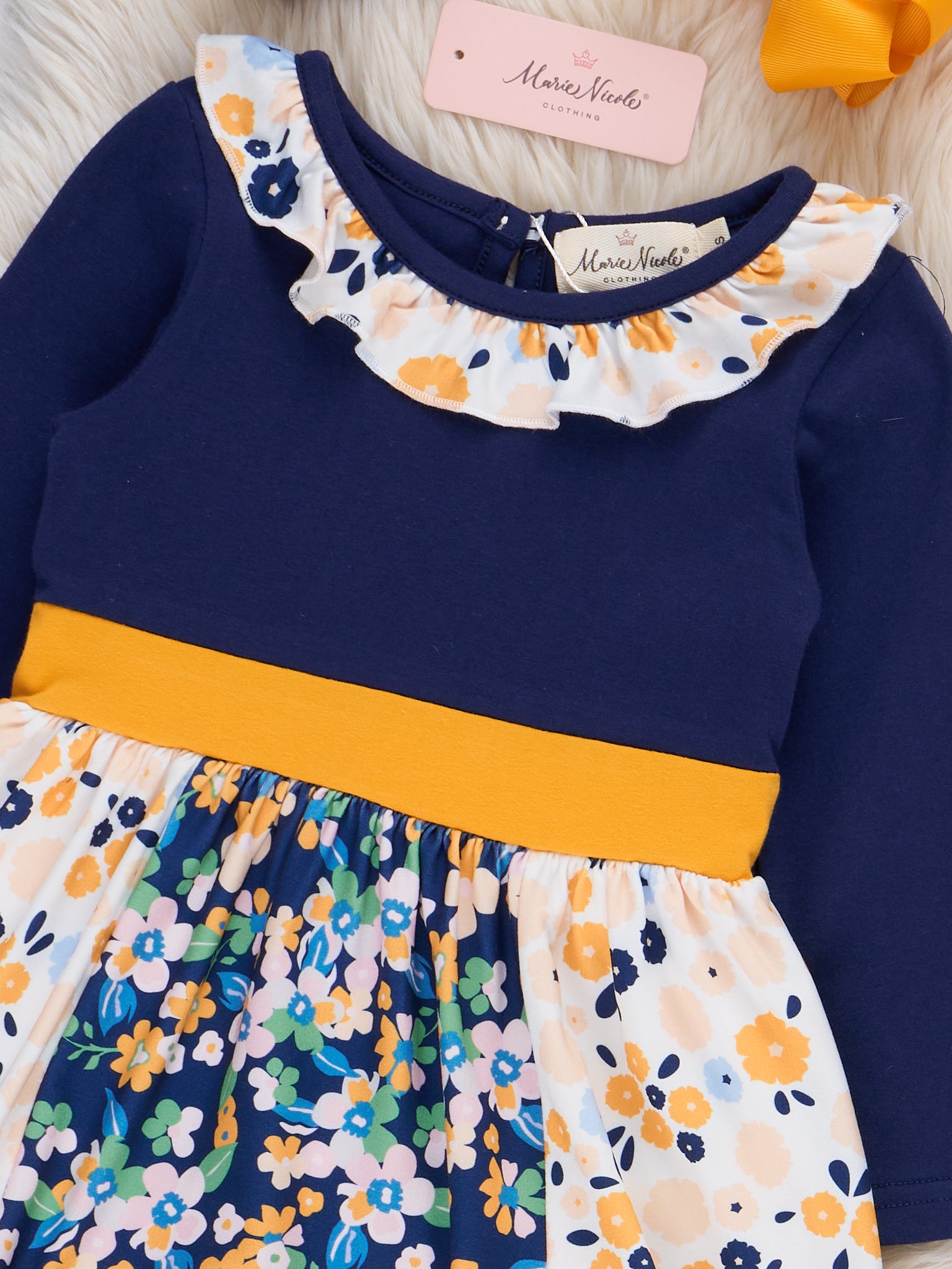 The Midnight Blooms Ruffle Dress by Marie Nicole features a vibrant, color-blocked bodice and long sleeves, accented with a whimsical ruffle collar. The skirt is adorned with a cheerful floral pattern, complemented by a wide sash that ties at the waist and a playful ruffle hem.