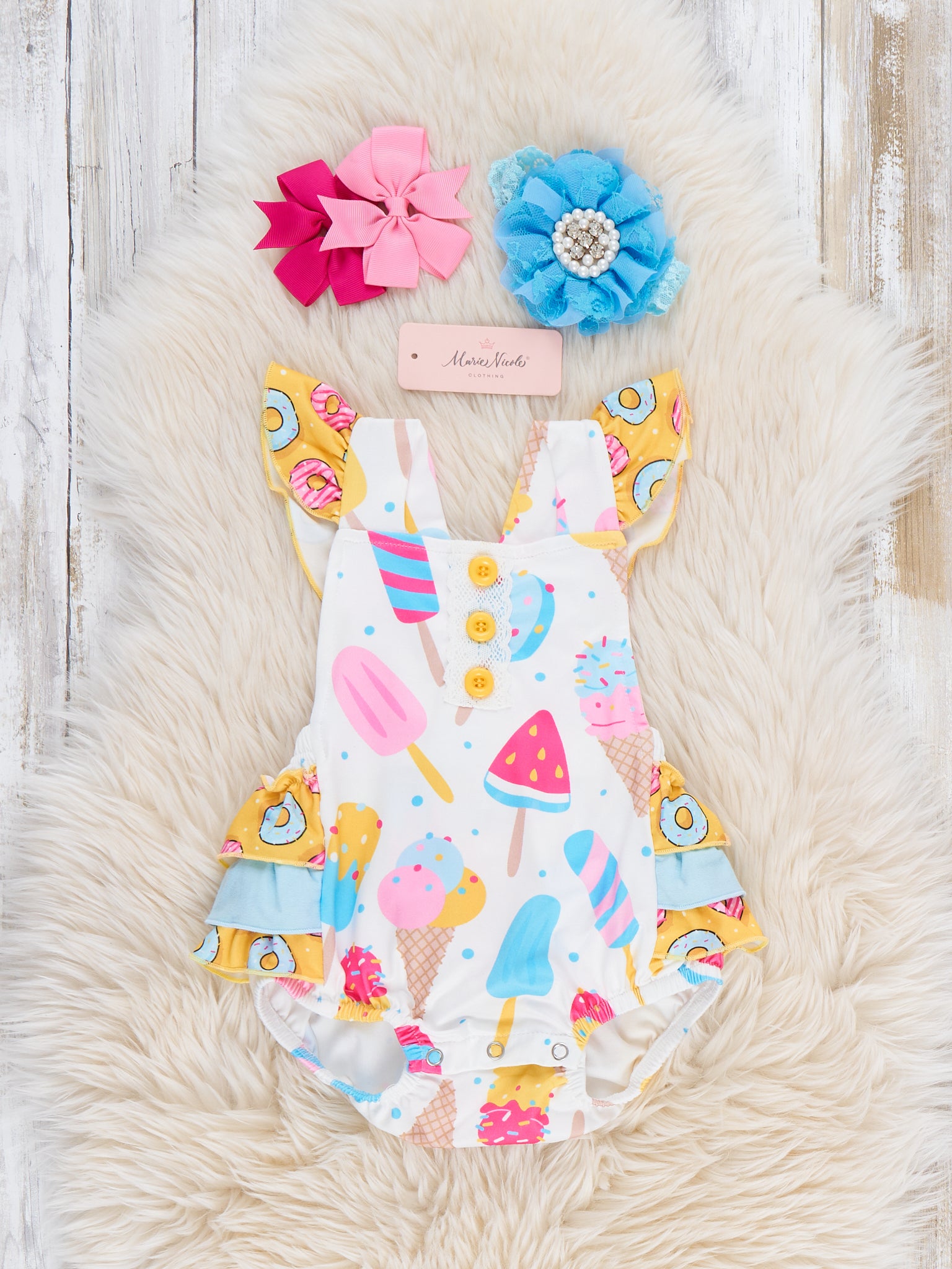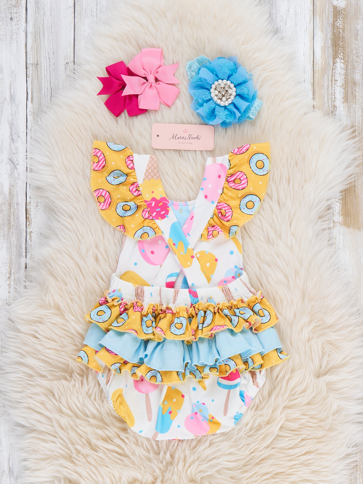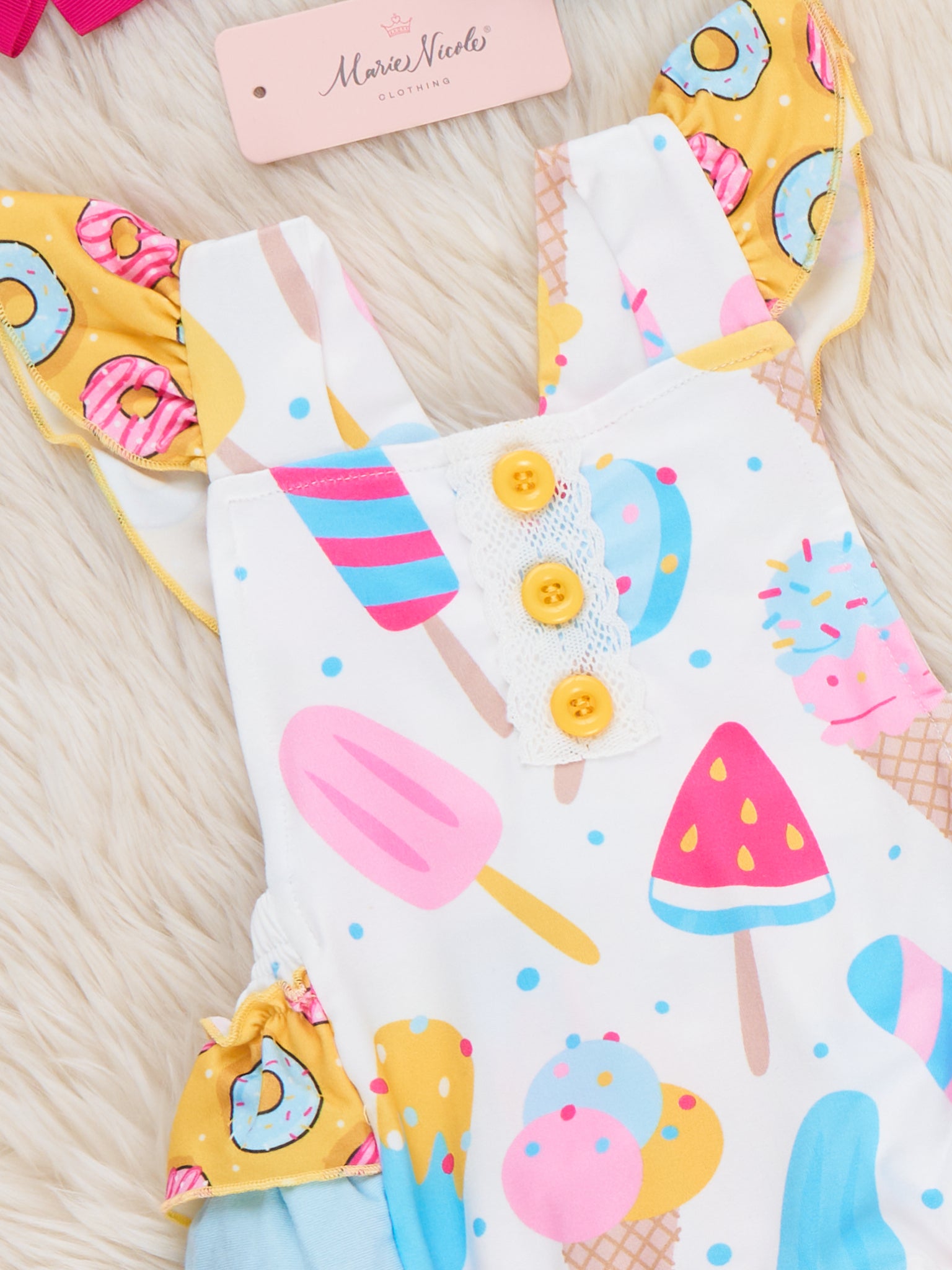 Get ready for some sweet summertime fun with our Summer Sweets Ruffle Bubble! This sibling set includes a girls outfit with a playful ice cream treats print bodice and donuts print ruffles. Perfect for warm weather adventures from Marie Nicole Clothing.
