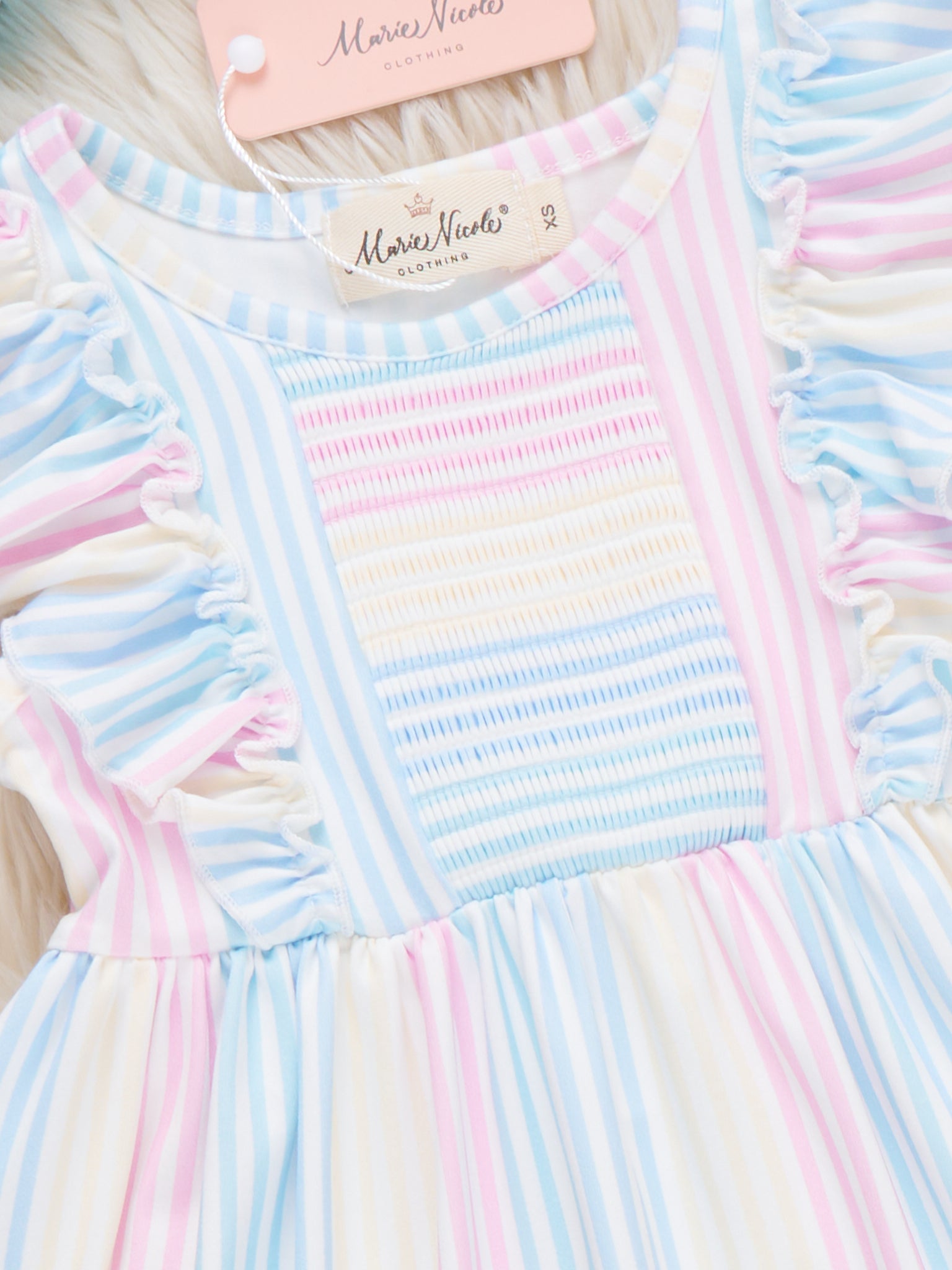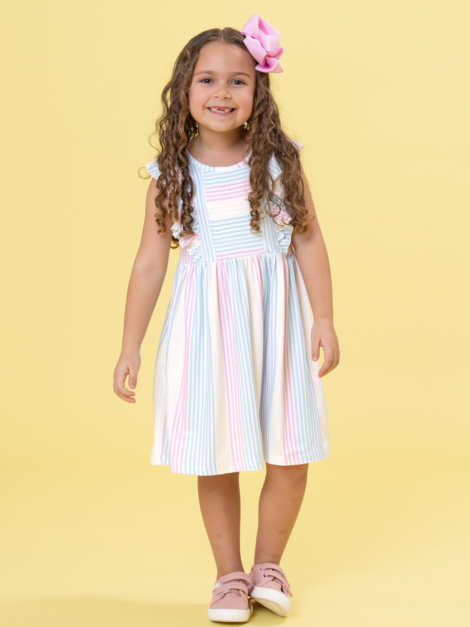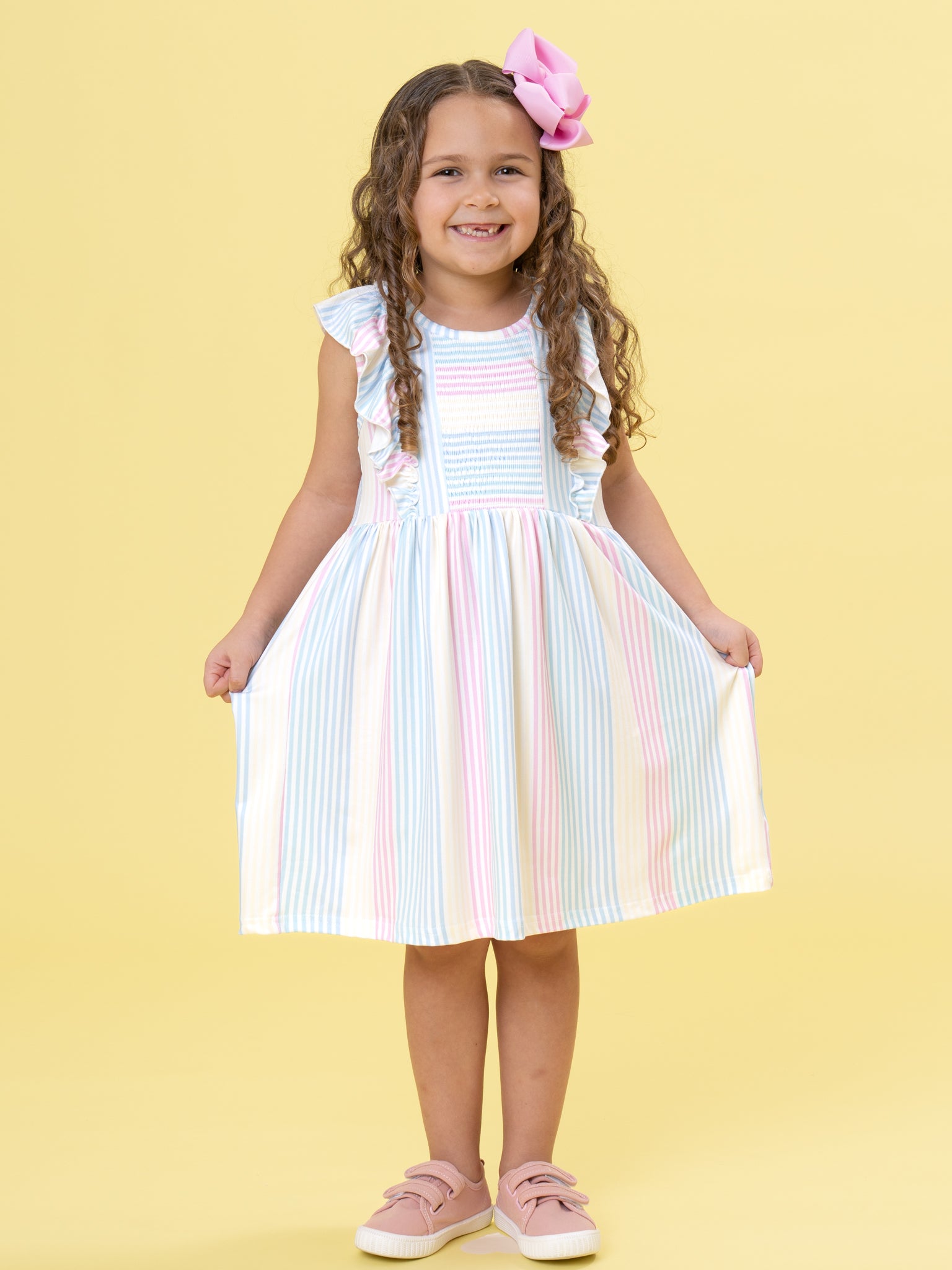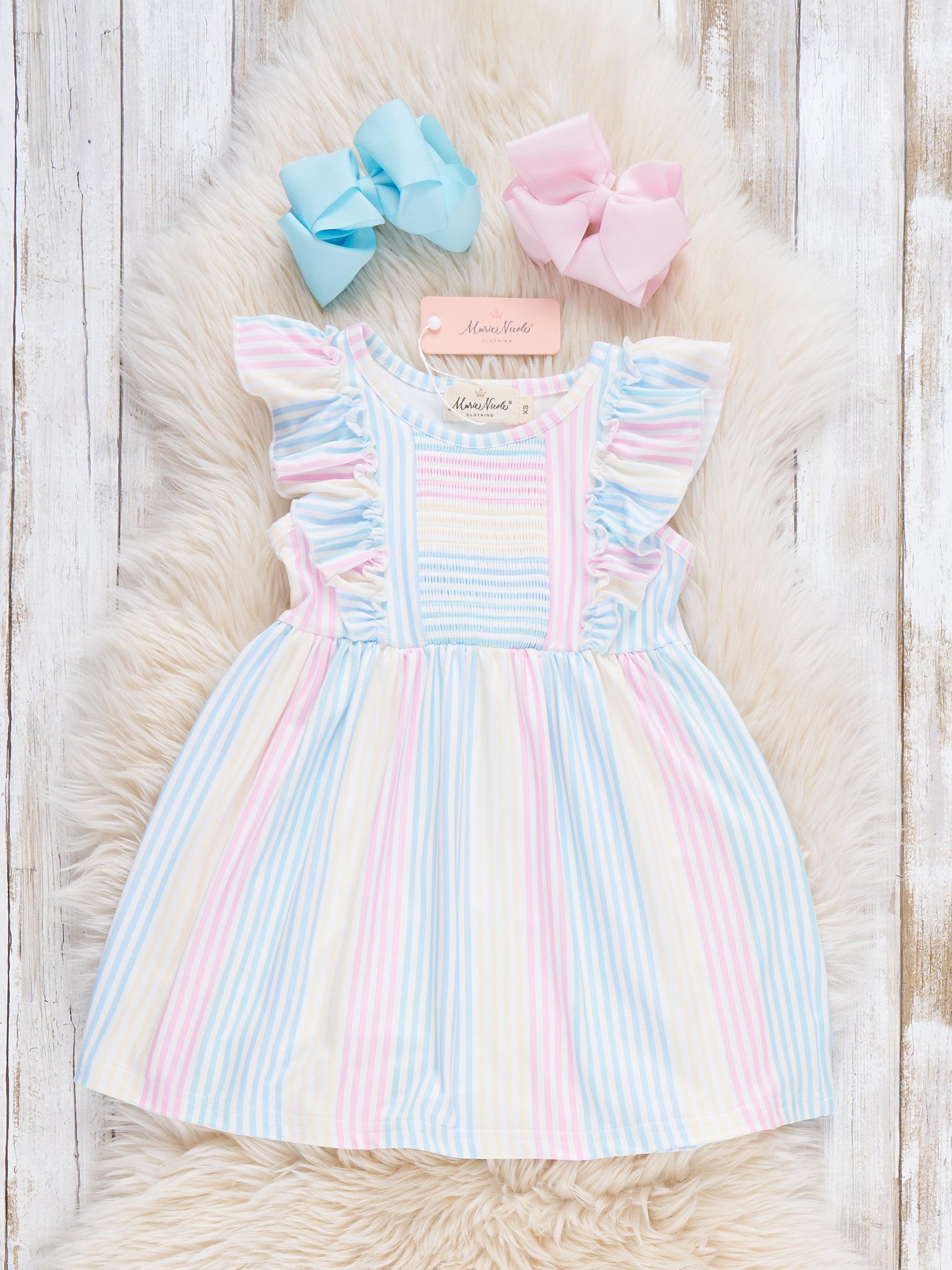 Sunshine Sway Striped Ruffle Dress by Marie Nicole Clothing. This dress is designed with vertical pastel stripes in soft rainbow hues, flutter ruffle sleeves, and a gathered A-line silhouette, creating a fresh, breezy look perfect for spring or summer occasions.
