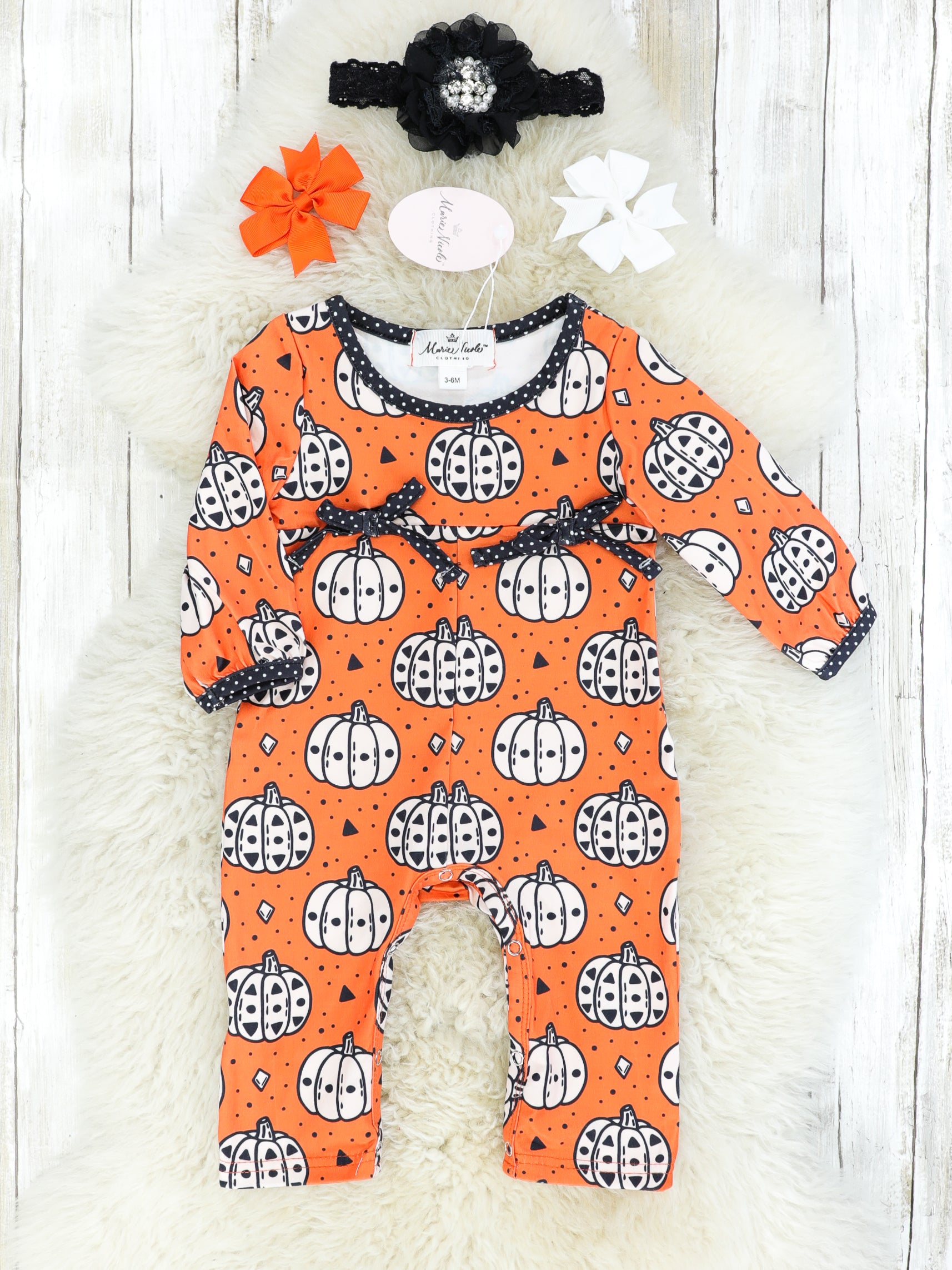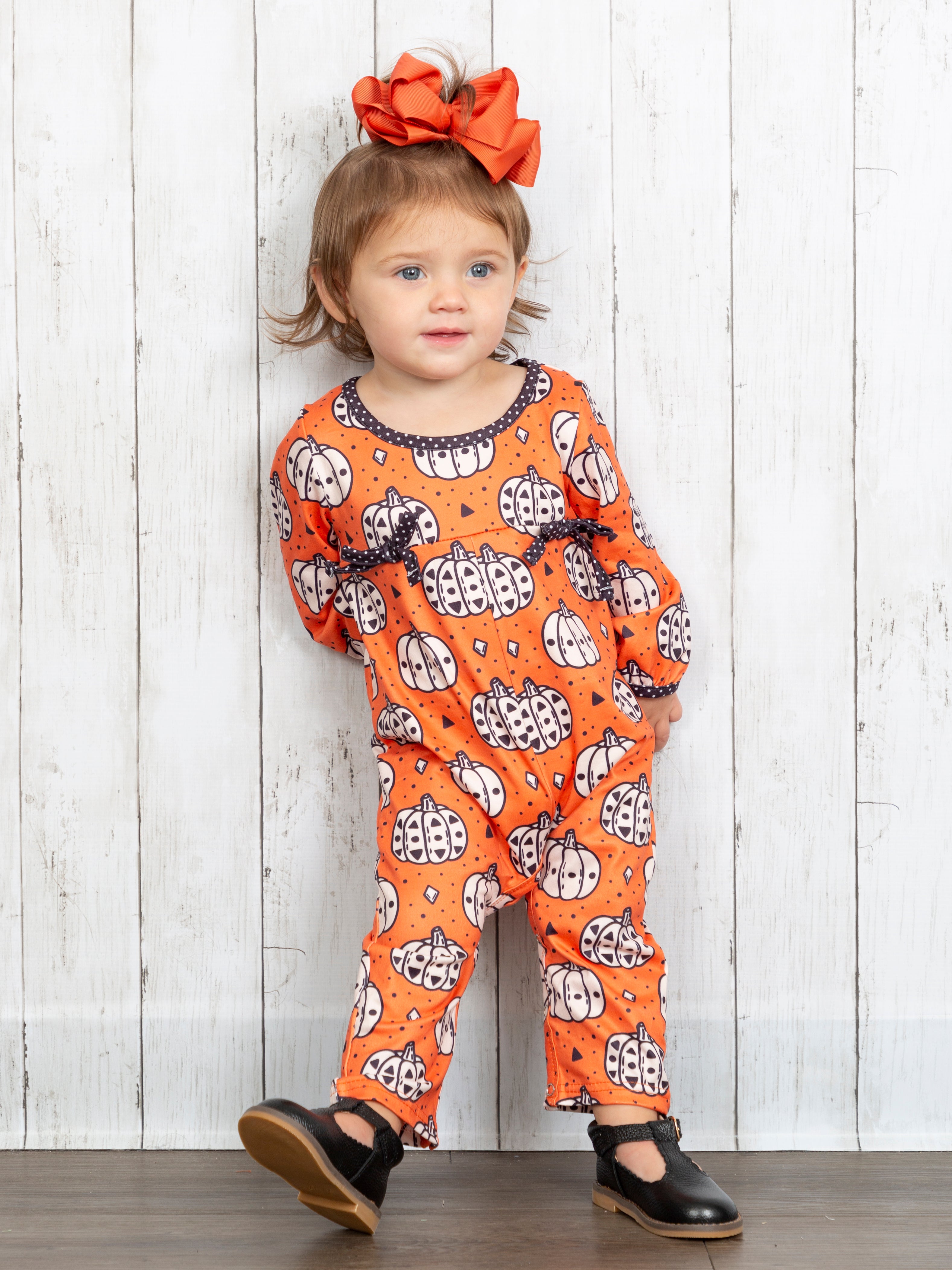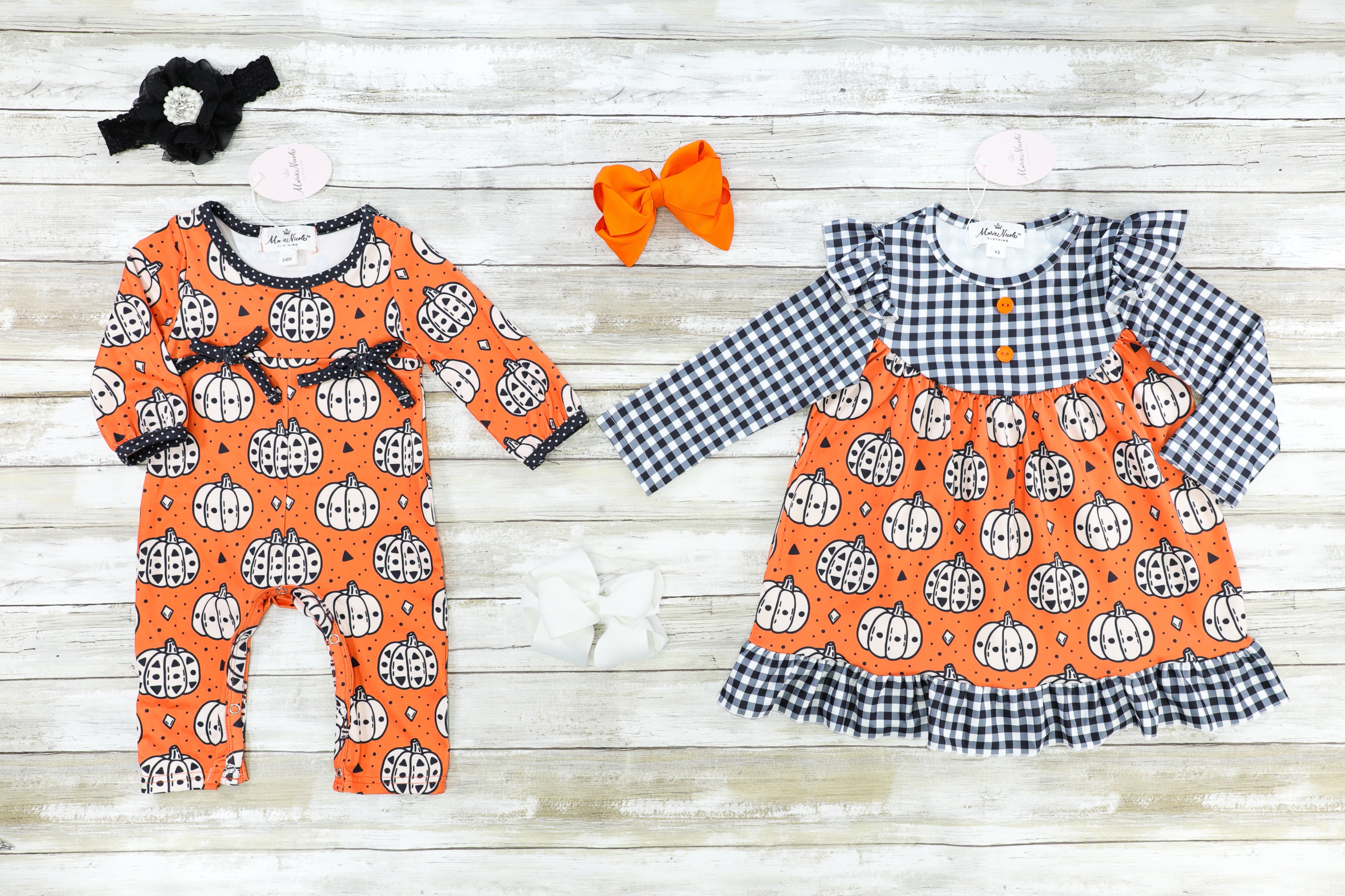 The sweetest sibling set for your little pumpkins! This romper features polka dots, nonfunctional buttons, & cream pumpkin details.