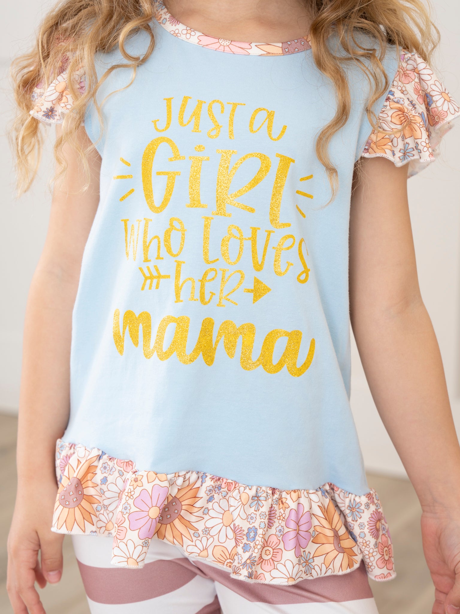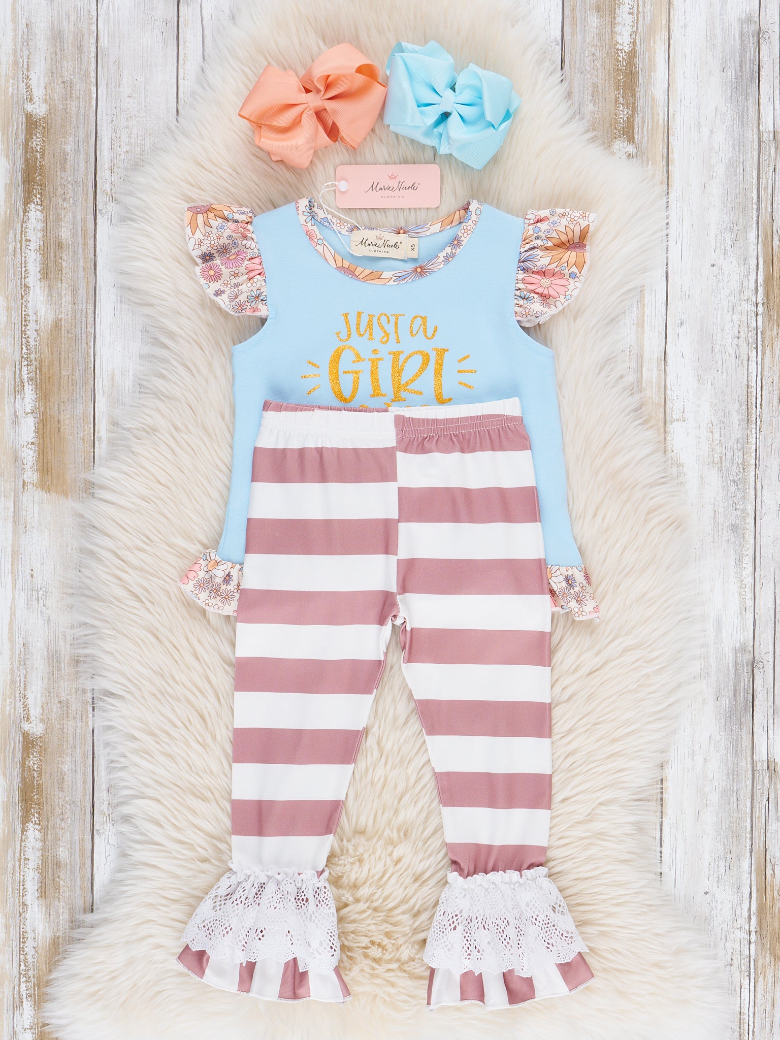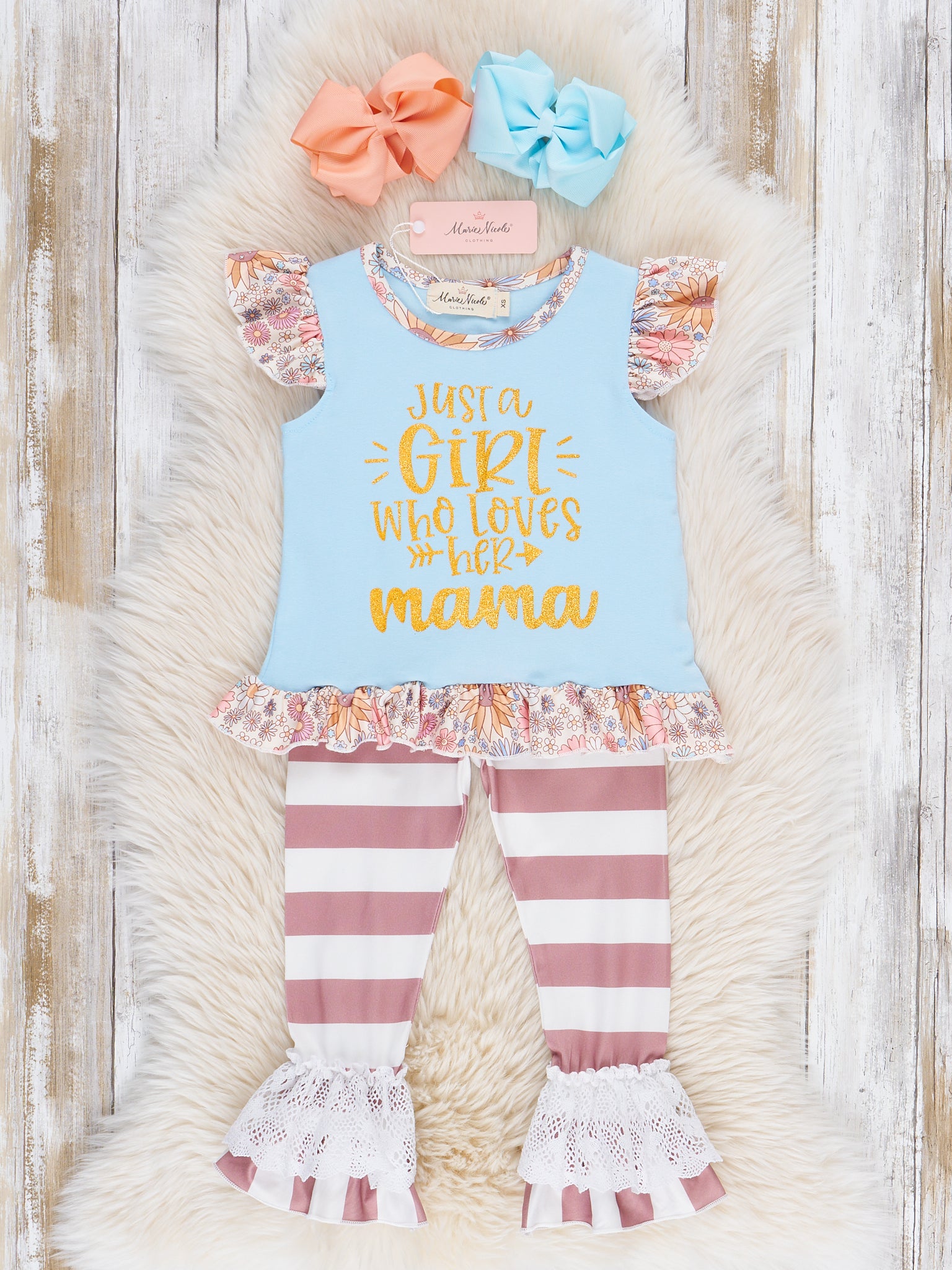 Get your little girl dressed in this adorable "Just a Girl Lacy Ruffle" outfit from Marie Nicole Clothing. The blue top features a playful ruffled hem and a cute "Just a Girl Who Loves Her Mama" graphic, while the mauve striped ruffled bell leggings complete the look. Perfect for a stylish sister set!
