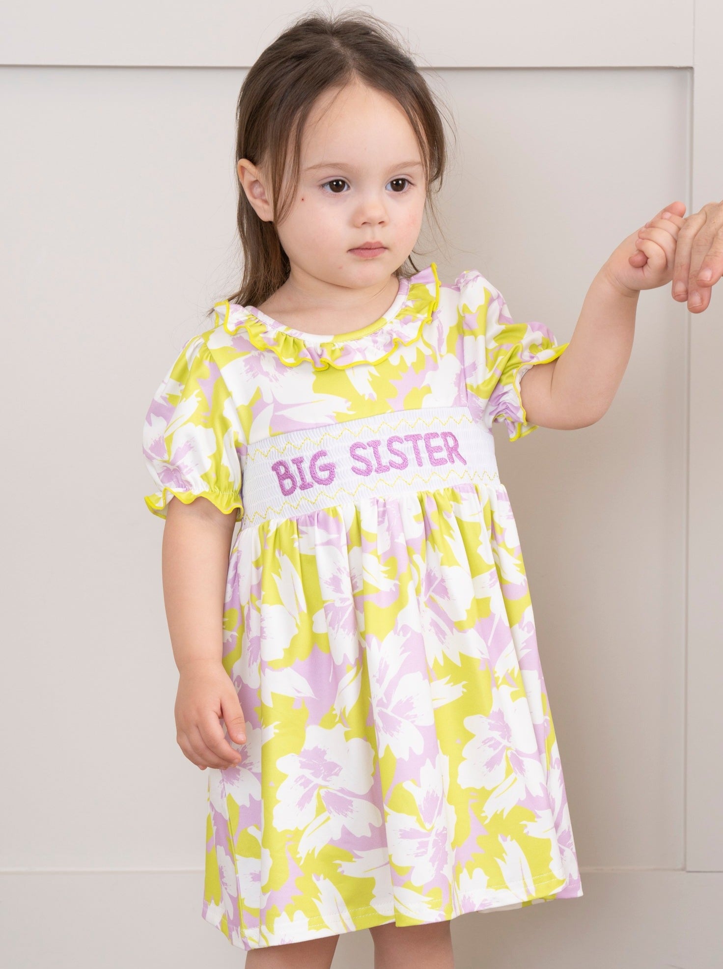 Spring is the season for sisters! The smocked design of the dressed boasts the Big Sister title and big beautiful flowers. Perfect for any spring calendar event, this dress will keep her looking and feeling cute all day long!