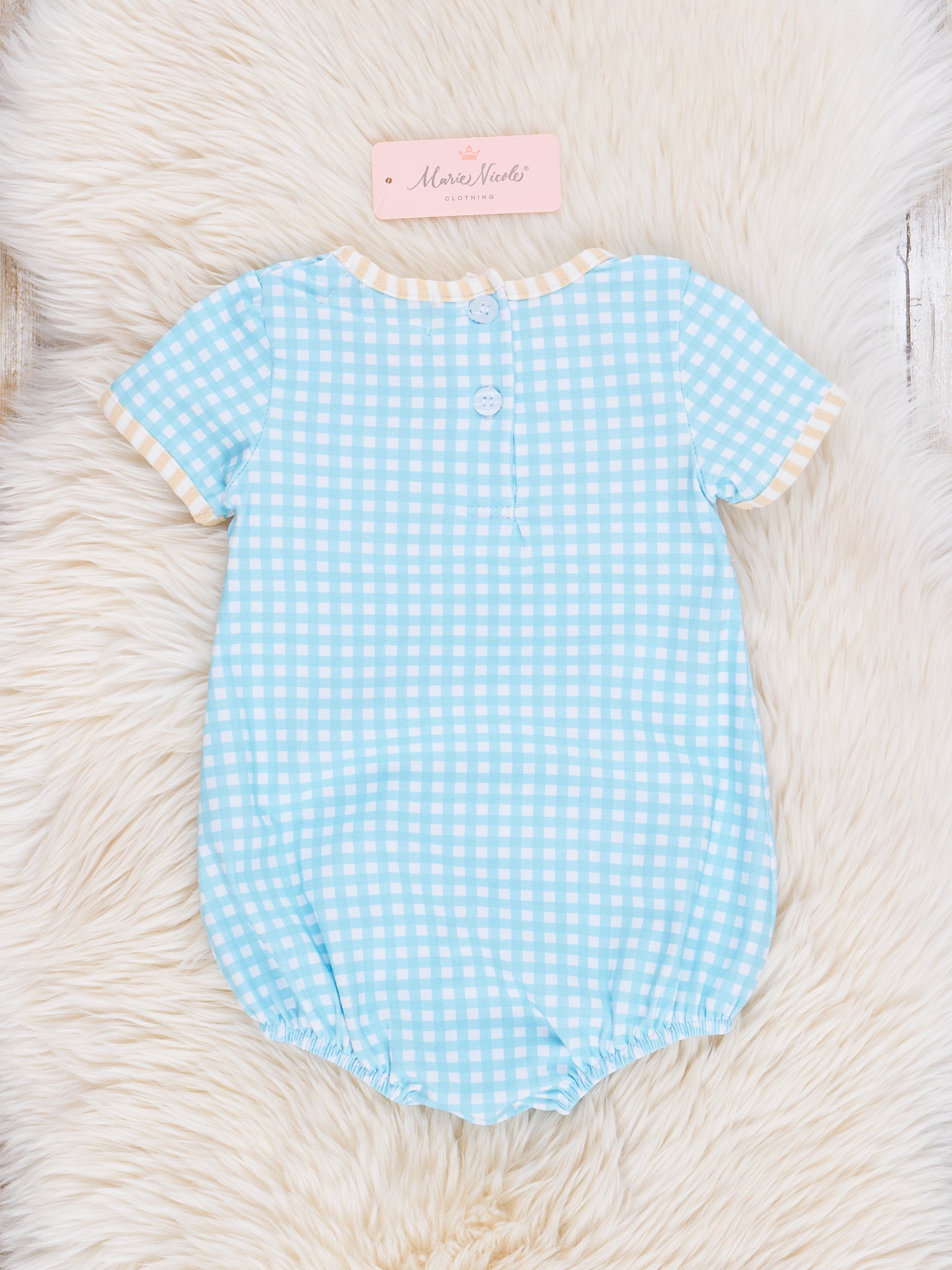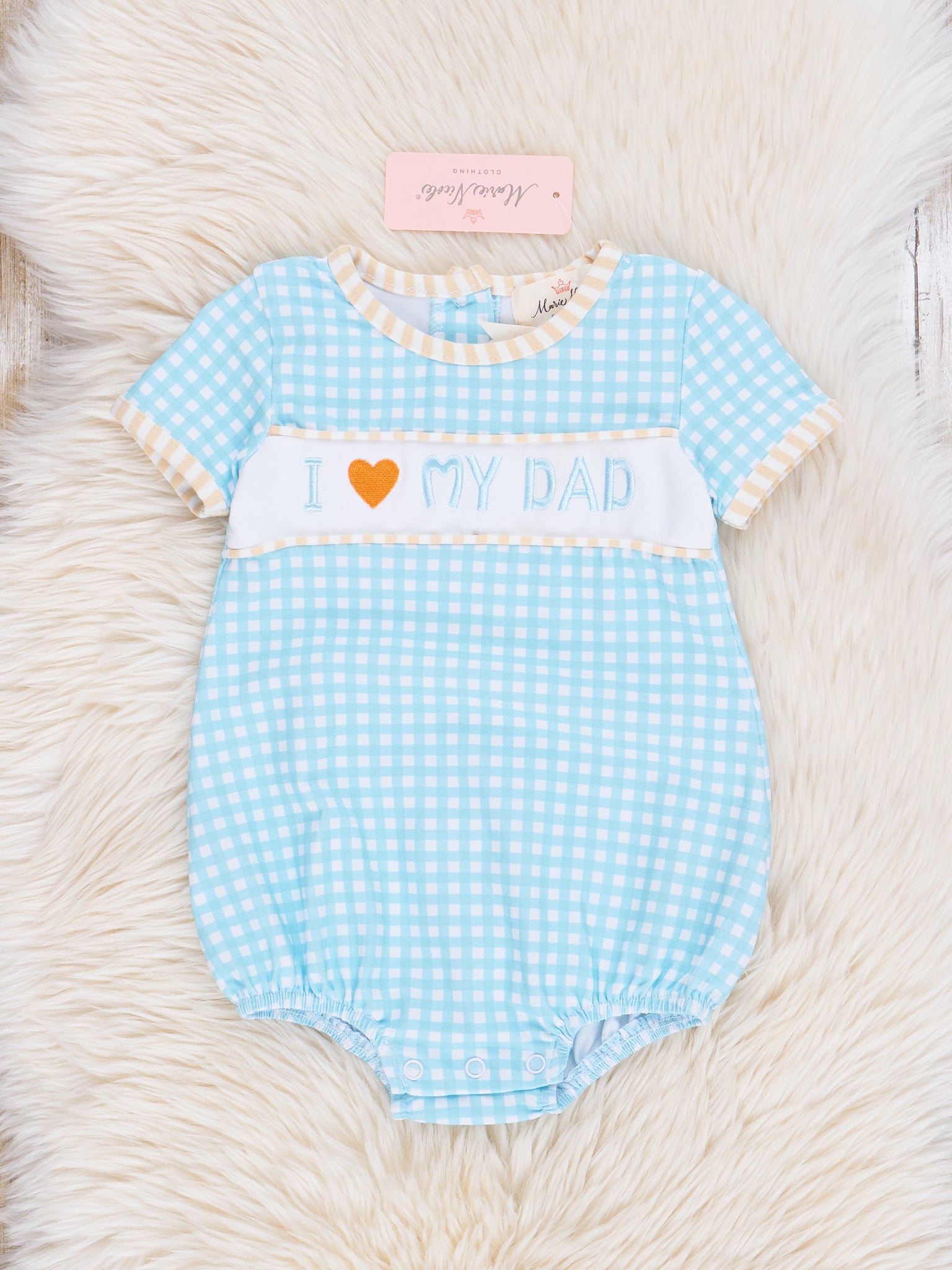 Dress your little dude in the Blue Gingham Dad Love Bubble. This charming romper bubble features classic blue gingham & a sweet embroidered "I ❤️ My Dad" detail. Perfect for family outings, this outfit shows that love runs in the family.