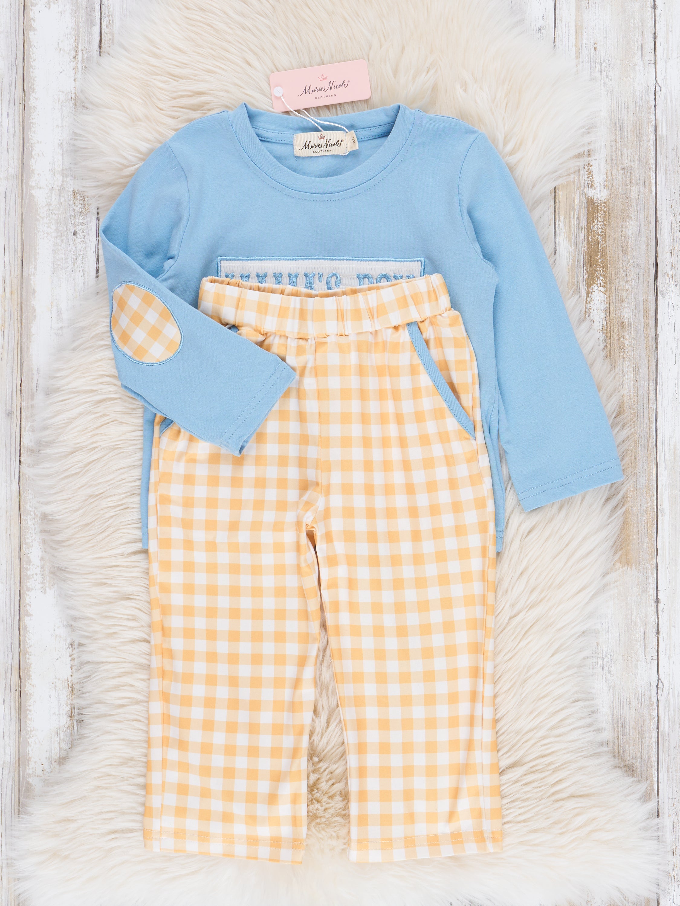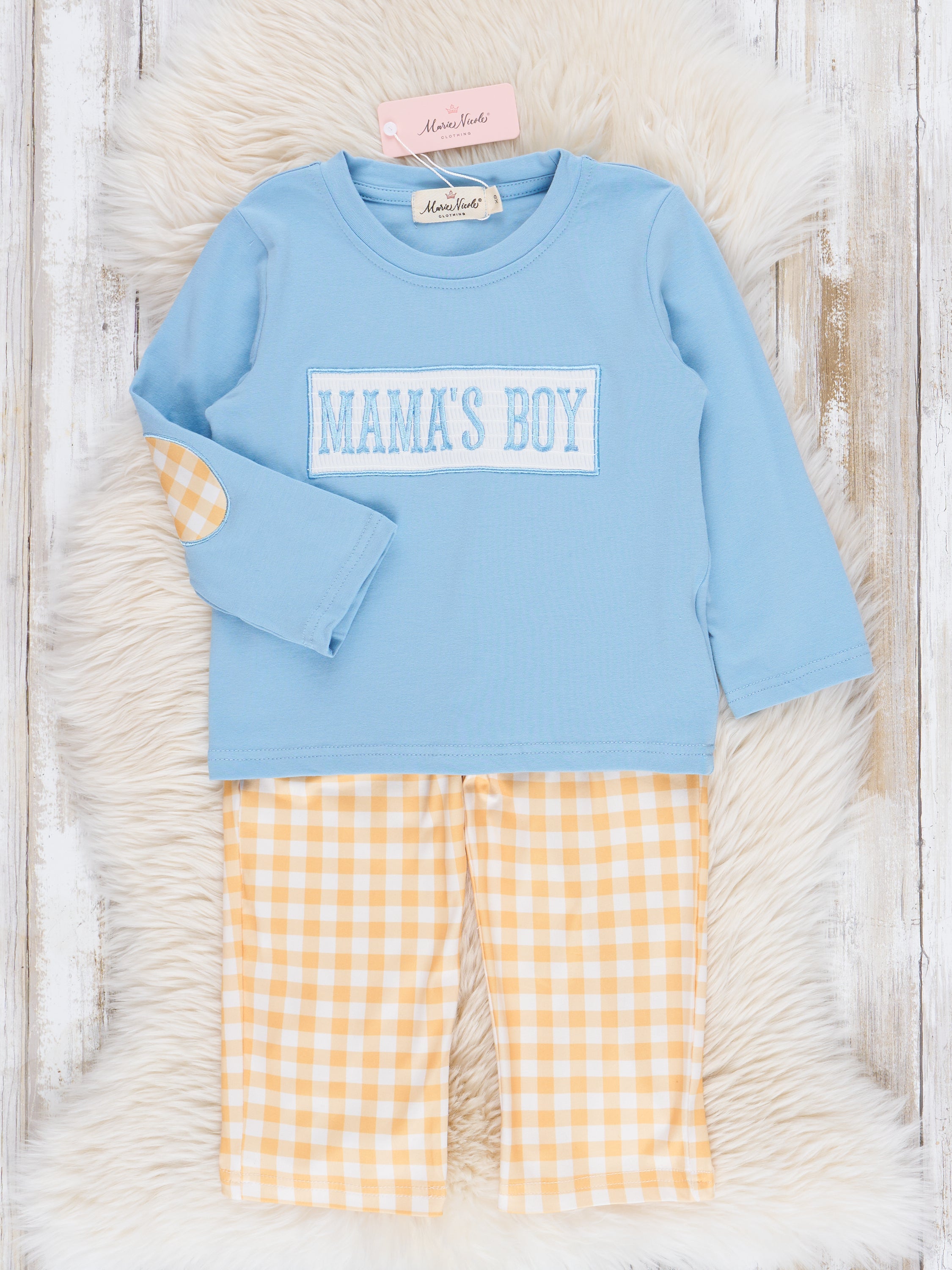 This sweet outfit boasts a blue shirt with embroidered "mama's boy" over smocking & elbow patches, paired with yellow gingham pants. It's perfect for your little one, who will look both stylish and adorable. Shop the matching romper!