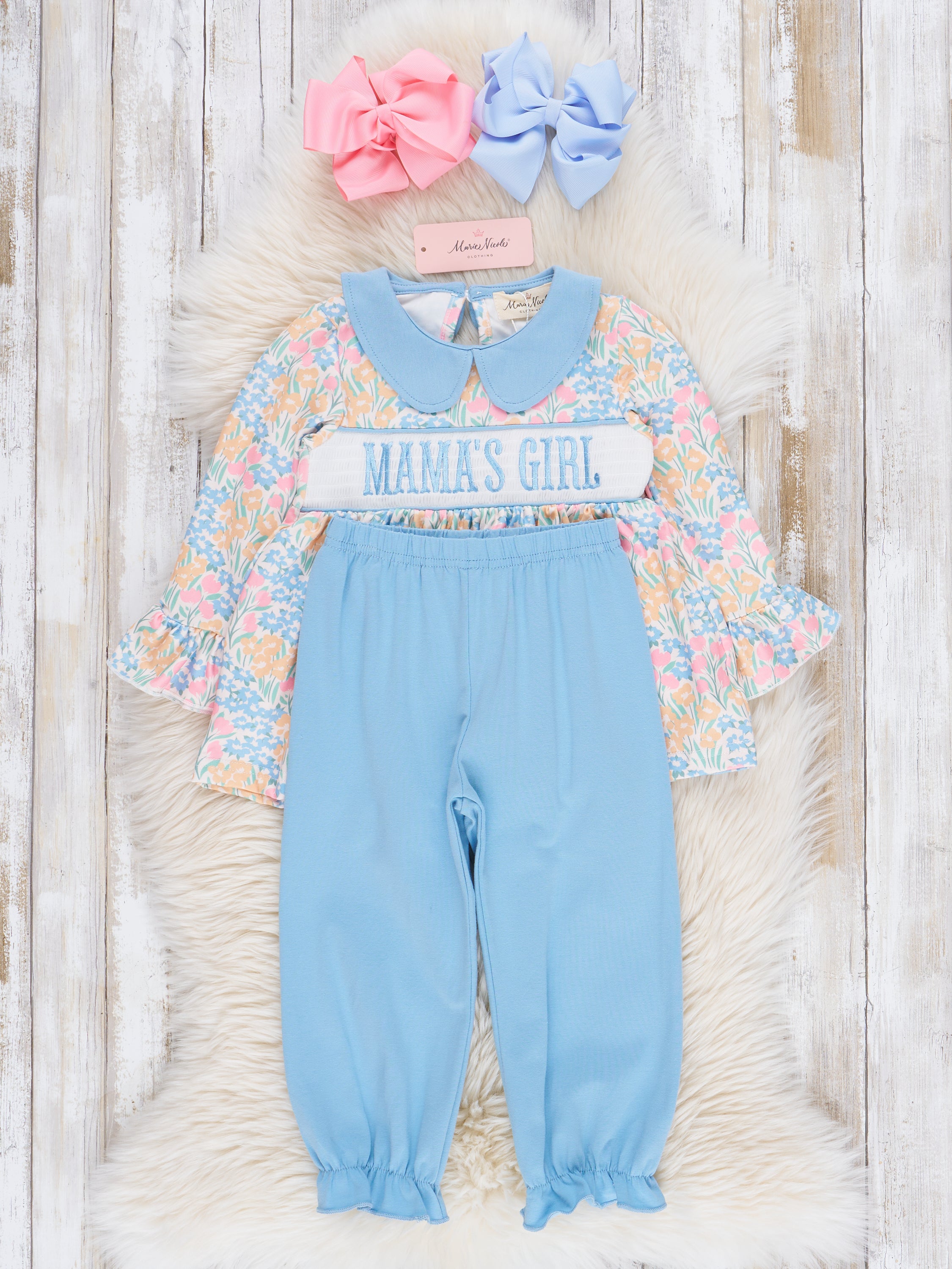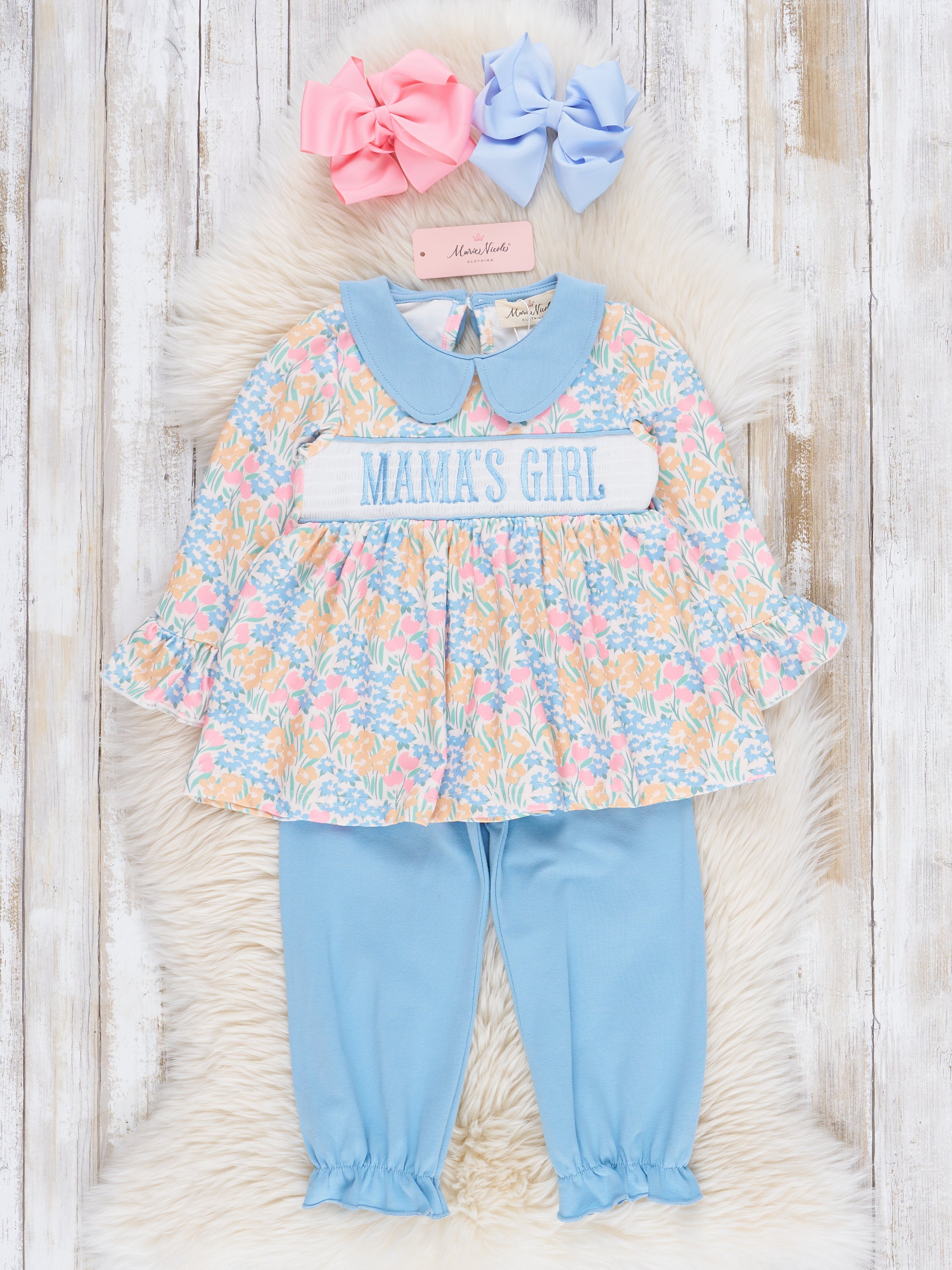 This sweet outfit boasts a blue & yellow floral pattern, embroidered "mama's girl" over smocking with blue peter pan collar & matching pants. It's perfect for your little one, who will look both stylish and adorable. Shop the matching set!
