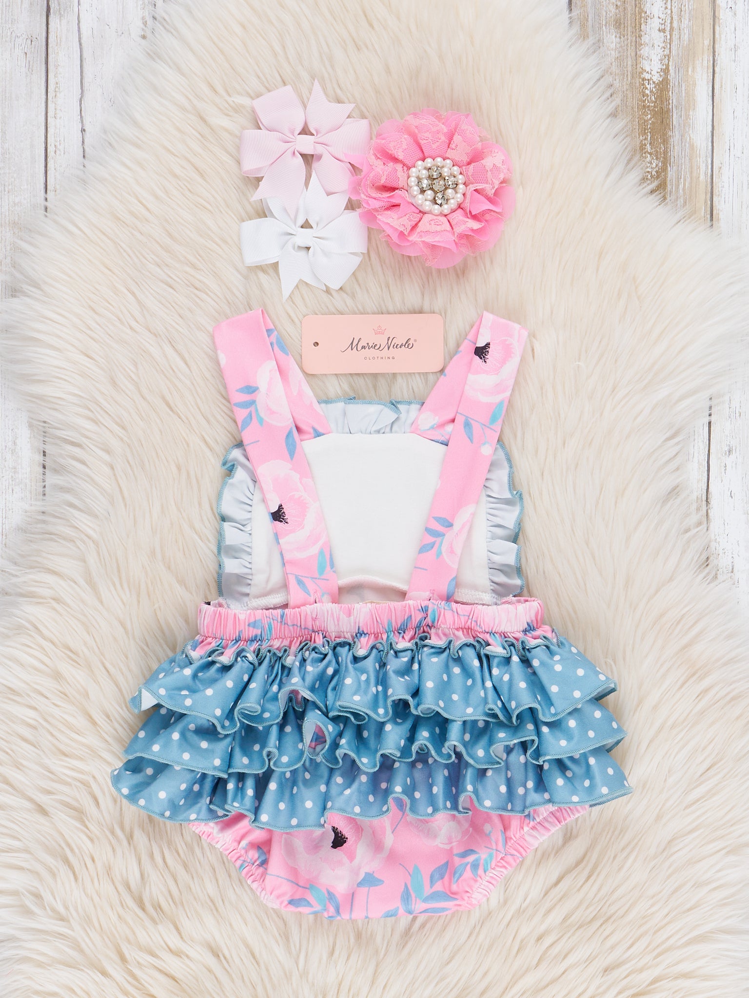 Get ready for spring with the Daddy's Girl Rose Garden Ruffle Bubble! This girls bubble from Marie Nicole Clothing is perfect for a sibling set, featuring a printed "Daddy's Girl" design and a playful rose garden print. The blue ruffle bottom adds a classically charming touch.