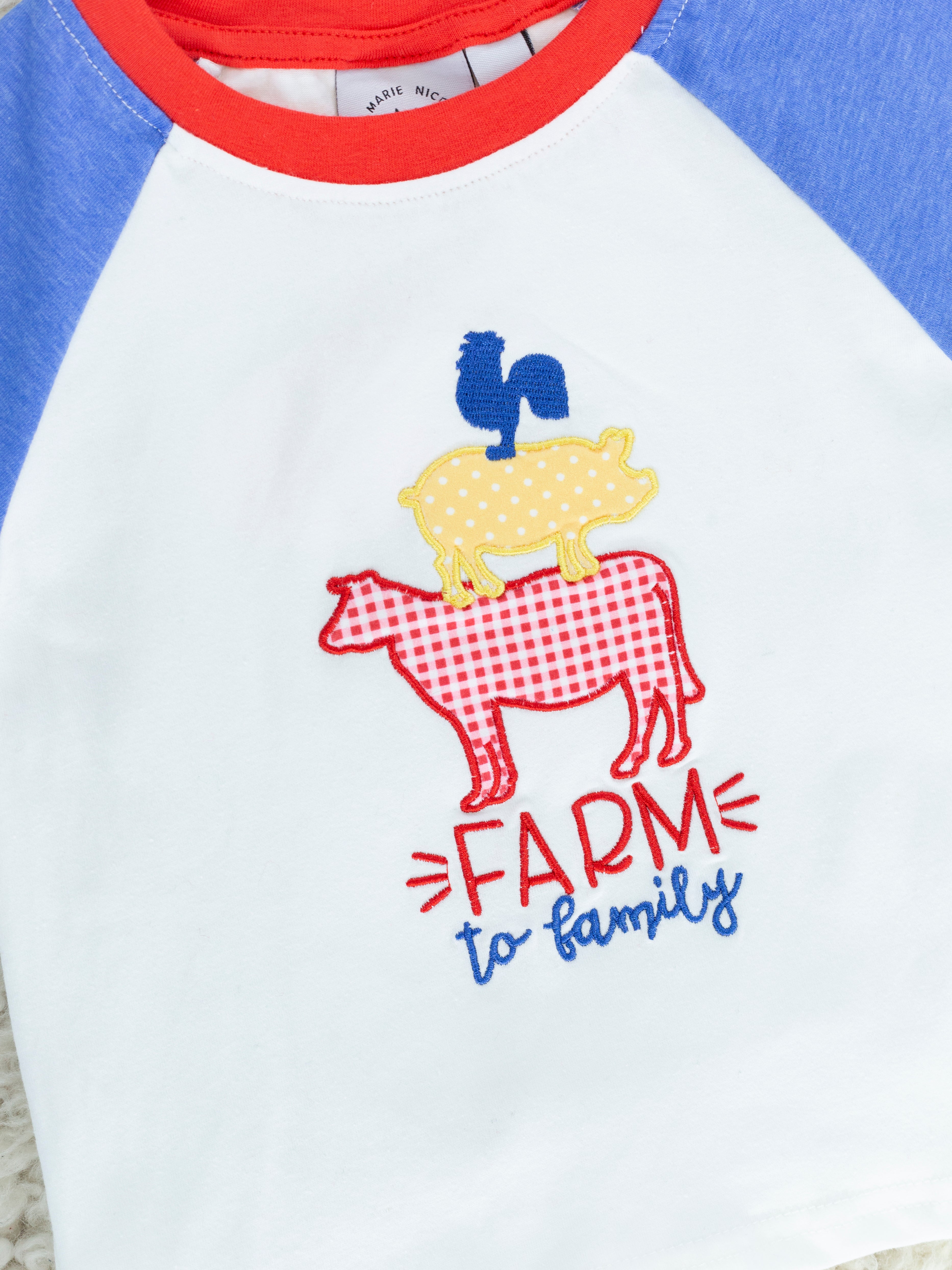 This precious shirt is legenDAIRY! This shirt features farm animal appliqués, blue raglan sleeves, & red trim.