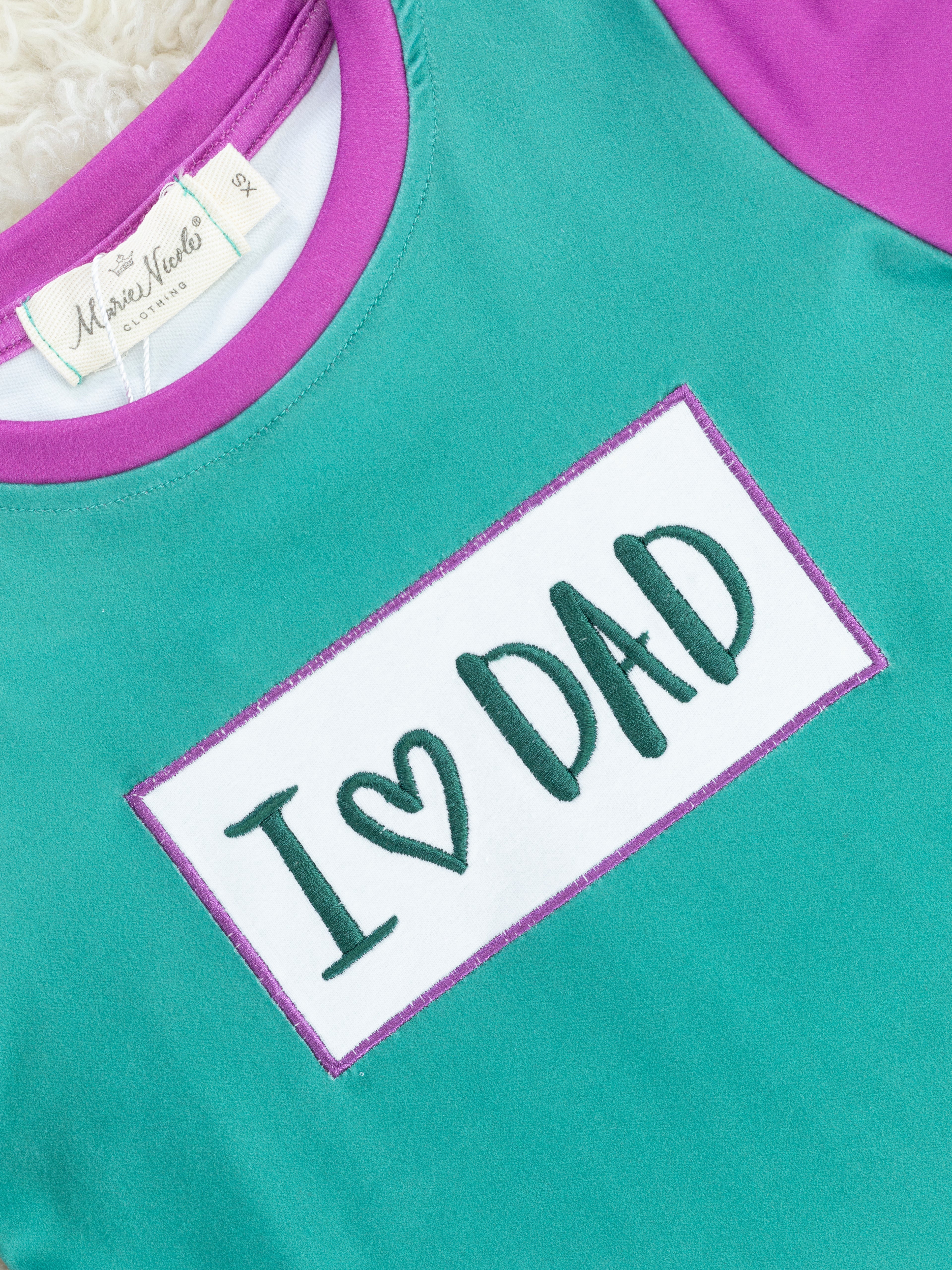 This sweet brother set is perfect for Father's day! This green shirt features an embroidered "I Love Dad" design, purple trim, & purple raglan sleeves.