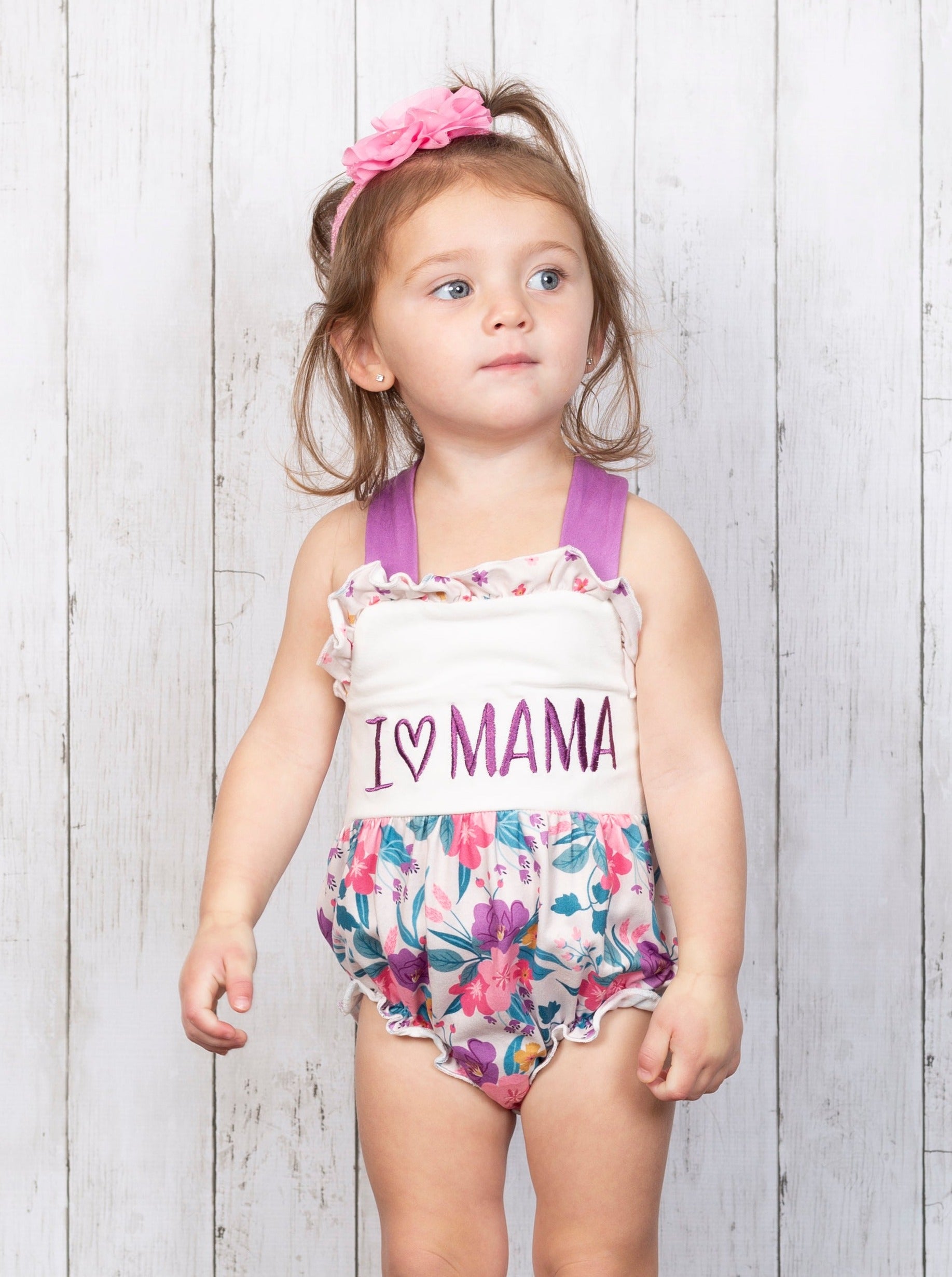 The"I Love Mama" Floral Bubble for your mama's girl! This bubble features gorgeous purple florals, an embroidered "I Love Mama", flutter sleeves, ruffle trim, & adjustable straps. So lovely!