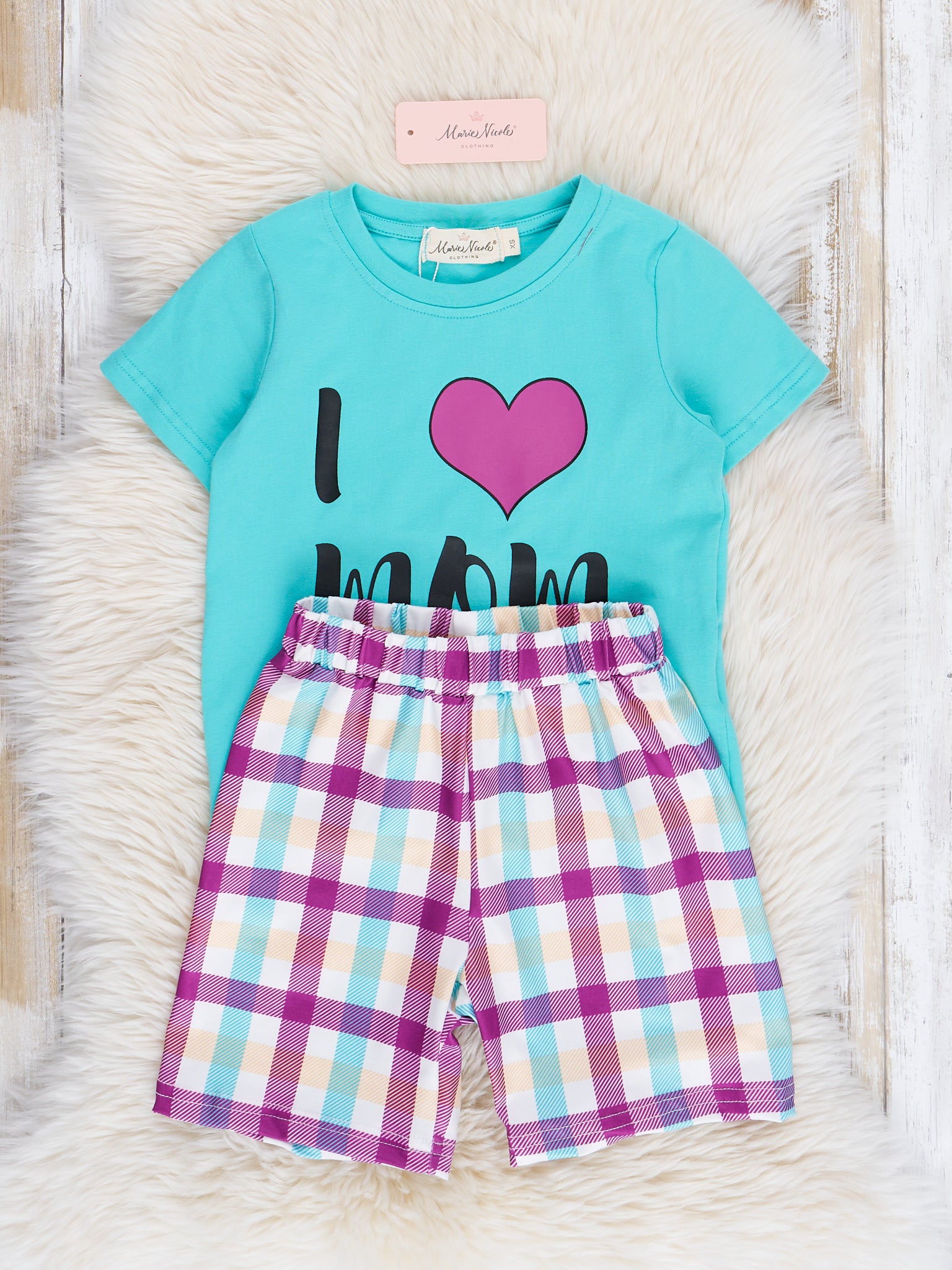 Give mom her flowers with our Turquoise & Purple Mom Love Outfit. With the sweet message "I ♥︎ MOM" featured on a bright turquoise top paired with plaid shorts, this outfit is perfect for warm weather outings or family photos. Plus your littles can match in style while expressing their love for mom!