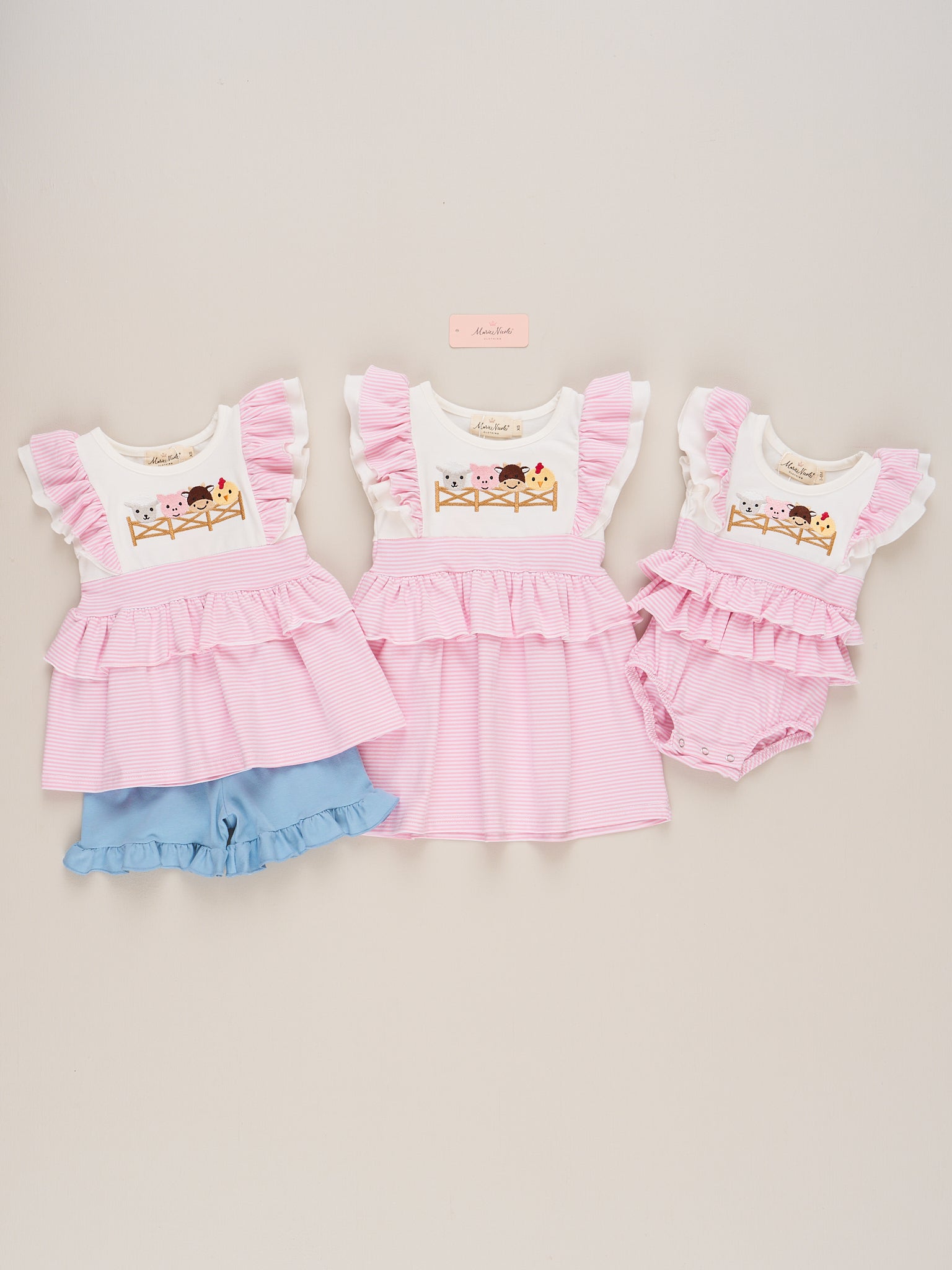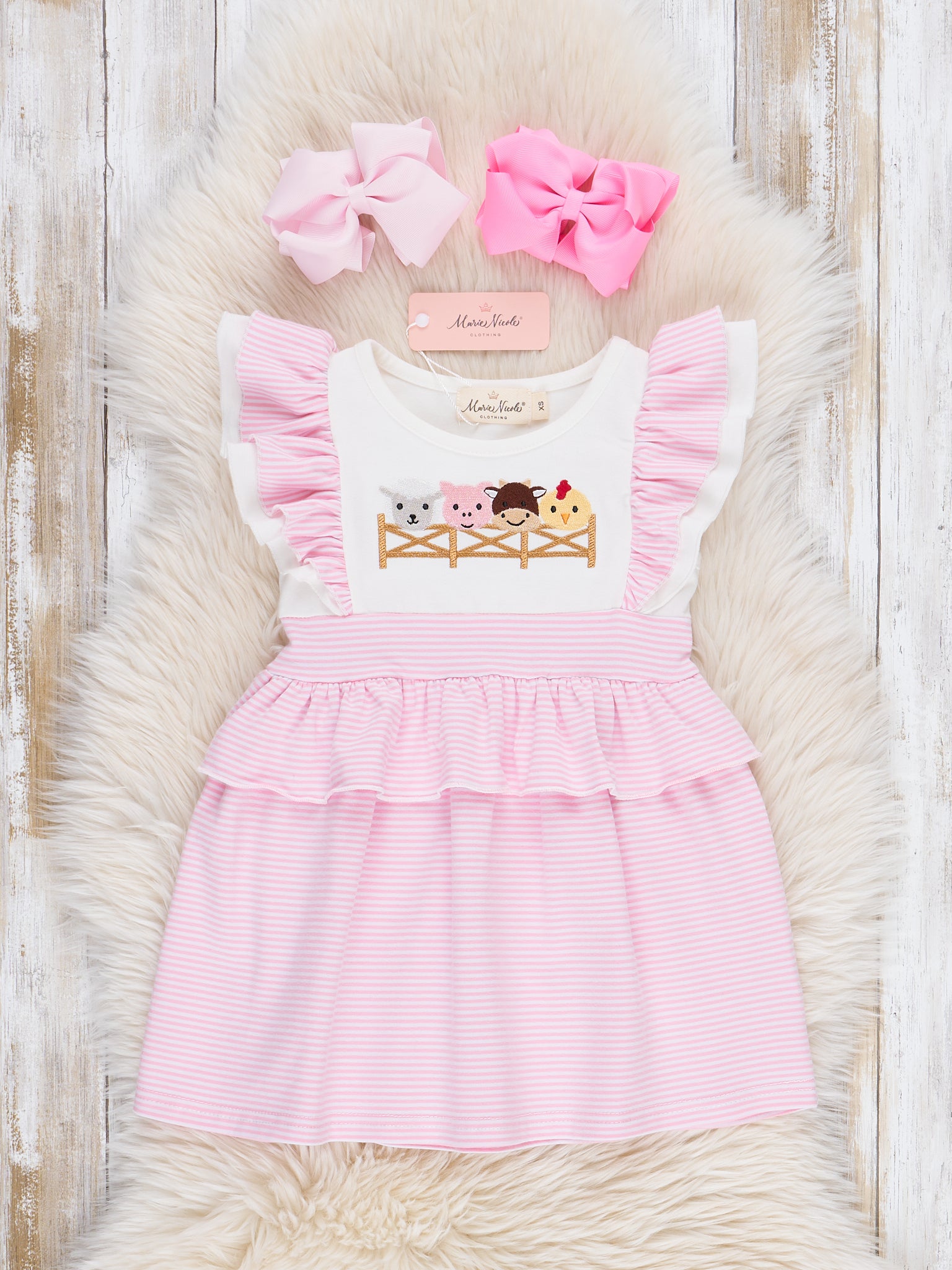 Your little one will be the cutest on the farm in the Embroidered Baby Farm Friends Ruffle Dress! This adorable dress from Marie Nicole Clothing features beautifully embroidered barnyard buddies—sheep, cow, pig, and chick—across the chest. Soft ruffle accents on the sleeves and waist add an extra dose of charm.