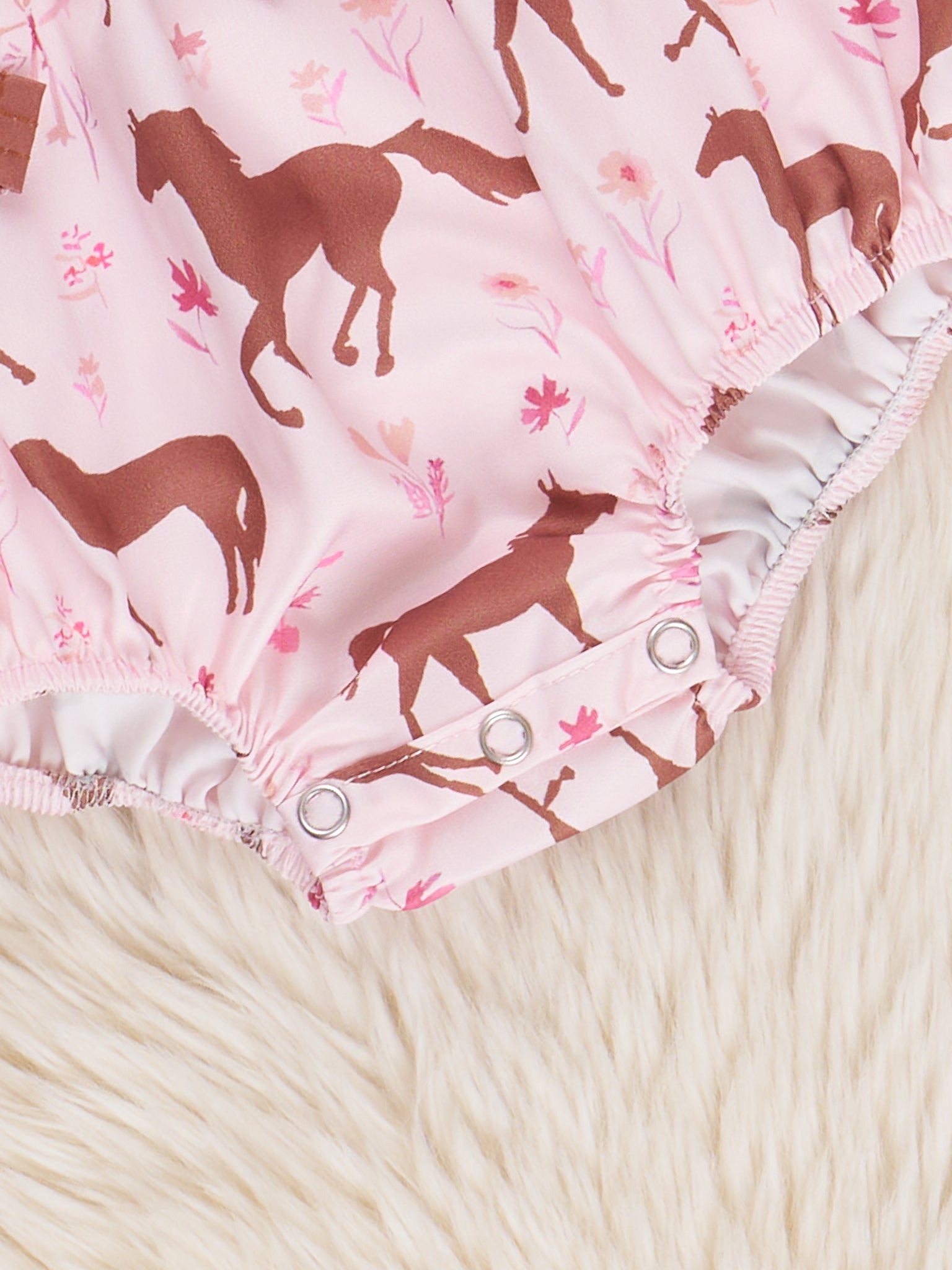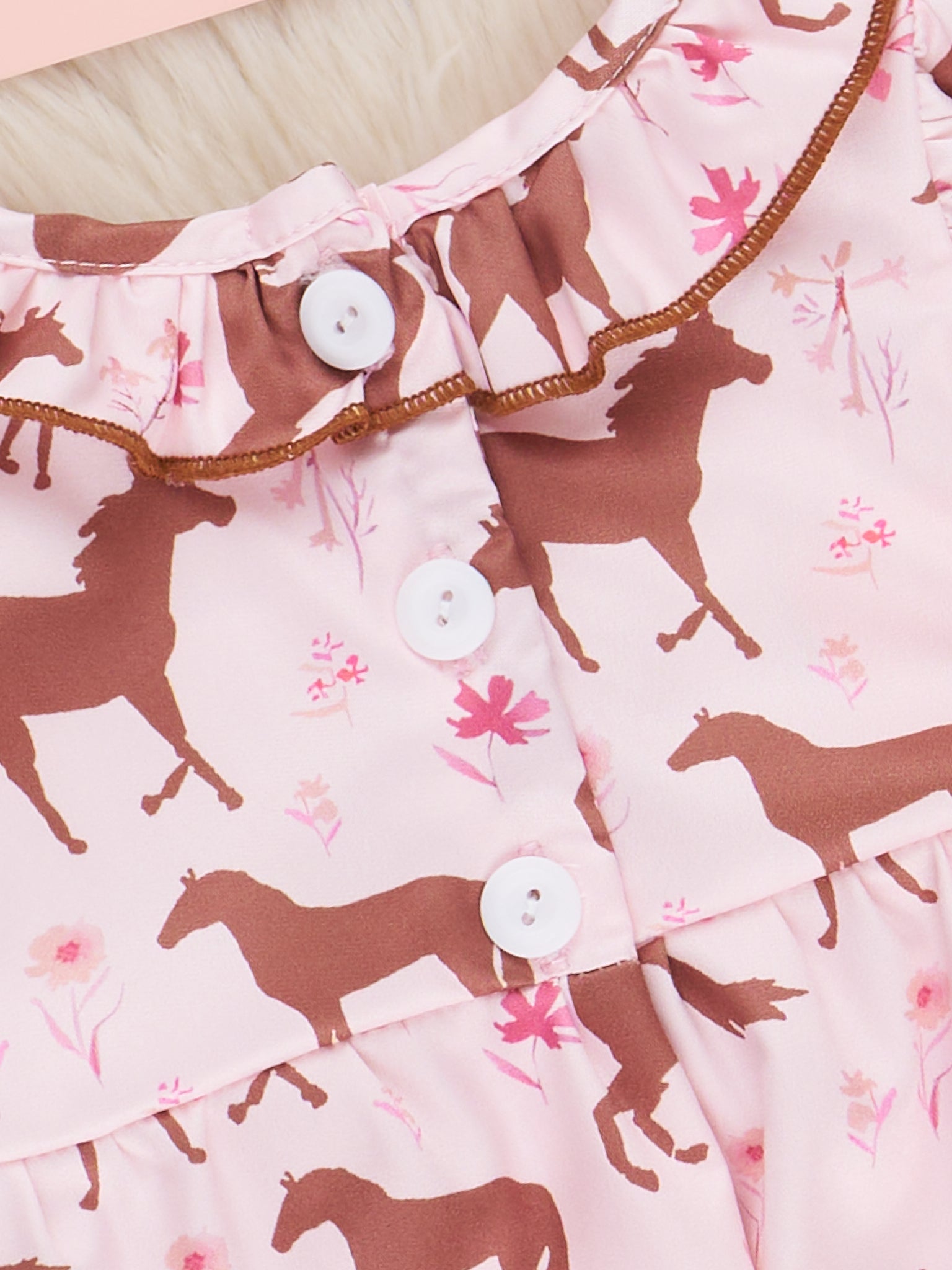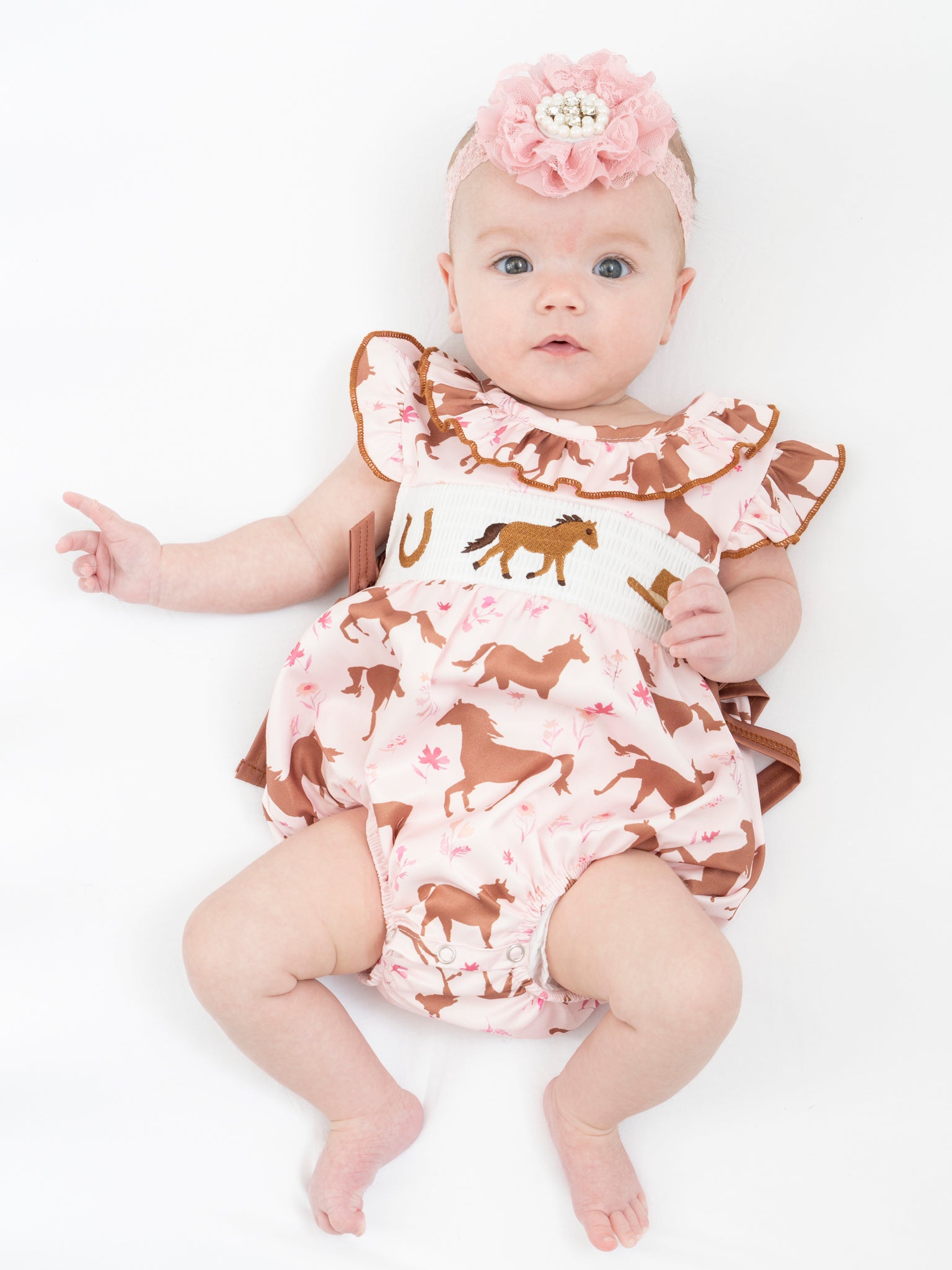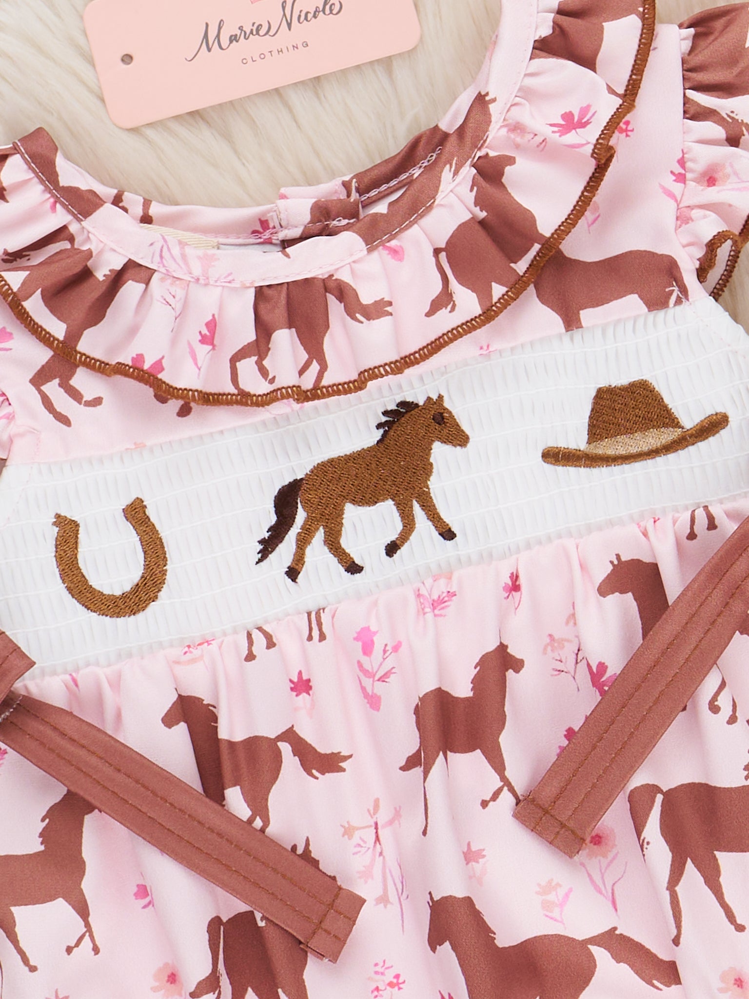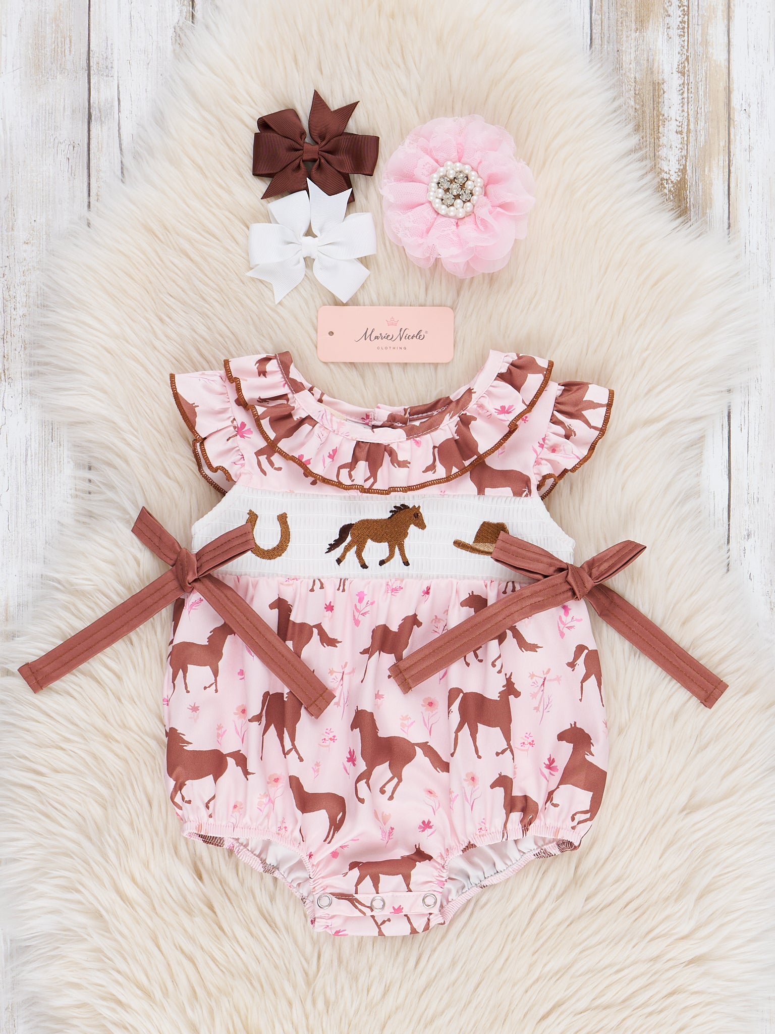 The perfect sibling set for your kiddos to stirrup some trouble! This pink bubble features smocking with embroidered horse details, a round ruffle neckline, brown bow details, a darling horse design, & buttons at the nape of the neck.