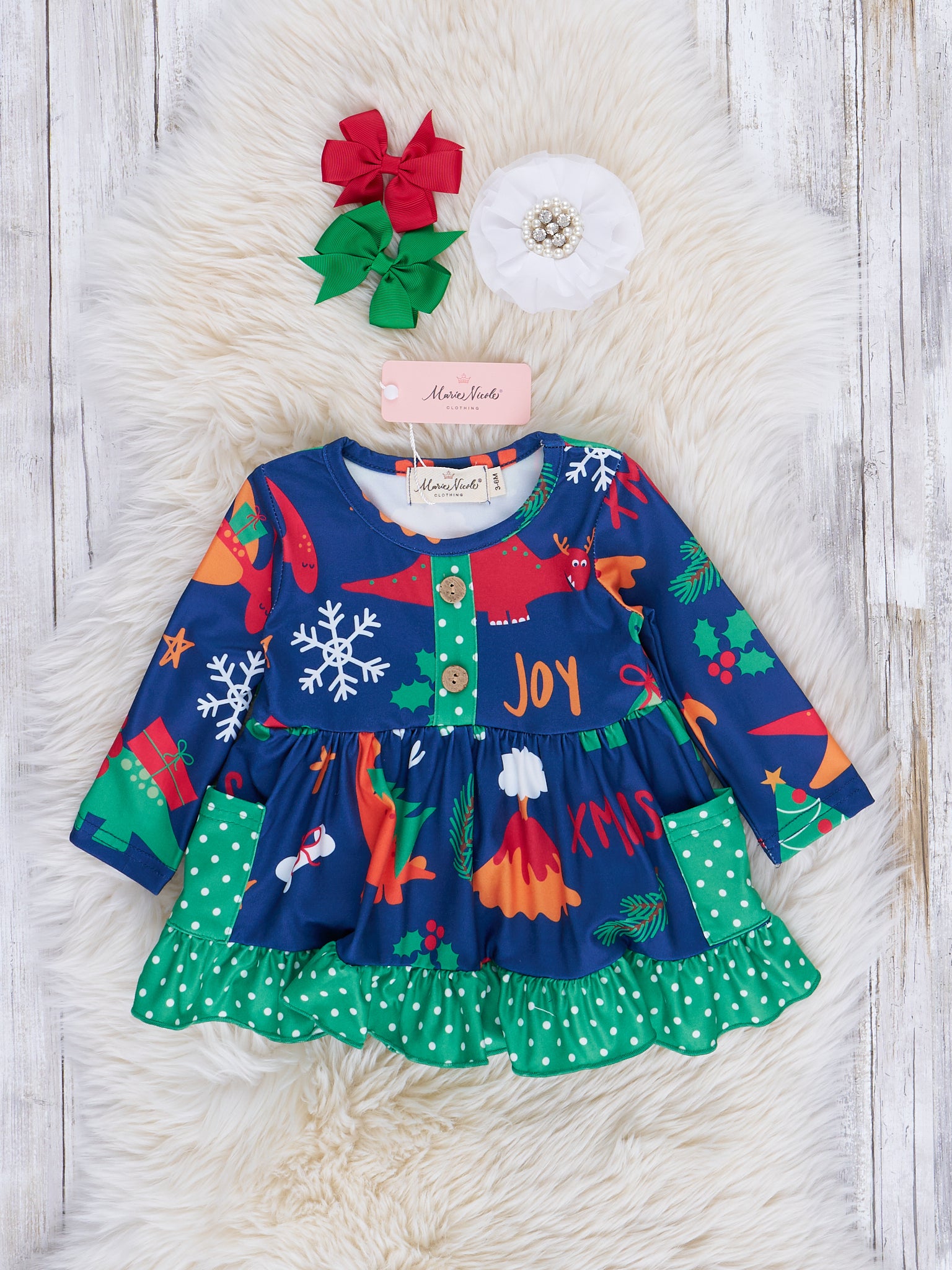 Green Holiday Dots & Dinosaurs Ruffle Romper