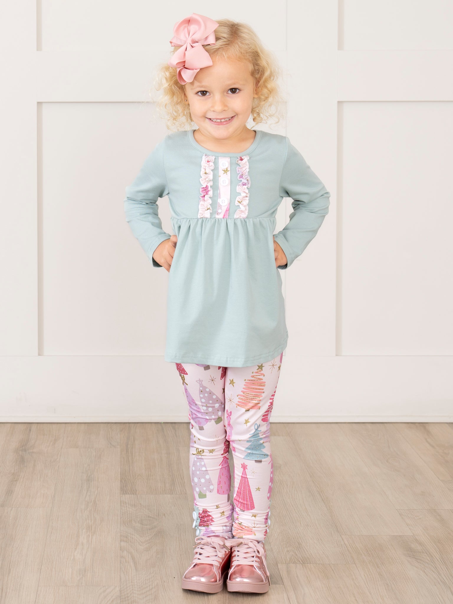 Soft Mint & Pink Christmas Trees Ruffle Outfit