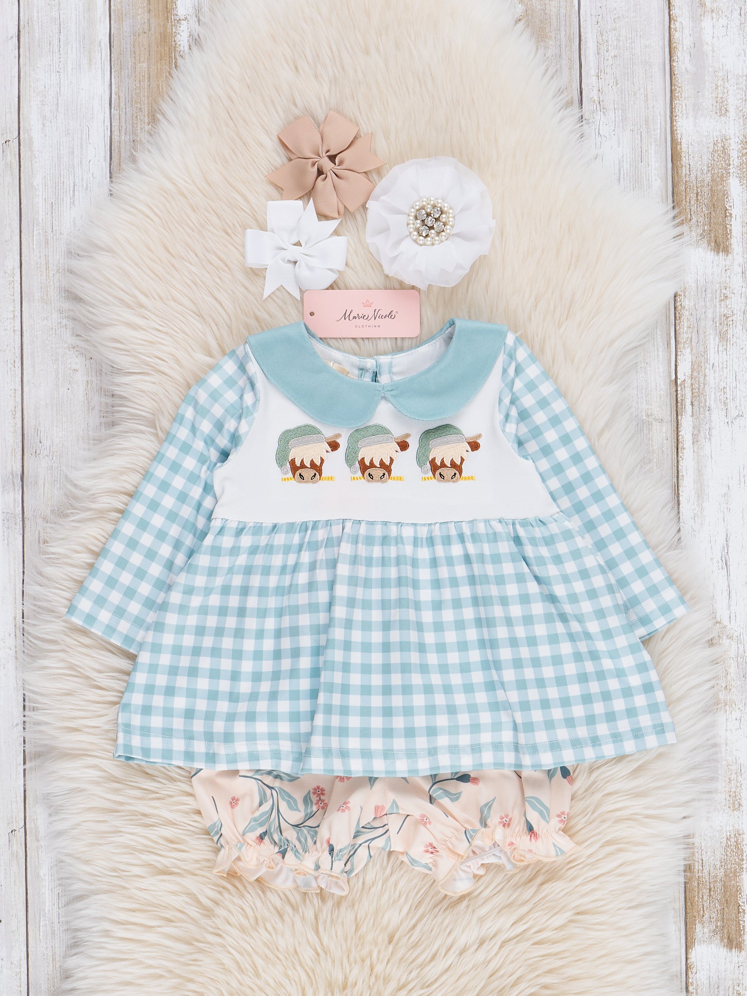 Embroidered Christmas Cow Gingham Bloomers Outfit