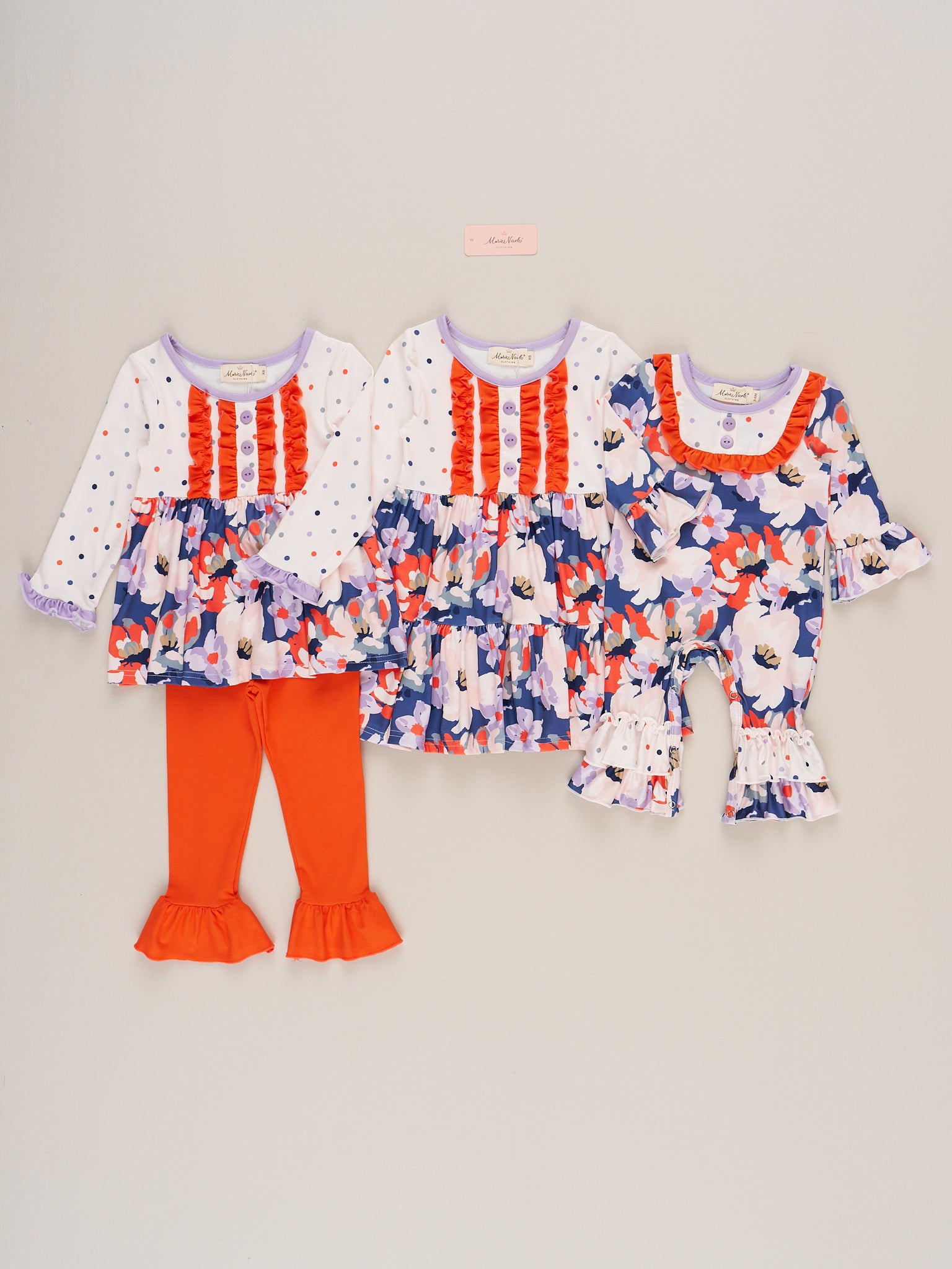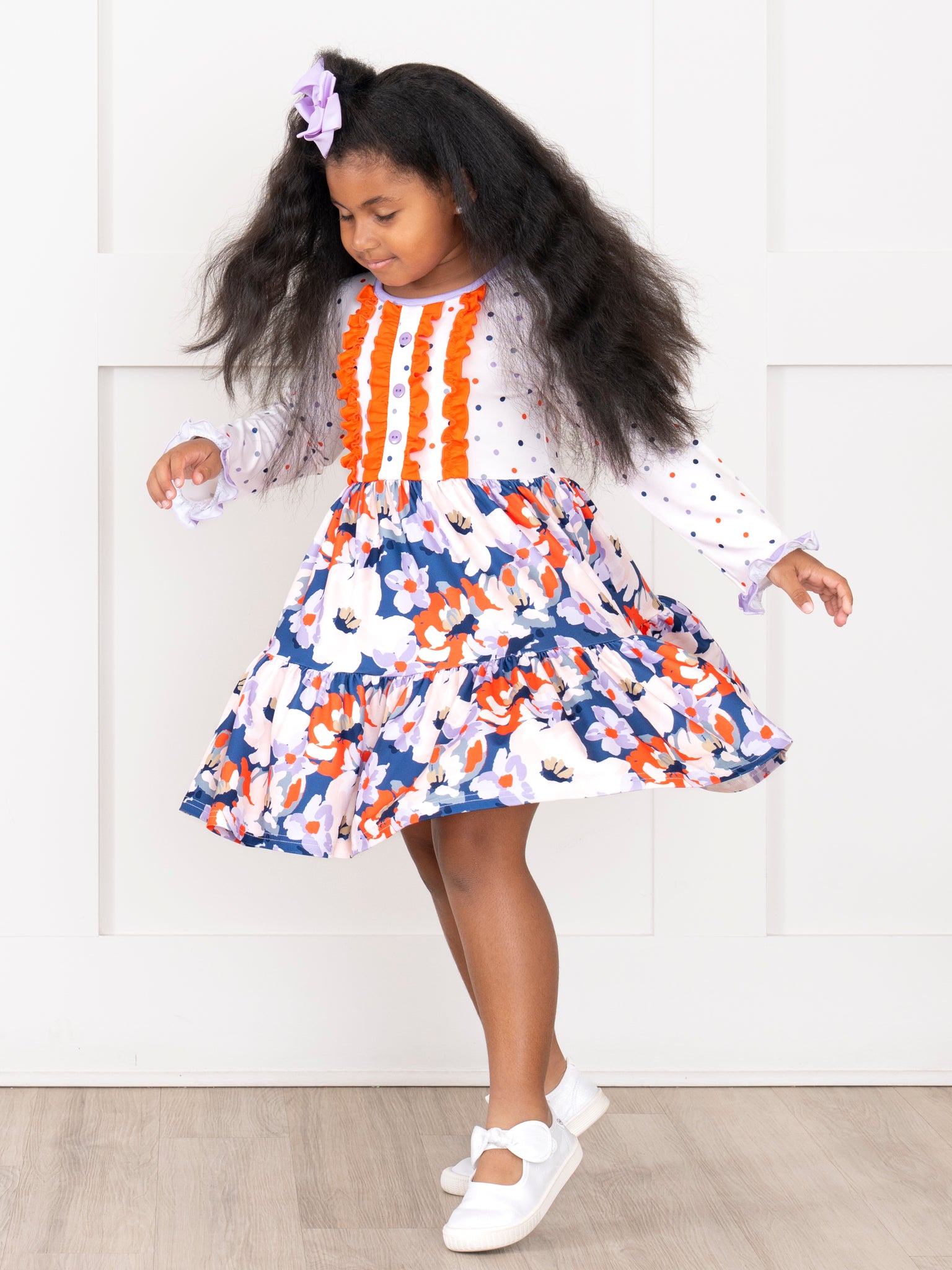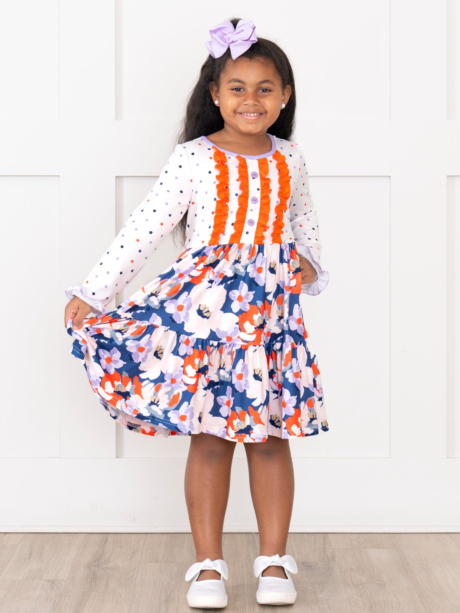 The Bloom & Dots Ruffle Dress is a sweet and playful pick for bright days and blooming adventures. Featuring a charming mix of floral blooms and classic polka dots, this dress from Marie Nicole Clothing is finished with soft ruffle details for added sweetness. Lightweight, breathable, and full of cheerful charm, it’s perfect for twirling through playdates, parties, or any day she wants to shine.
