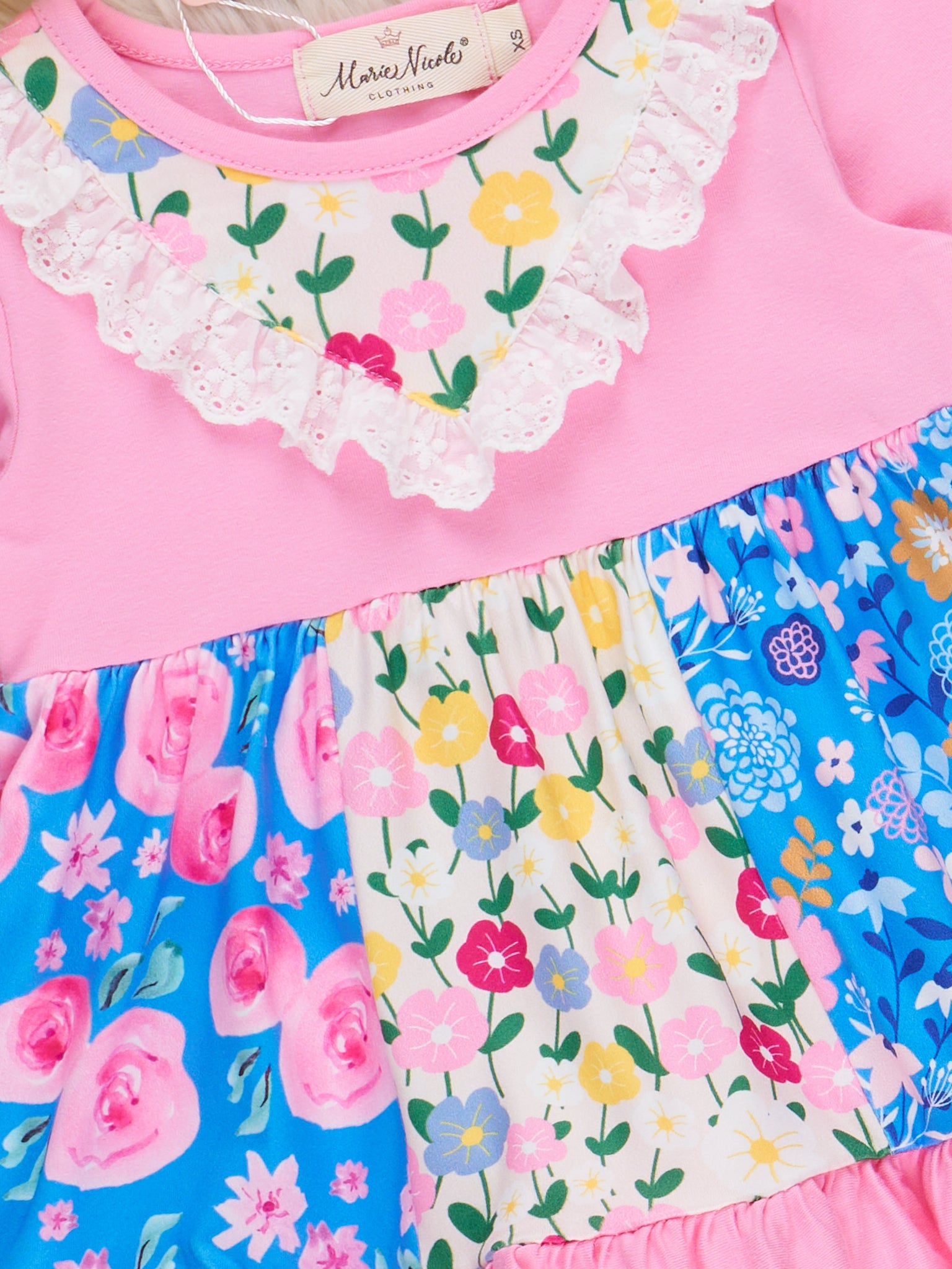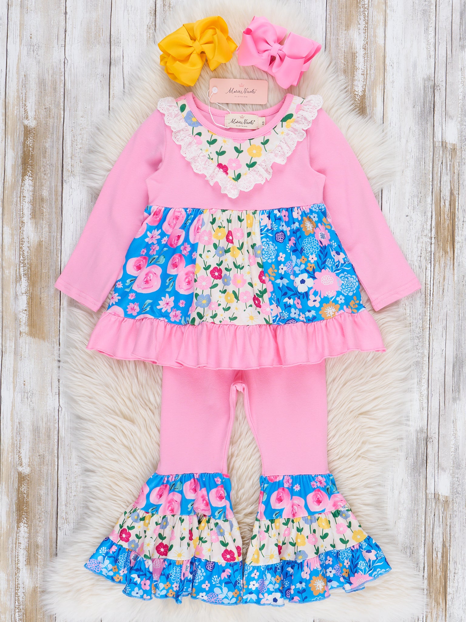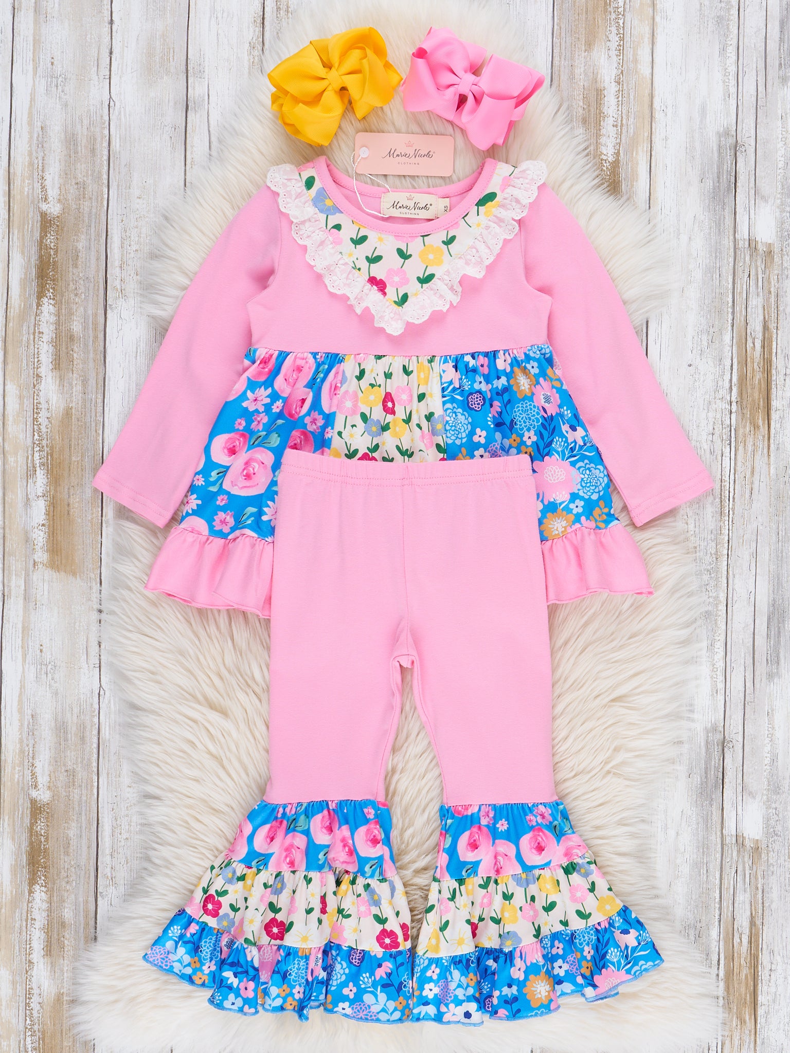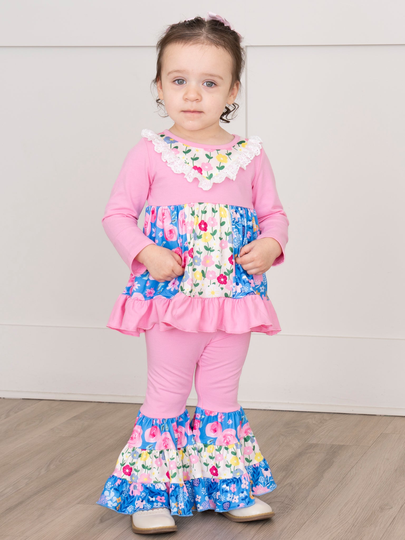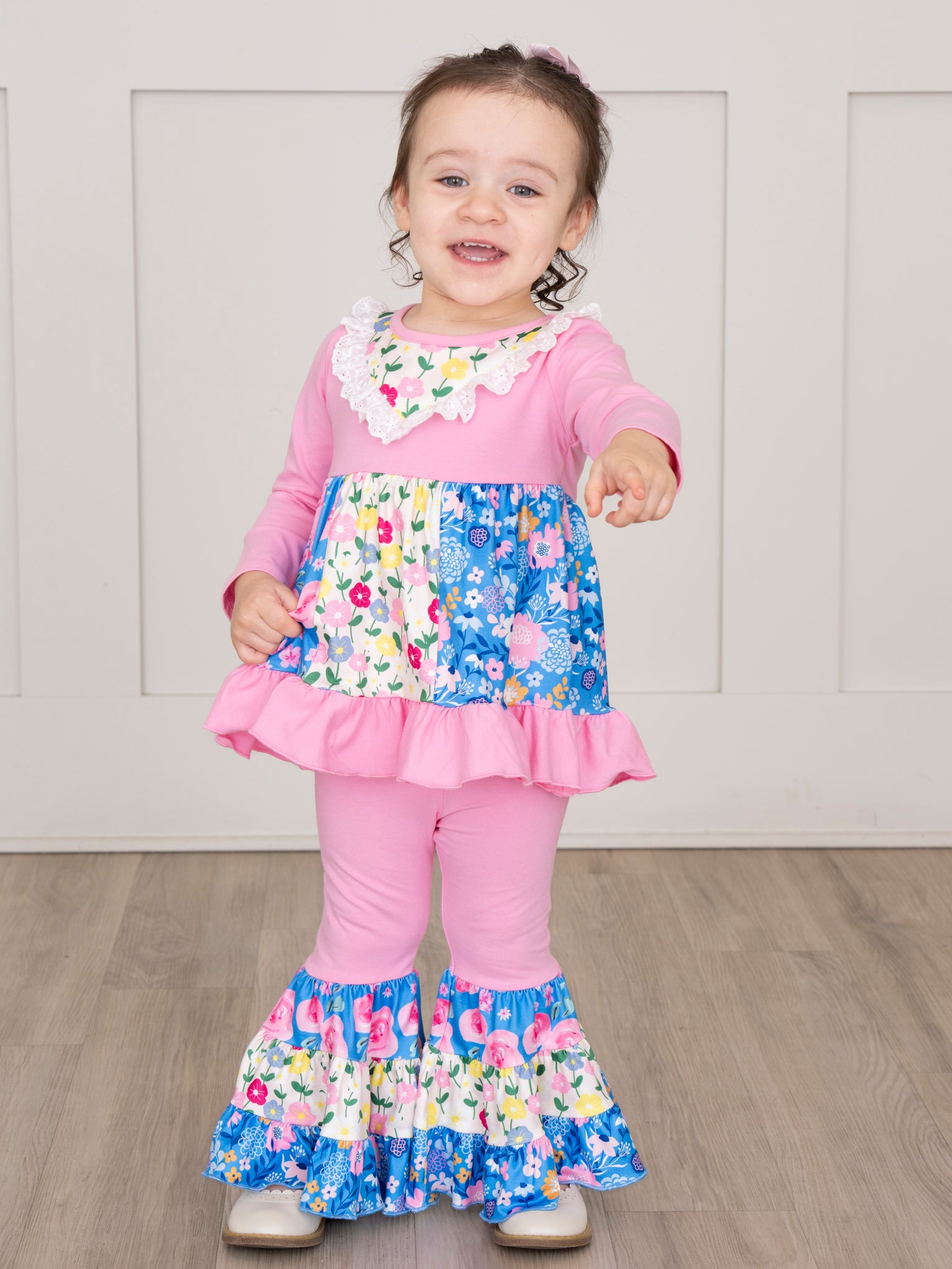 Bloom into autumn with this sister set! This outfit features a charming top with pink bodice & mixed floral print detail topped off with a playful pink ruffle hem. The coordinating bell bottoms are perfect for adding a touch of garden whimsy to your little one's wardrobe.