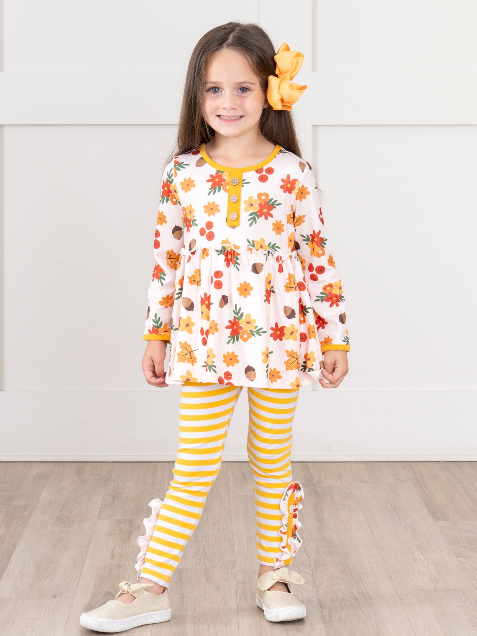 Fall florals abound throughout this sister set! This flower-patterned outfit features a three-button henley collar top with a cinched waist, long sleeves, and yellow trim detail, plus coordinating gingham leggings with ruffle ankles.