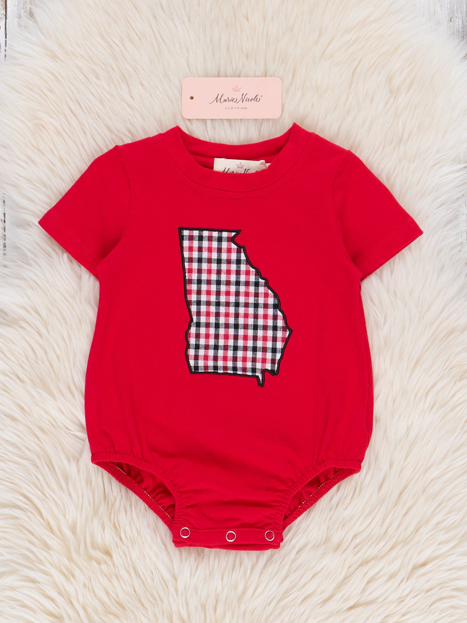 The Georgia Embroidered Gingham Bubble is a charming blend of Southern pride and classic style. Featuring a red and black gingham pattern and a beautifully embroidered Georgia applique, this bubble from Marie Nicole Clothing is perfect for showing off team spirit in a sweet, everyday way. Lightweight and breathable, it’s ideal for warm weather, casual outings, or cheering on your favorite team in comfort and style.