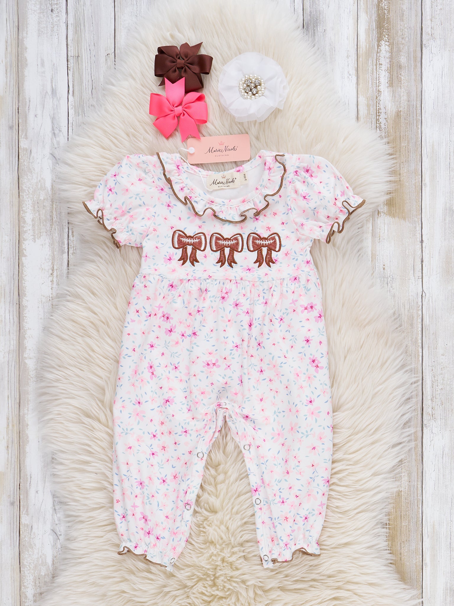 The Huddle & Hairbows Embroidered Romper is an adorable, flowery one-piece with a game day touch! This romper by Marie Nicole Clothing makes a lovely ode to football with its ball-themed bow embroidery. Comfy and sweet, your little girl with love wearing this romper whether watching a game or playing outside!
