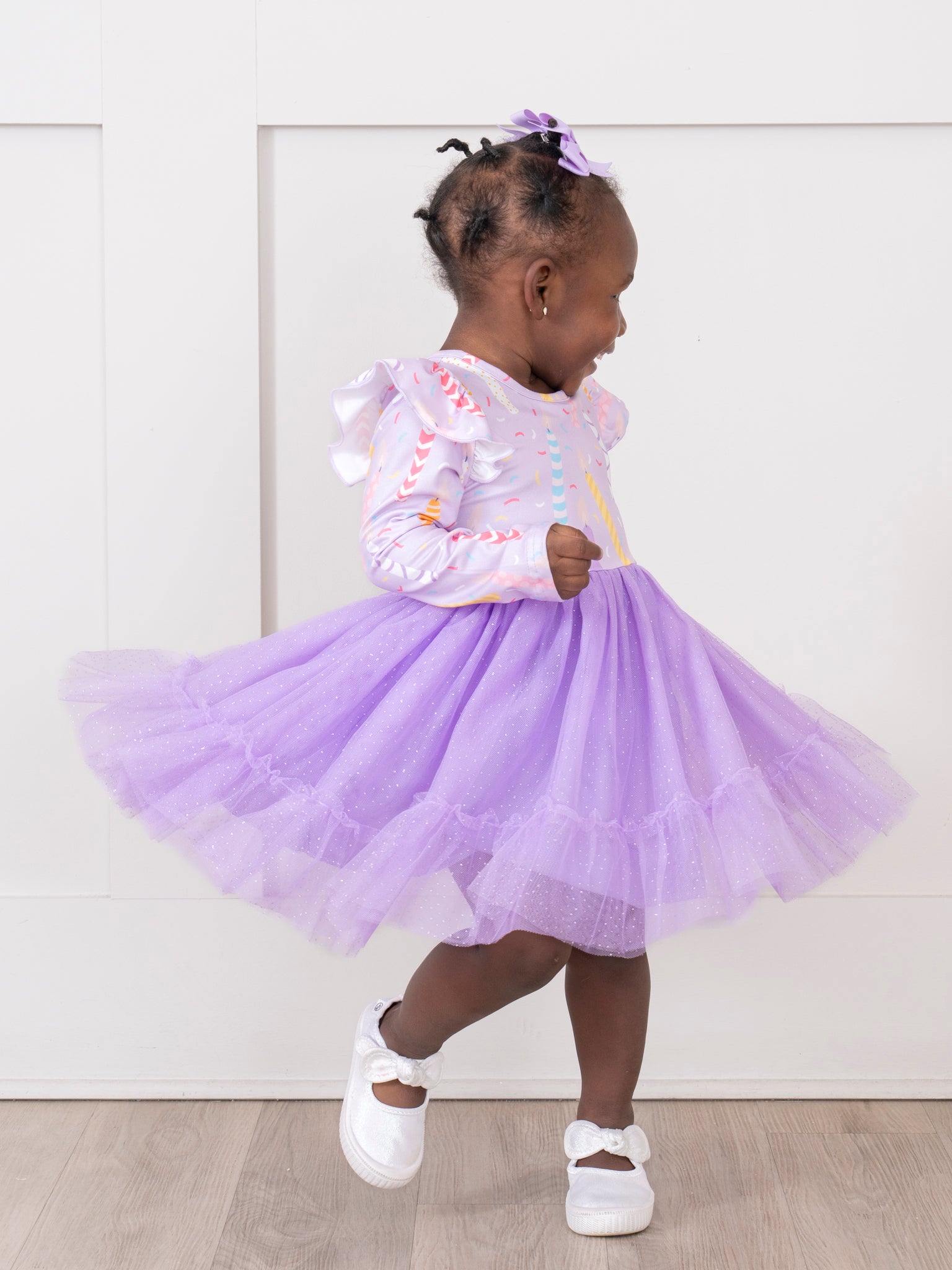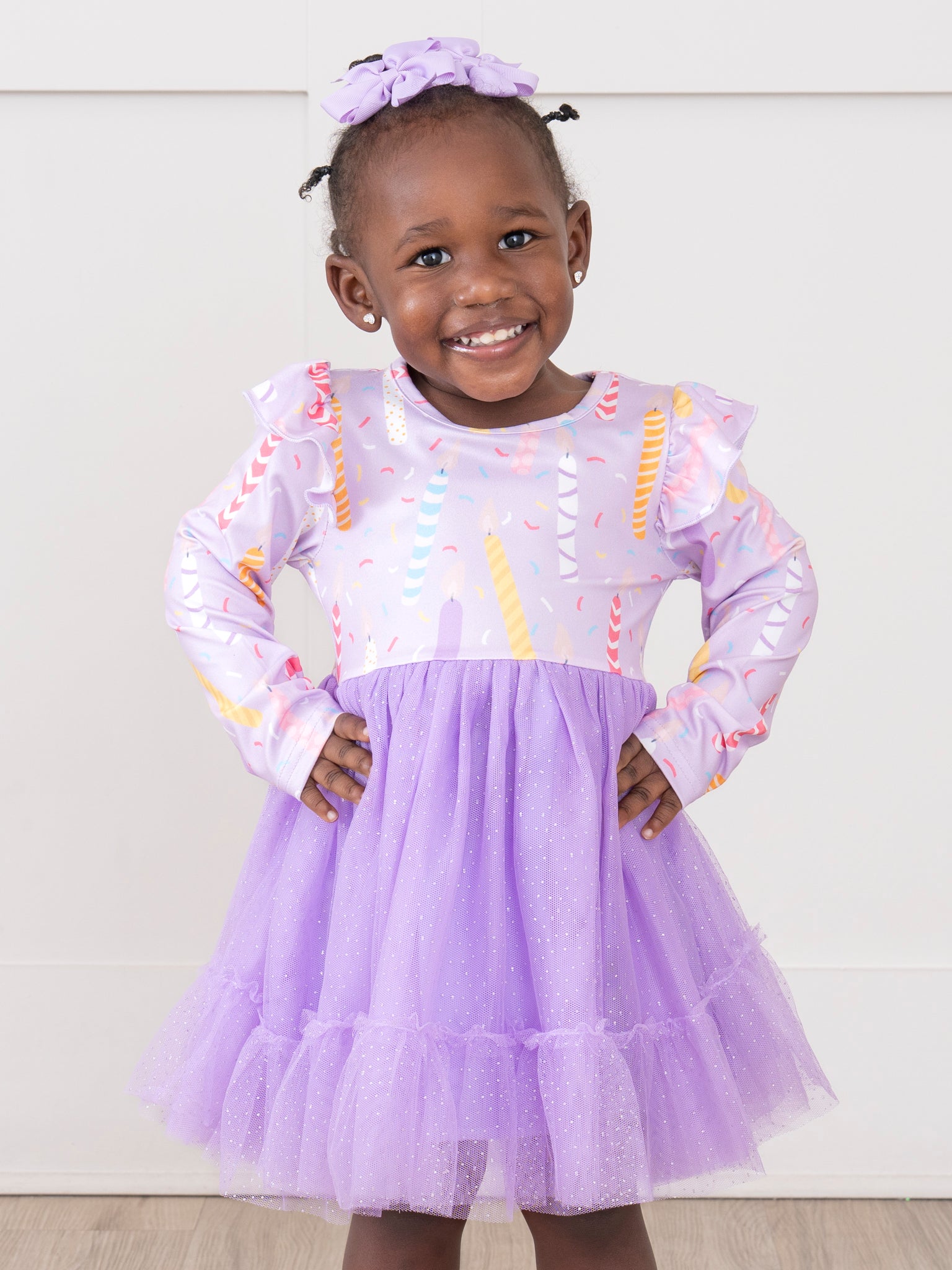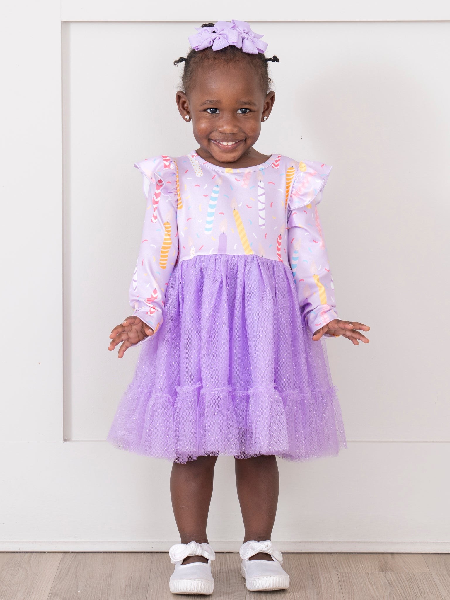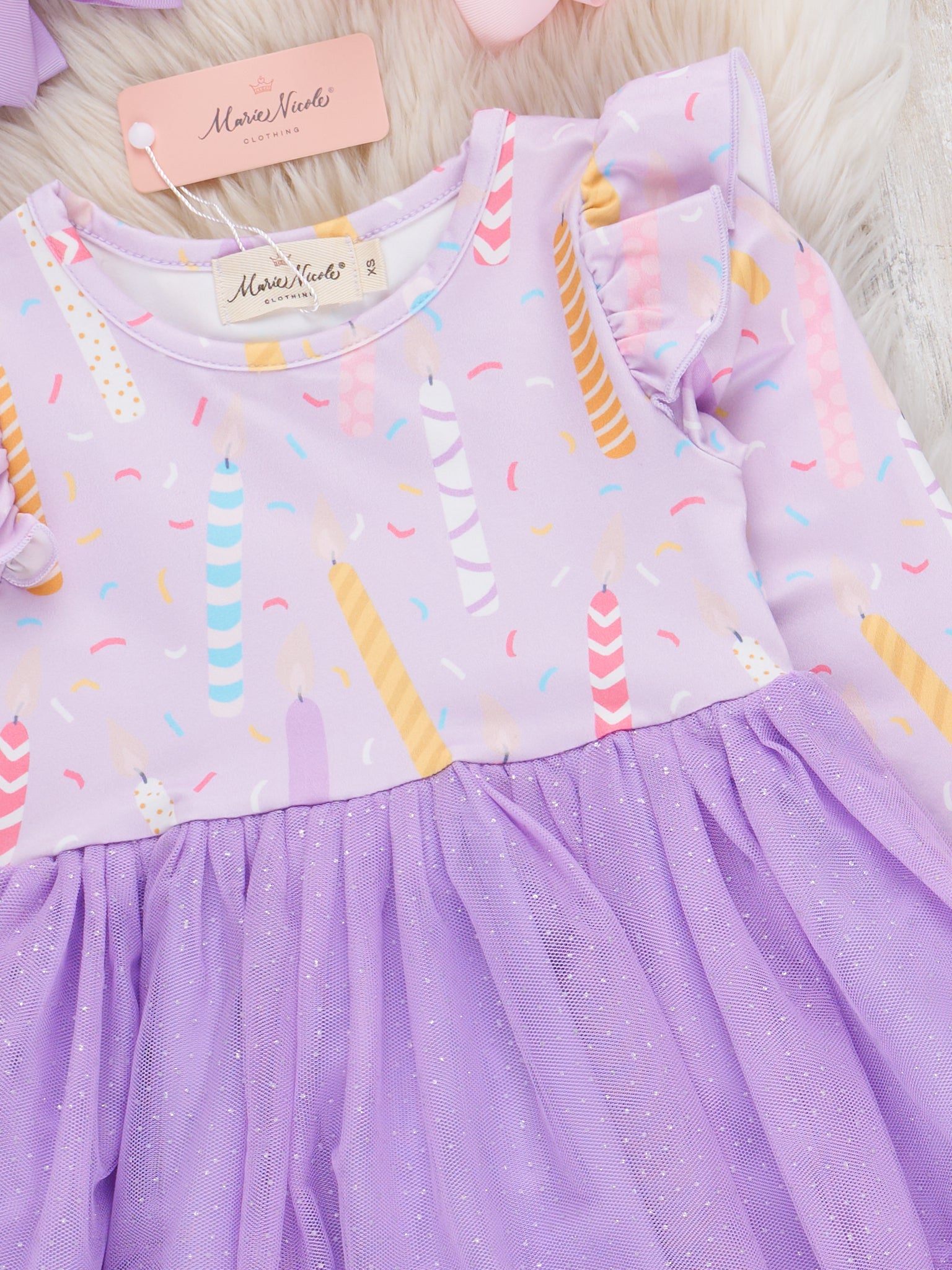 The Birthday Girl's Candles Tulle Dress by Marie Nicole features a soft long sleeve bodice adorned with playful birthday motifs, along with flutter shoulder ruffles and a voluminous tulle skirt. This whimsical dress is decorated with silver glitter layered tulle, making it the perfect choice for celebrating a special occasion.