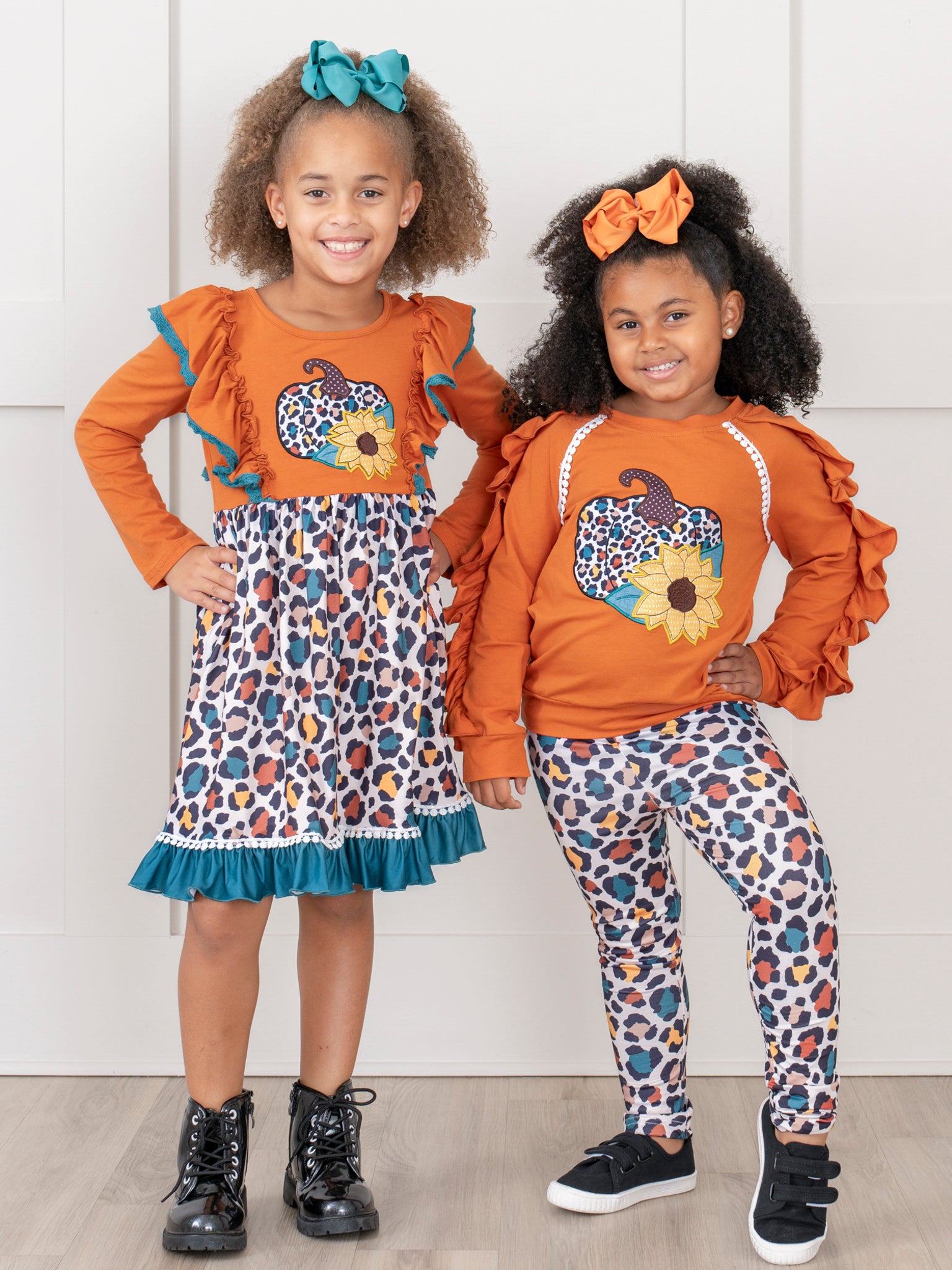 Bronze & Teal Leopard Harvest Ruffle Dress by Marie Nicole Clothing includes an orange bodice with an embroidered pumpkin and sunflower. The leopard print skirt adds a touch of quirky fun, with a teal ruffle hem for extra charm. Perfect for any little fashionista looking to stand out!