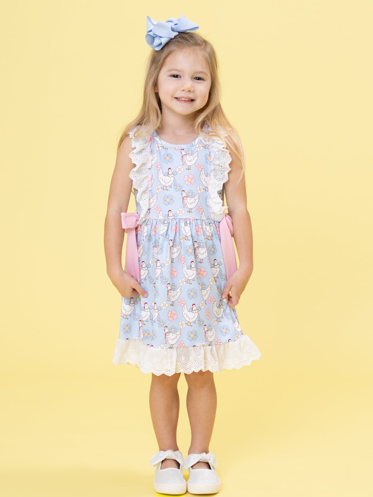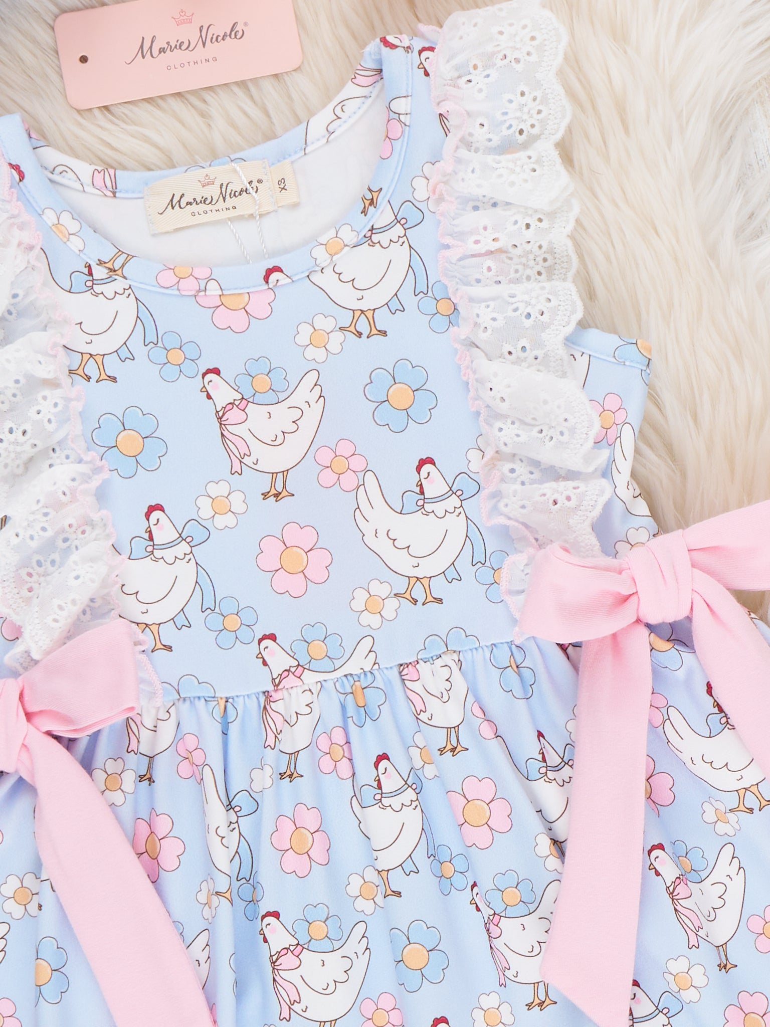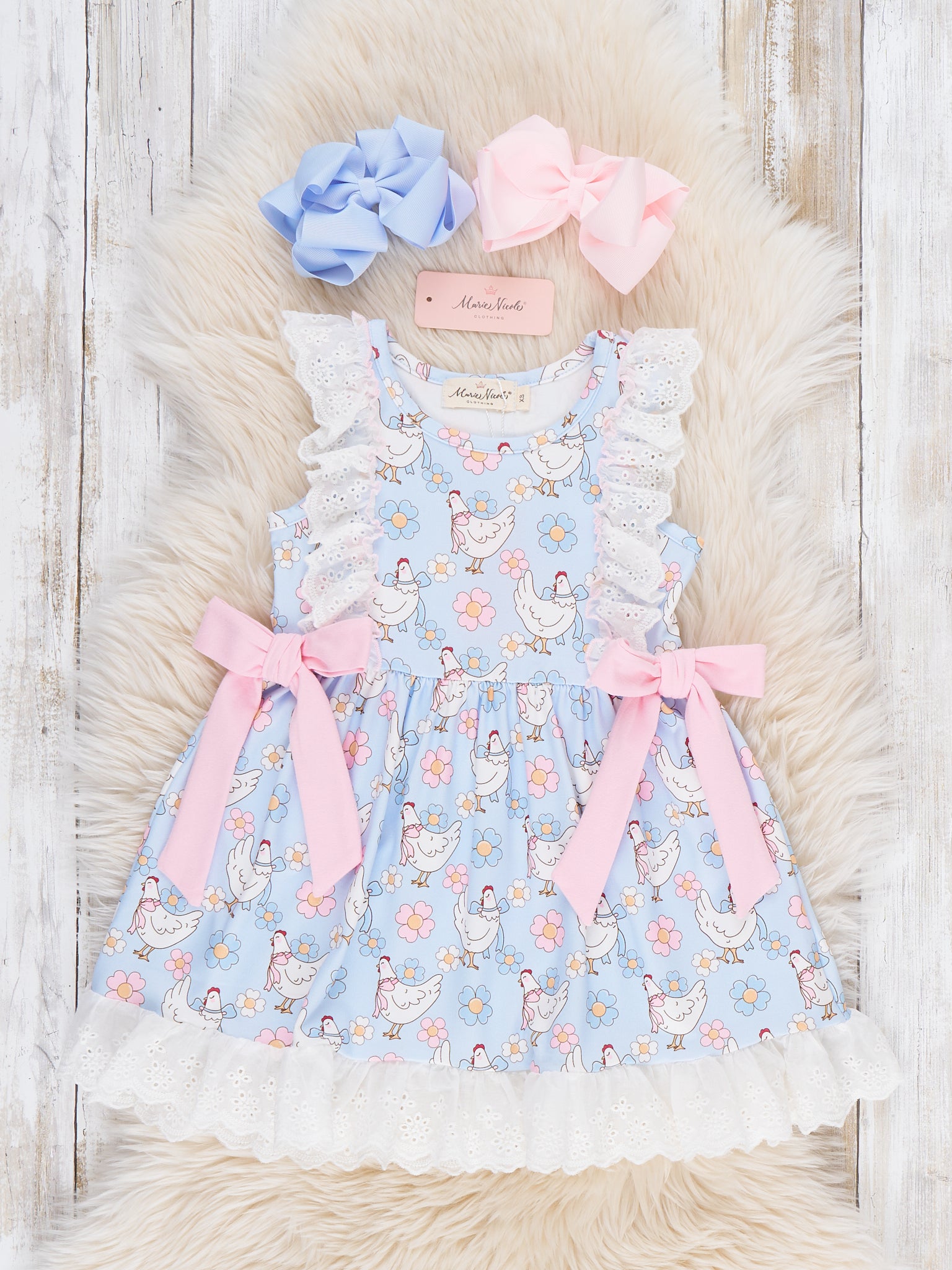 The Chicken Garden Lace Dress by Marie Nicole Clothing showcases a sweet allover chicken print framed with delicate lace-trimmed ruffles along the bodice and hem. Oversized side bows accent the gathered waist, adding extra charm and twirl-ready volume. Crafted from soft, breathable fabric, this dress is perfect for garden parties, tea-time play, and picture-perfect spring celebrations.