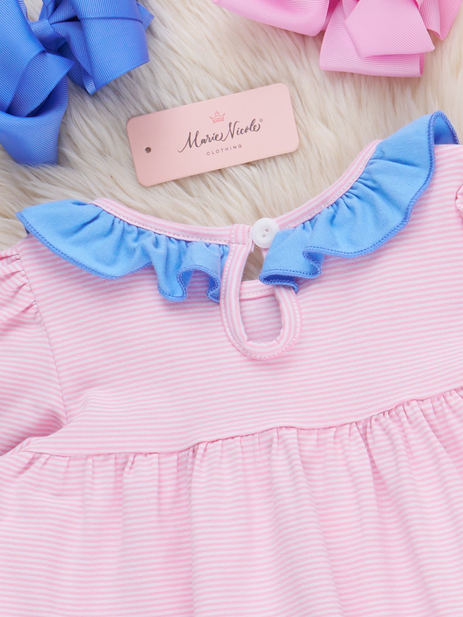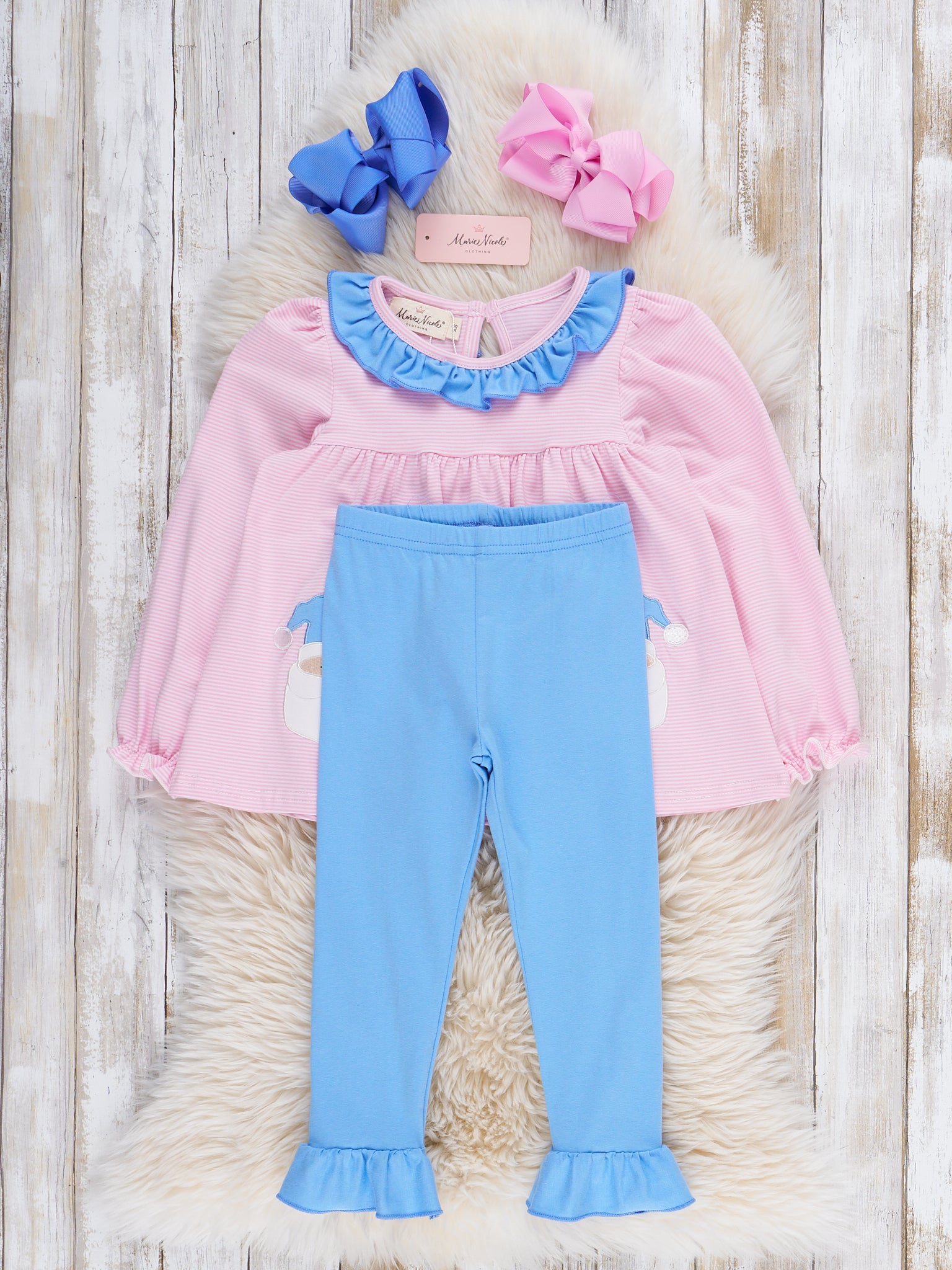 The Dreaming Santa Embroidered Ruffle Outfit by Marie Nicole features a long-sleeve tunic with playful Santa embroidery on the front pockets, finished with a sweet ruffle neckline and gathered sleeves. The set is paired with coordinating pull-on pants adorned with ruffle hems, creating a cheerful and comfy style perfect for festive occasions