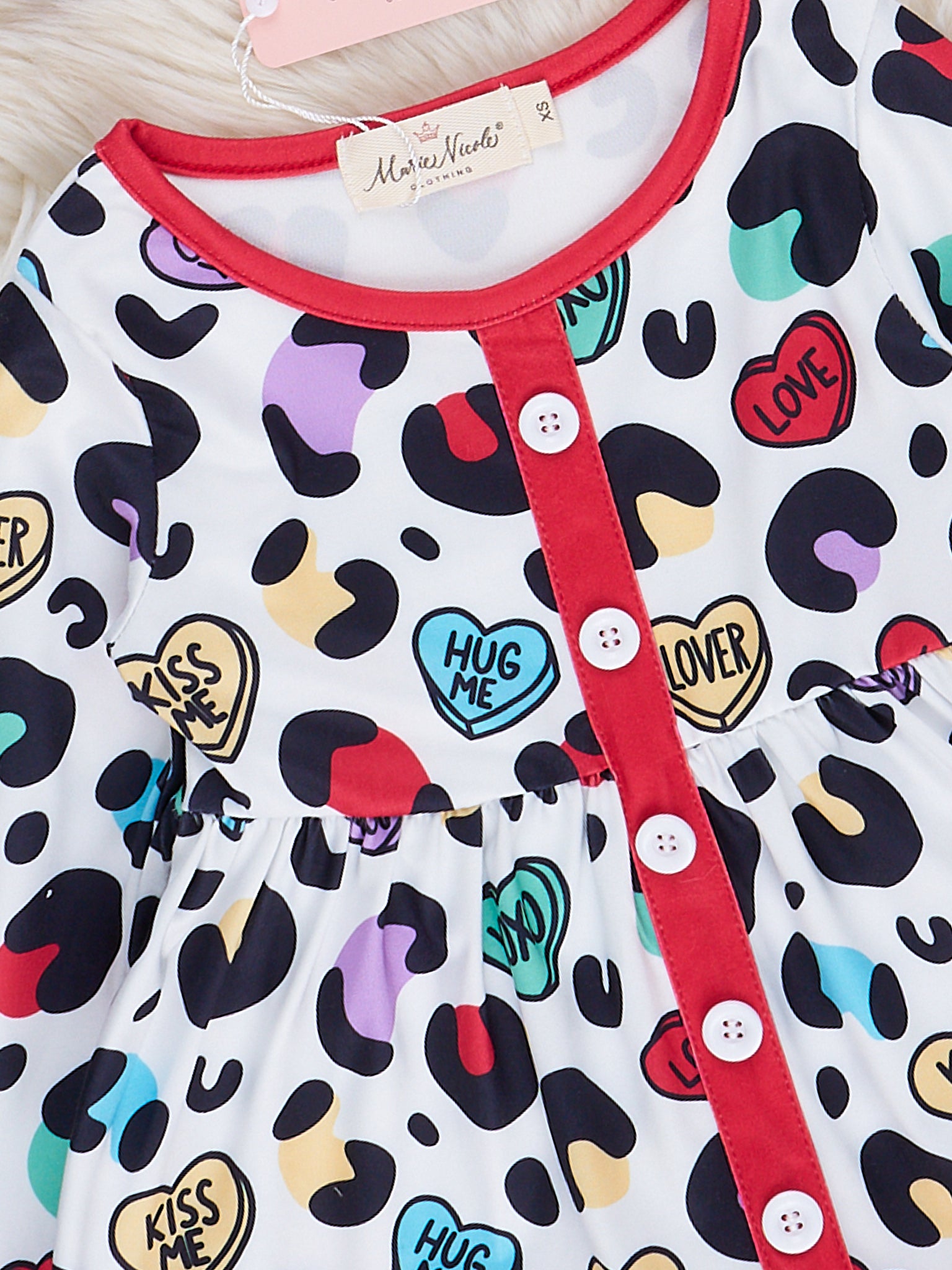 Be the star of Valentine's Day with this Heart of Hearts Double Tiered Ruffle Dress by Marie Nicole Clothing! Featuring an adorable heart & leopard print, two tiers of ruffles, and faux buttons in the front, you'll be sure to make a statement. You'll be sweeter than a coffee mug full of cupcakes!