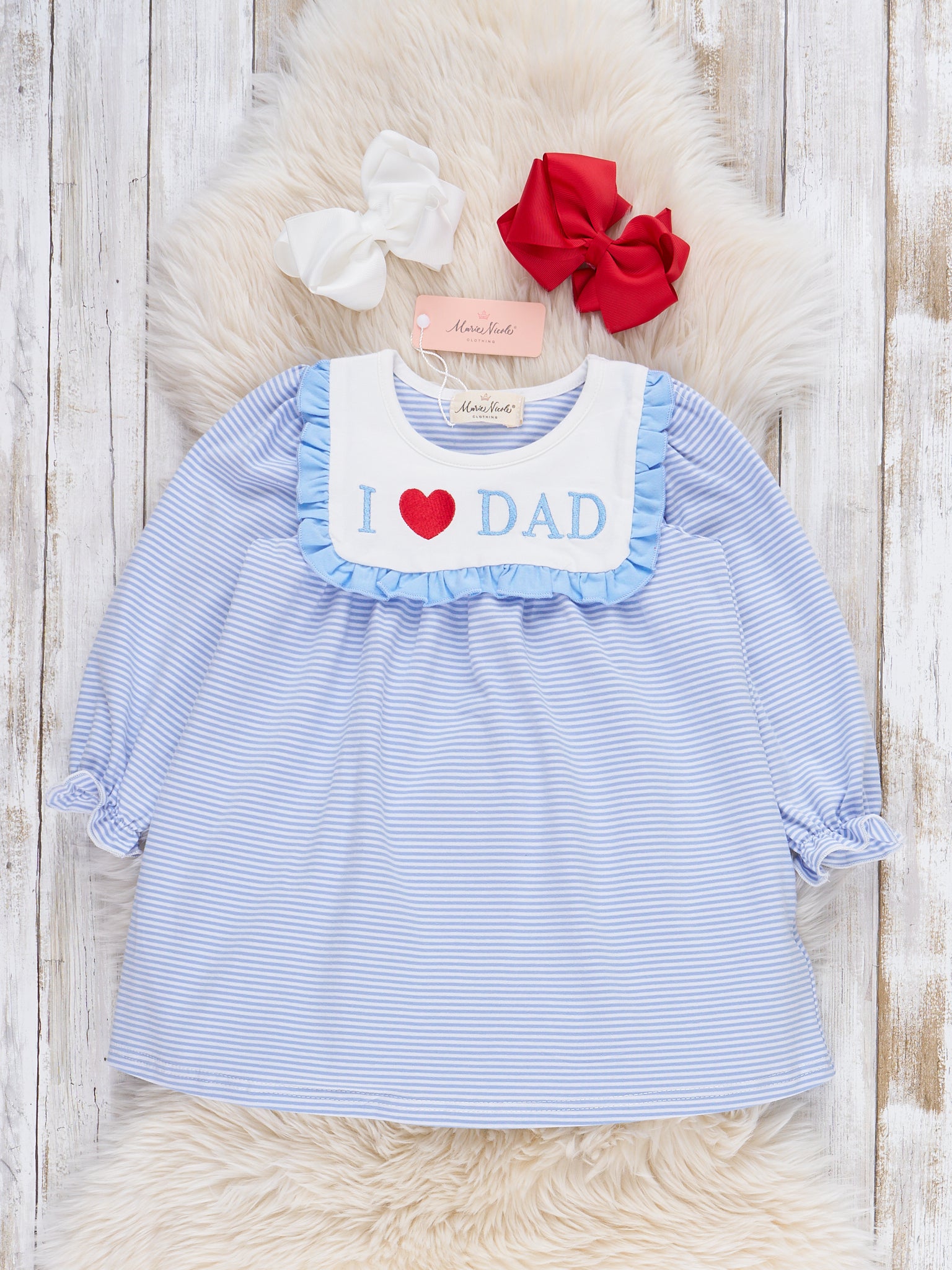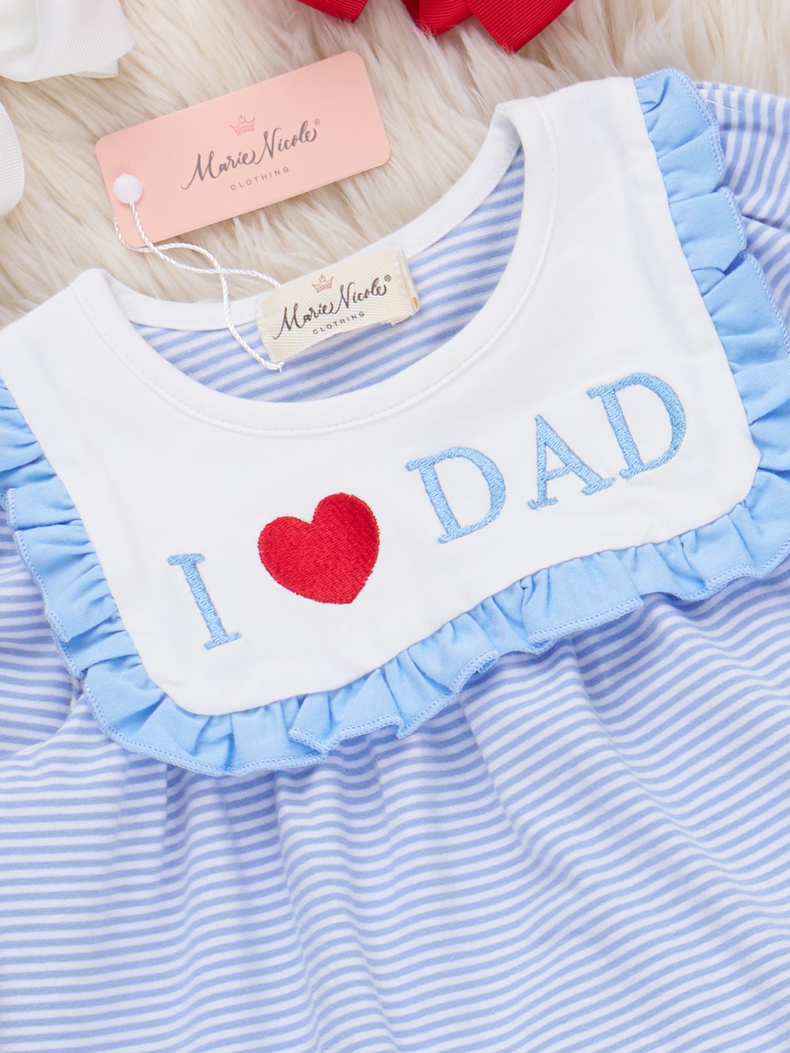 Little Love for Dad Embroidered Ruffle Romper by Marie Nicole Clothing is crafted to celebrate the special bond between child and father, featuring a sweet embroidered message and playful ruffle details. This cozy romper makes a thoughtful gift for Father’s Day or any day dedicated to making dad feel loved.