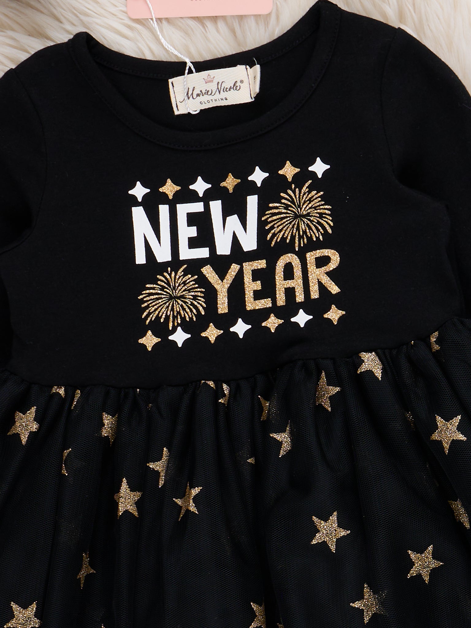 The Starlight New Year’s Party Dress by Marie Nicole features a long-sleeve bodice with bold festive that celebrates the new year, paired with a full skirt adorned with sparkling stars. This dress is perfect for ringing in the celebrations with style and a bit of magical shimmer.