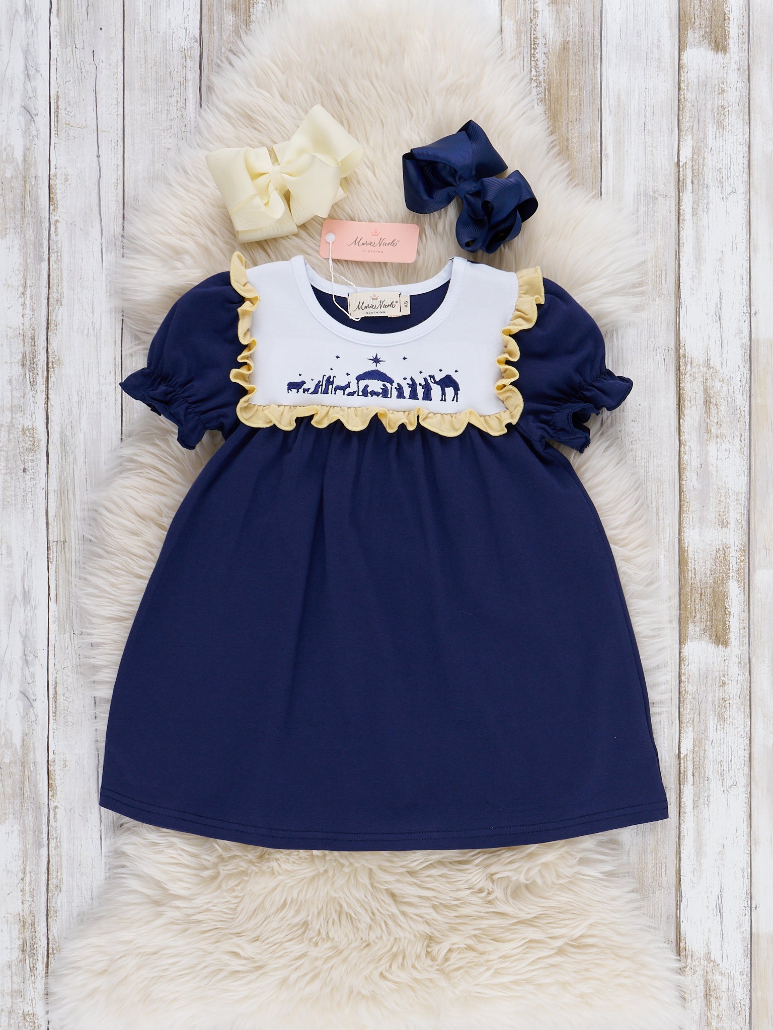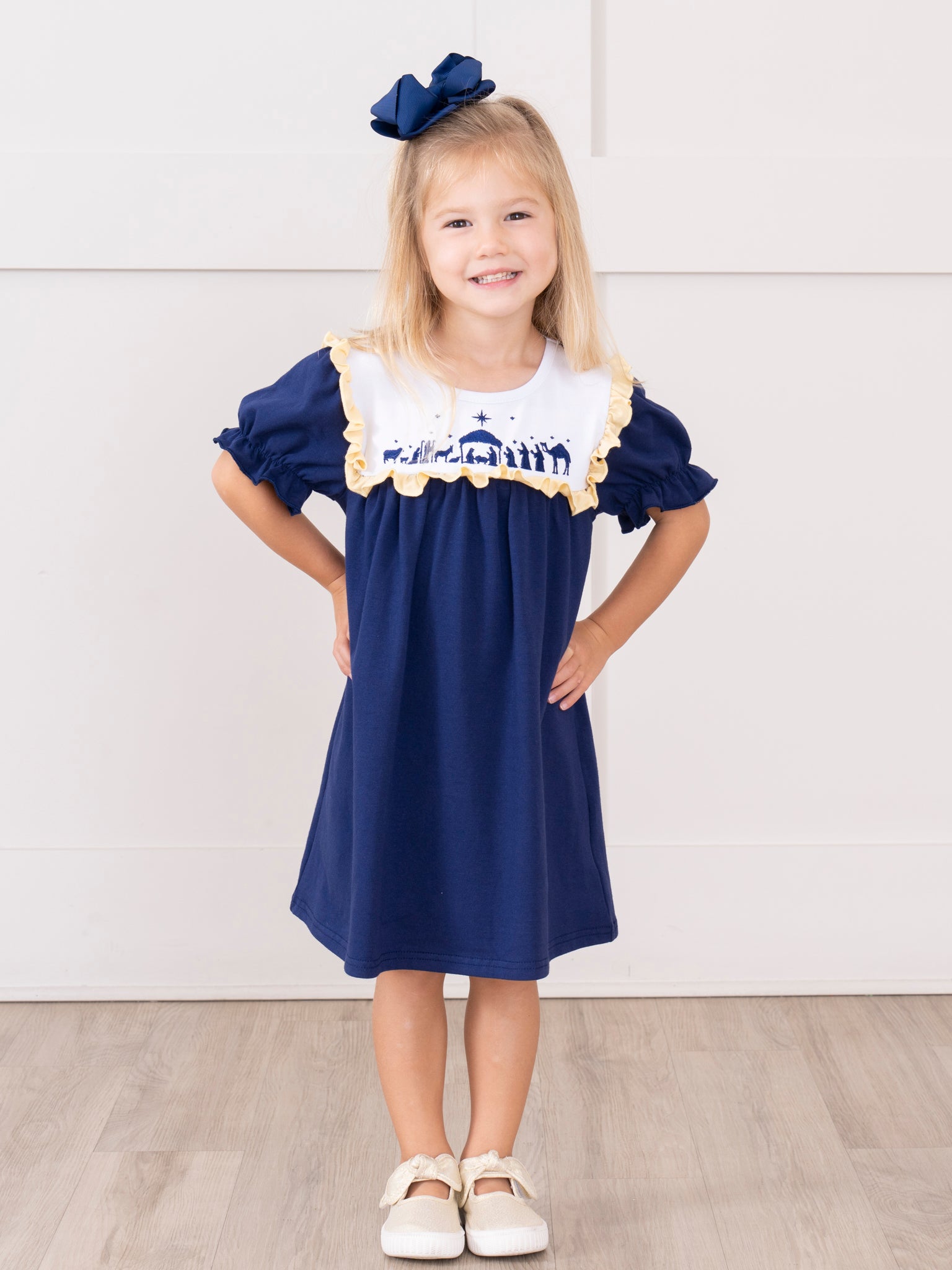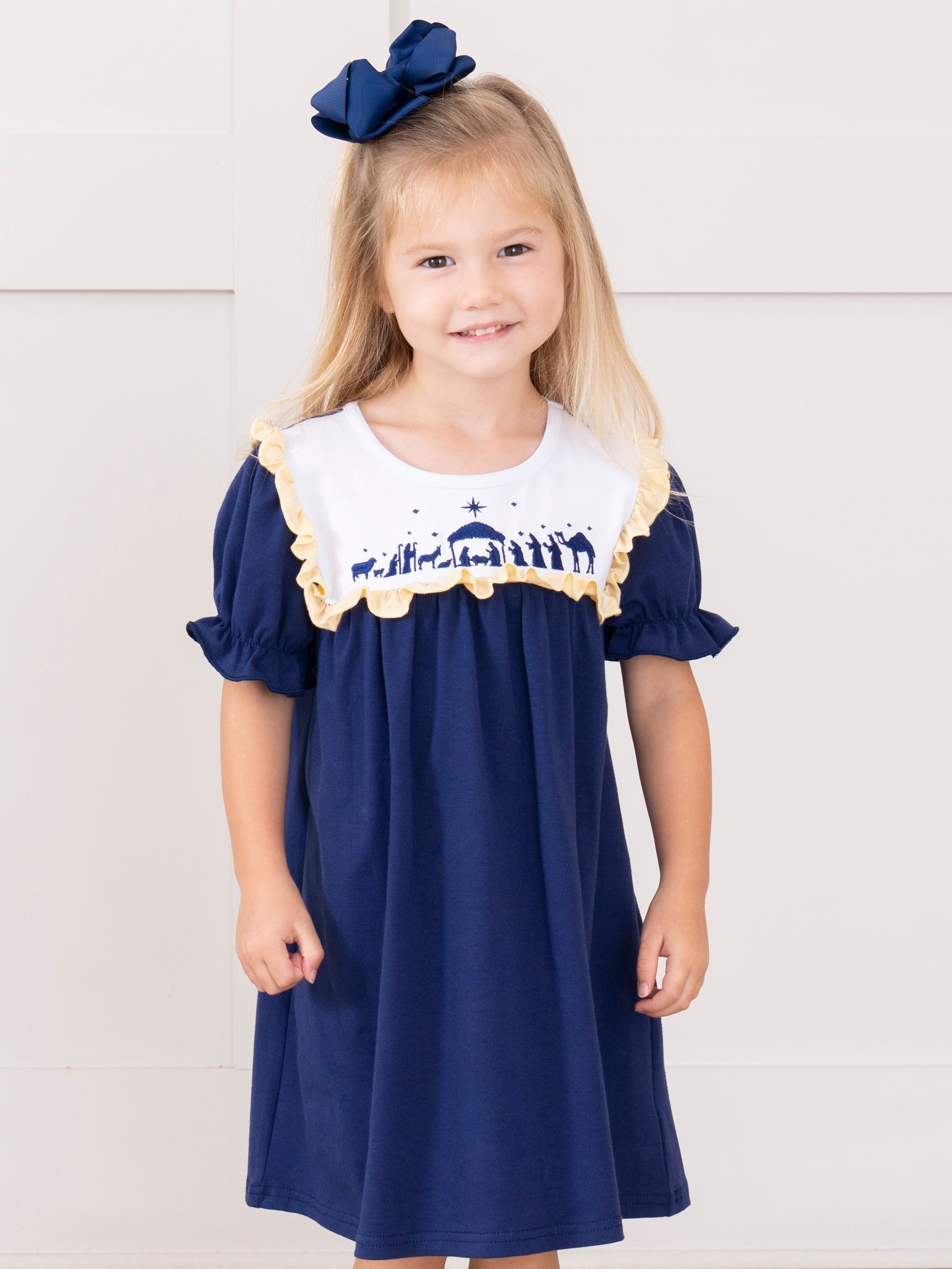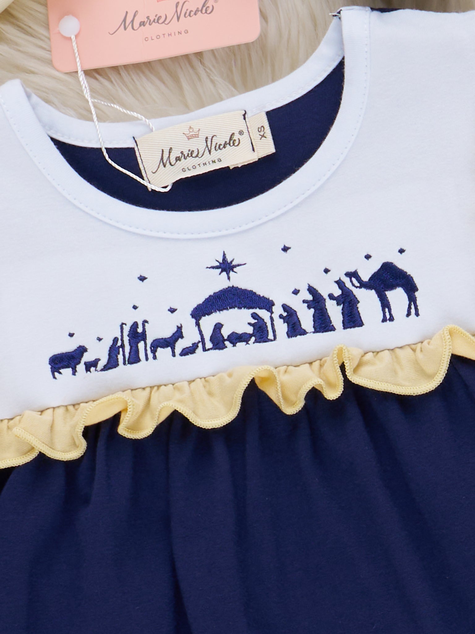 Experience a playful twist on the classic Christmas Nativity with our Nativity Embroidered Ruffle Dress. Perfect for sisters, this girls dress features an embroidered Nativity scene on a navy blue bodice with a fun and sweet ruffle trim. Add a touch of whimsy to your holiday wardrobe!
