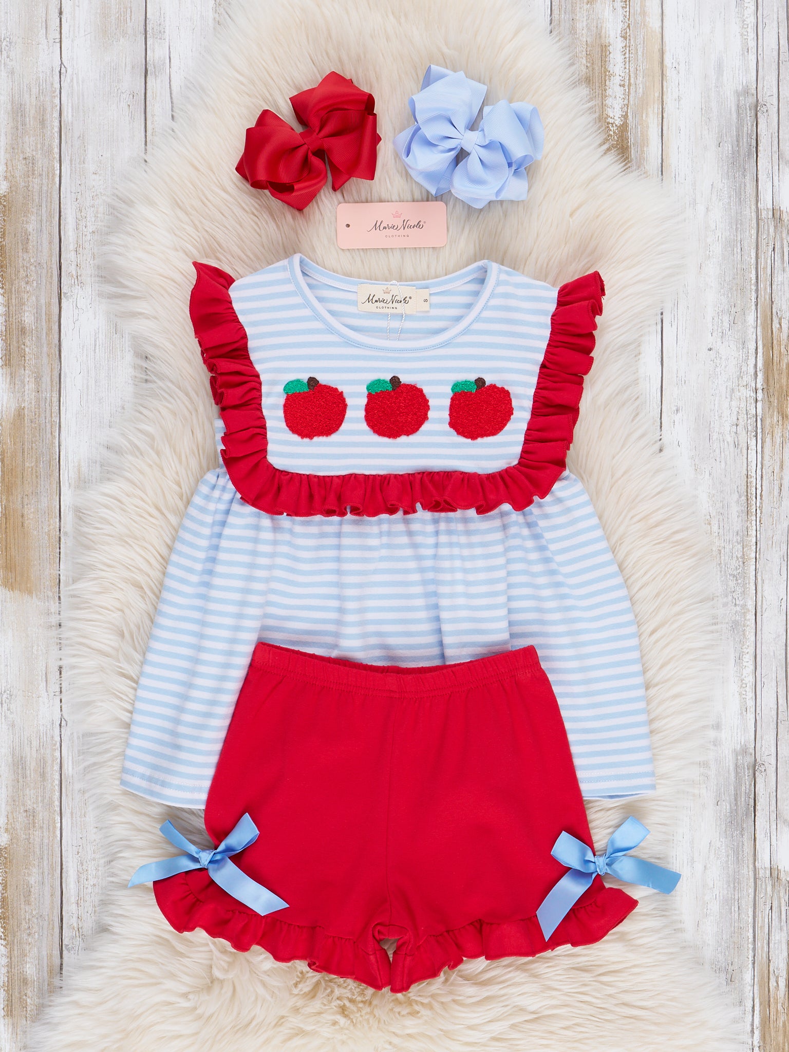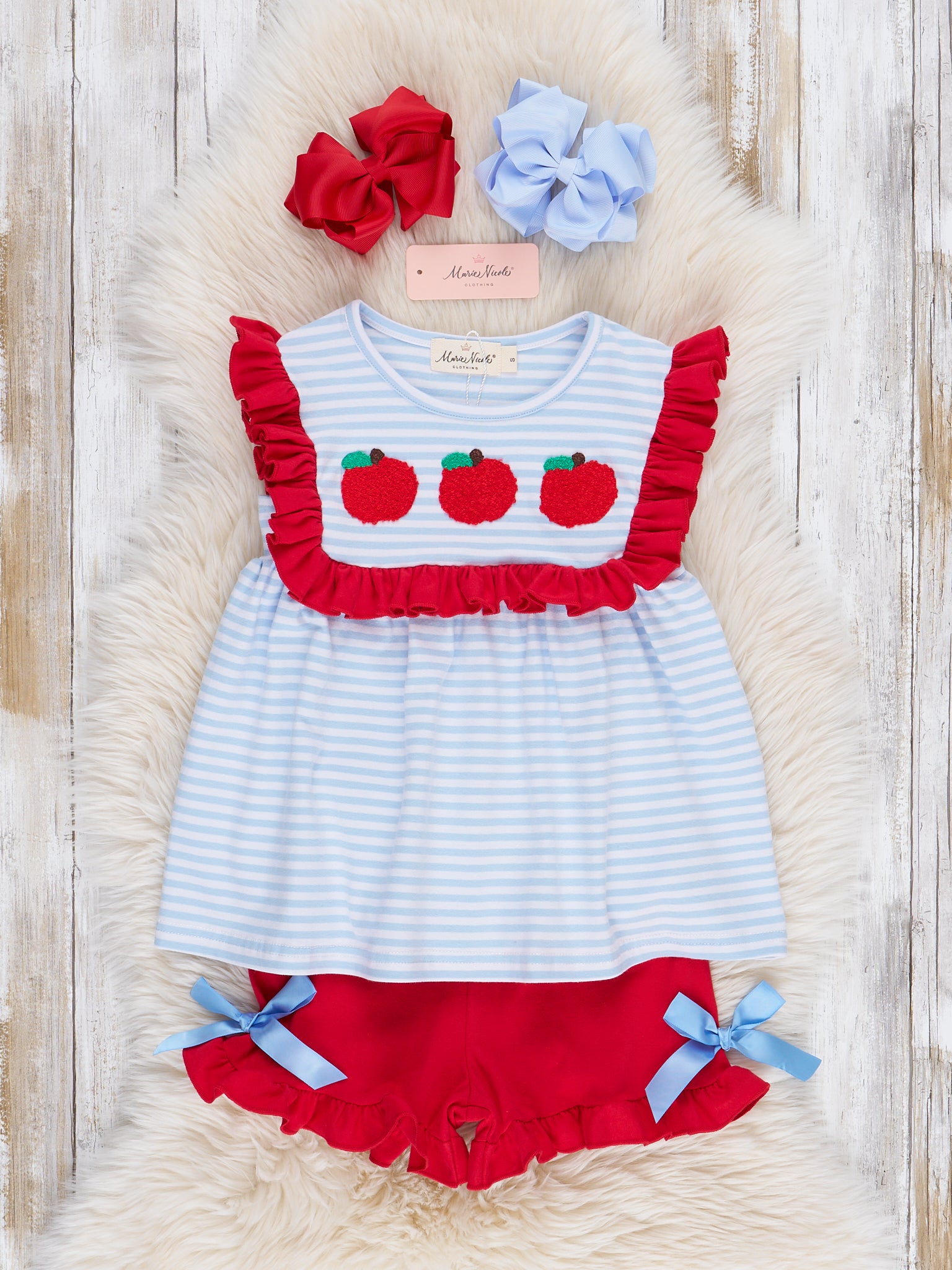 This sibling set is perfect for the apples of your eye! This outfit features a blue striped swing top with red ruffle trim and embroidered apples. The matching apple red ruffle shorts are the perfect complement for this school-ready look! šŸŽ