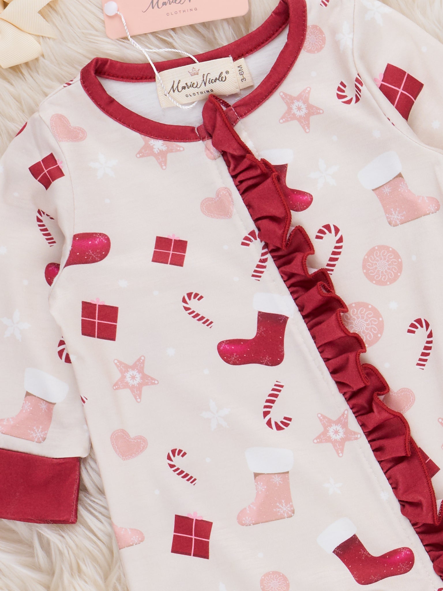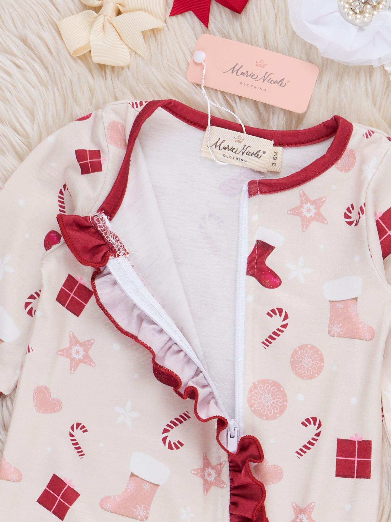 The Merry Magic Sleeper Pajamas by Marie Nicole feature a festive print of stockings, gifts, and holiday icons on a cozy one-piece design. Soft ribbed cuffs and a ruffled front add extra charm, while full-body zipper make for easy late-night changes