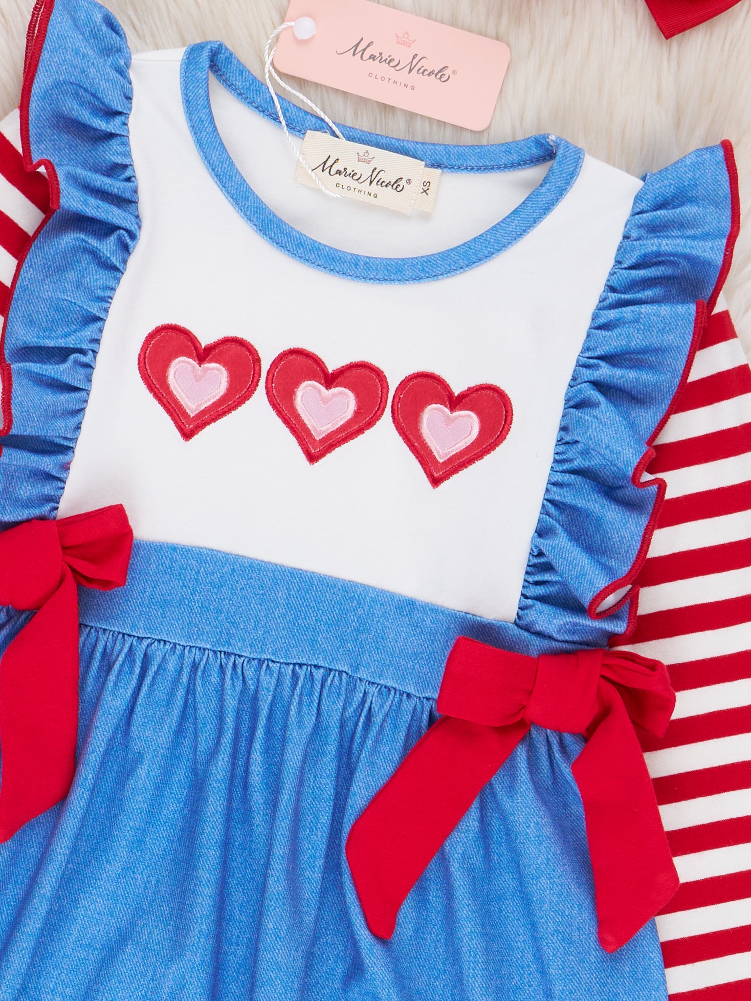 Blue & Red Stripes Embroidered Hearts Ruffle Dress