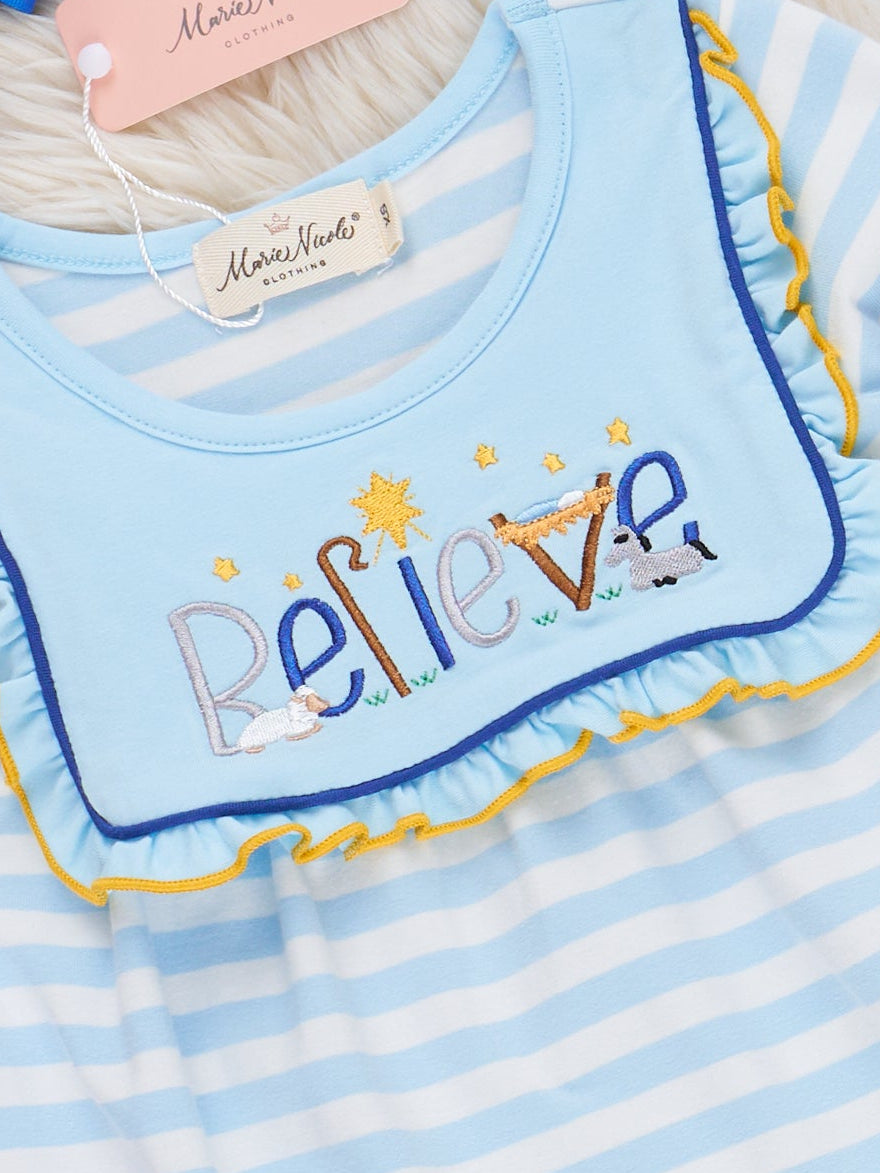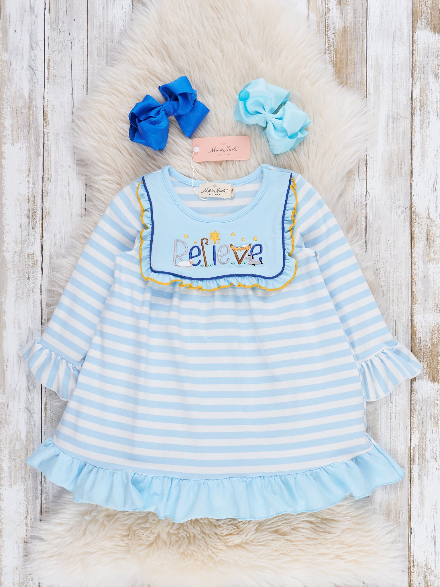 The Believe in Nativity Embroidered Ruffle Dress by Marie Nicole features soft horizontal stripes, ruffled cuffs and hem, and a decorative bodice panel with an inspiring "believe" motif. Designed with gentle gathers for twirling, this comfortable dress adds whimsical charm to festive occasions and everyday celebrations