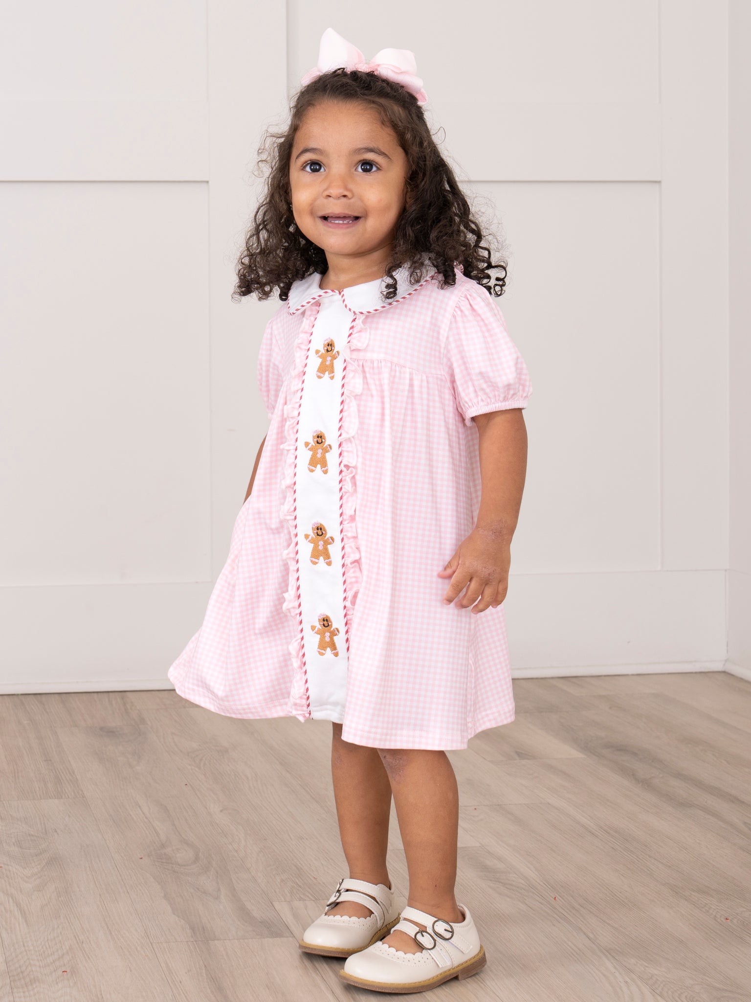 So sweet! The Gingerbesties Embroidered Dress is a charmingly cute piece, featuring embroidered gingerbread cookies down the center. With a peter pan collar, peppermint-striped details, and pink gingham, this Marie Nicole Clothing dress is positively perfect for the holidays. Bake cookies, build gingerbread houses, or eat sweets in this lovable dress!