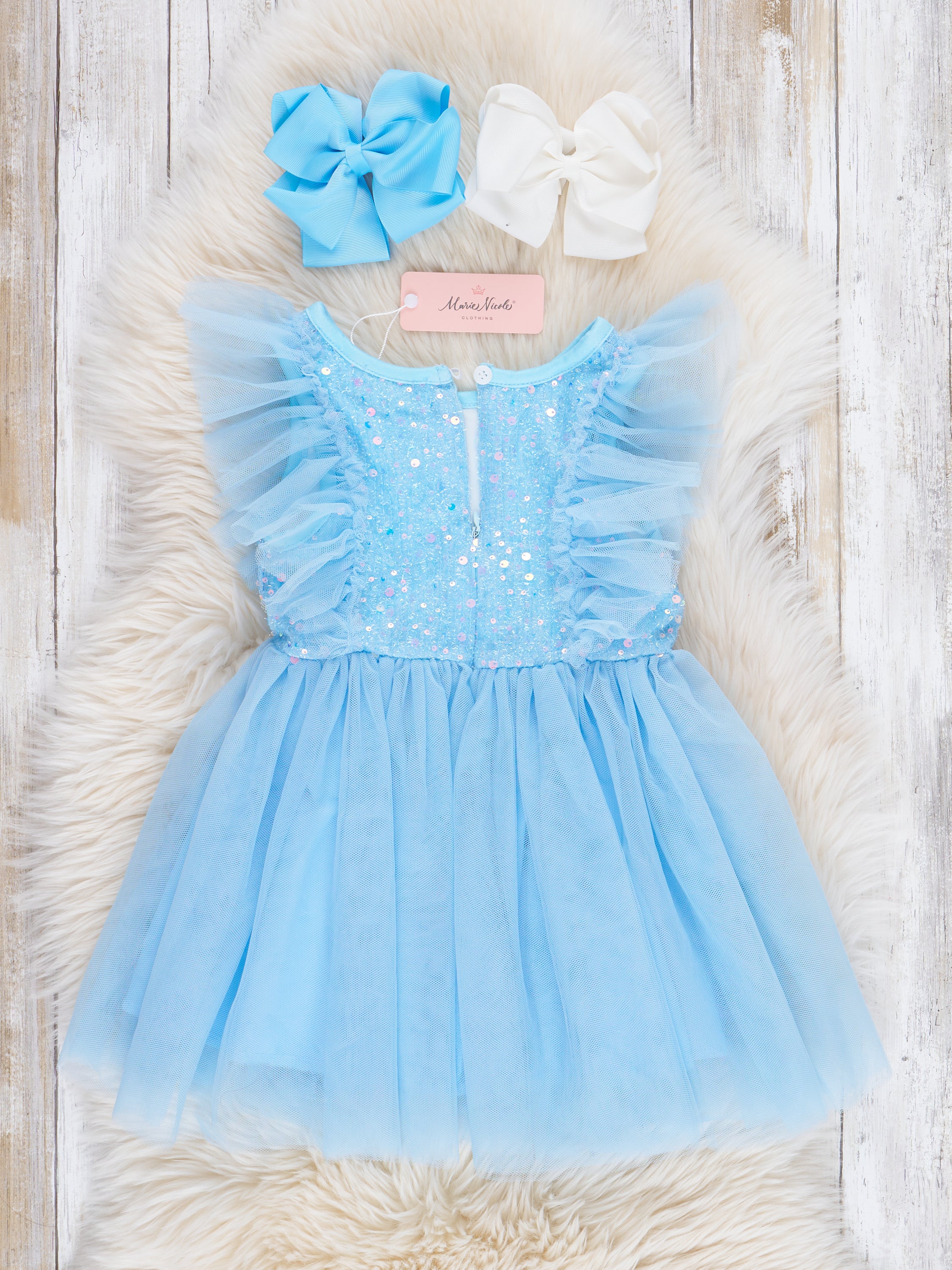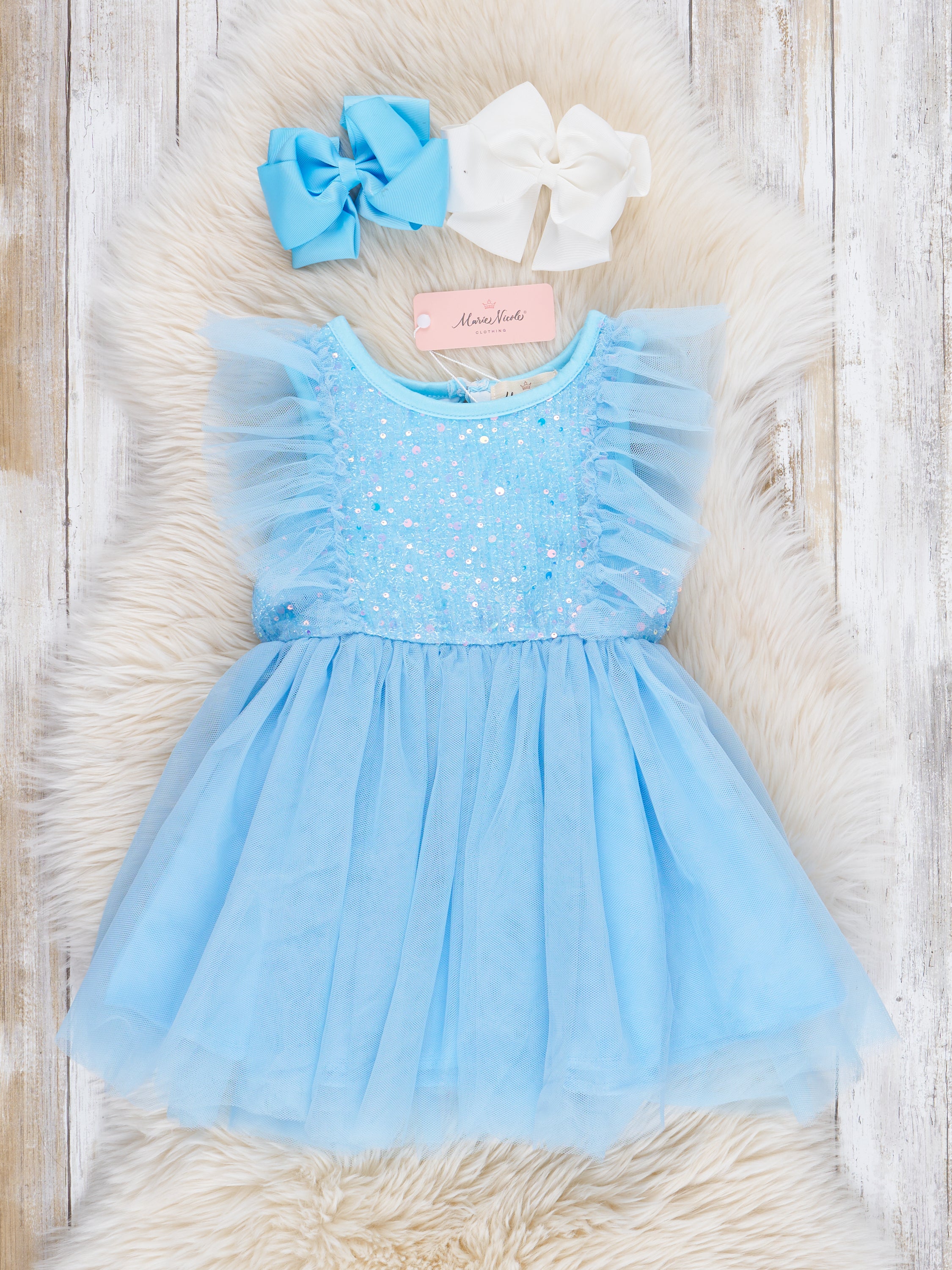 This sweet Light Blue Flutter Tulle Dress will have your little girl twirling with joy! Designed specially for MNC, the delicate flutter sleeves and lined tulle skirt add a whimsical touch, while the sparkling sequin bodice adds a fun and glamorous element. Perfect for any special occasion, this dress will make your little one feel like a princess!