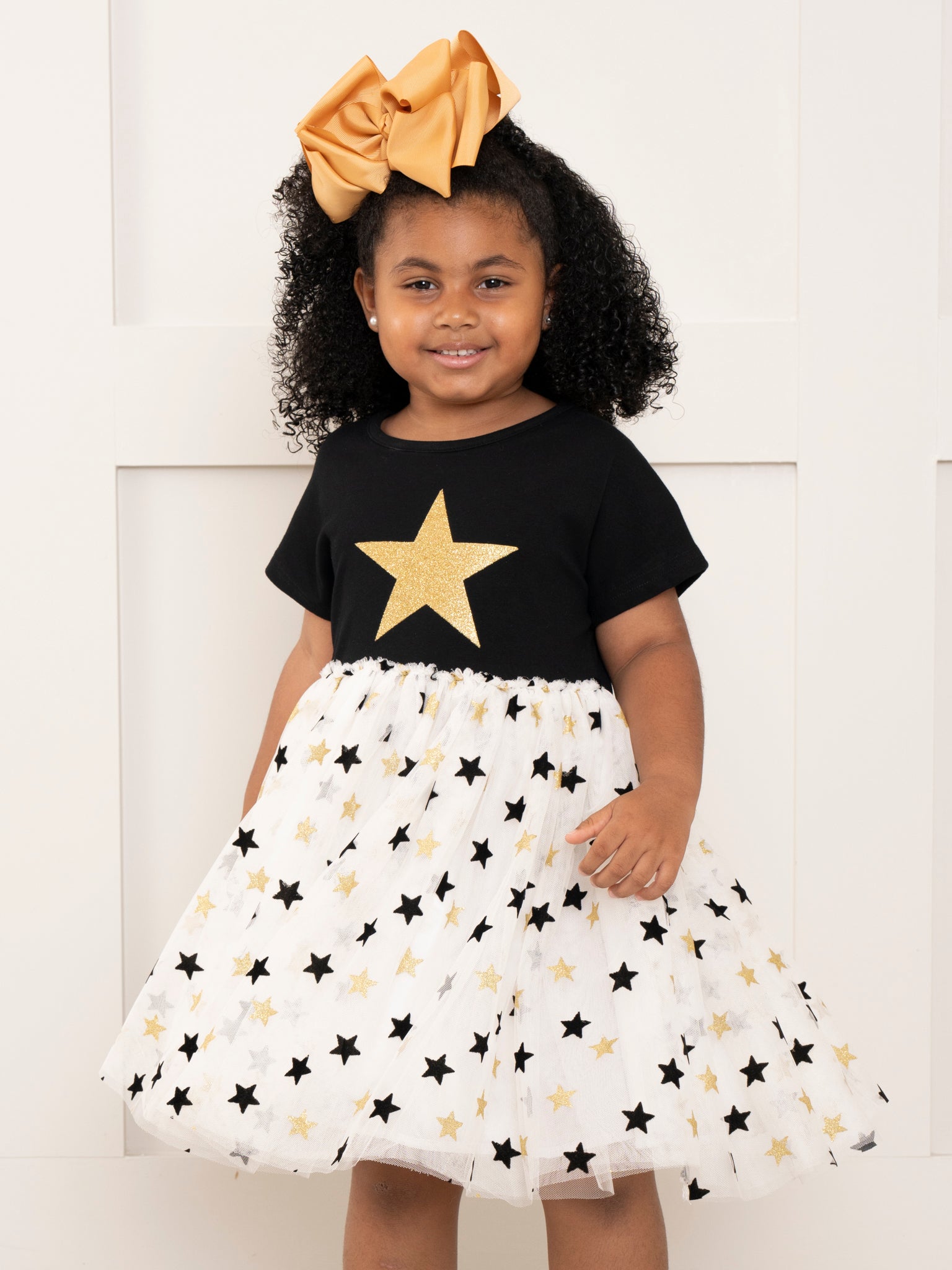 Add a touch of whimsy and sparkle with our Black & Gold Glitter Stars Tulle Dress. ⭐️★ Your little will shine in this dress featuring a soft black top with a bright gold star atop a white tulle skirt adorned with charming black and gold stars, making it perfect for a dazzling look. Stand out and shine in this playful dress!