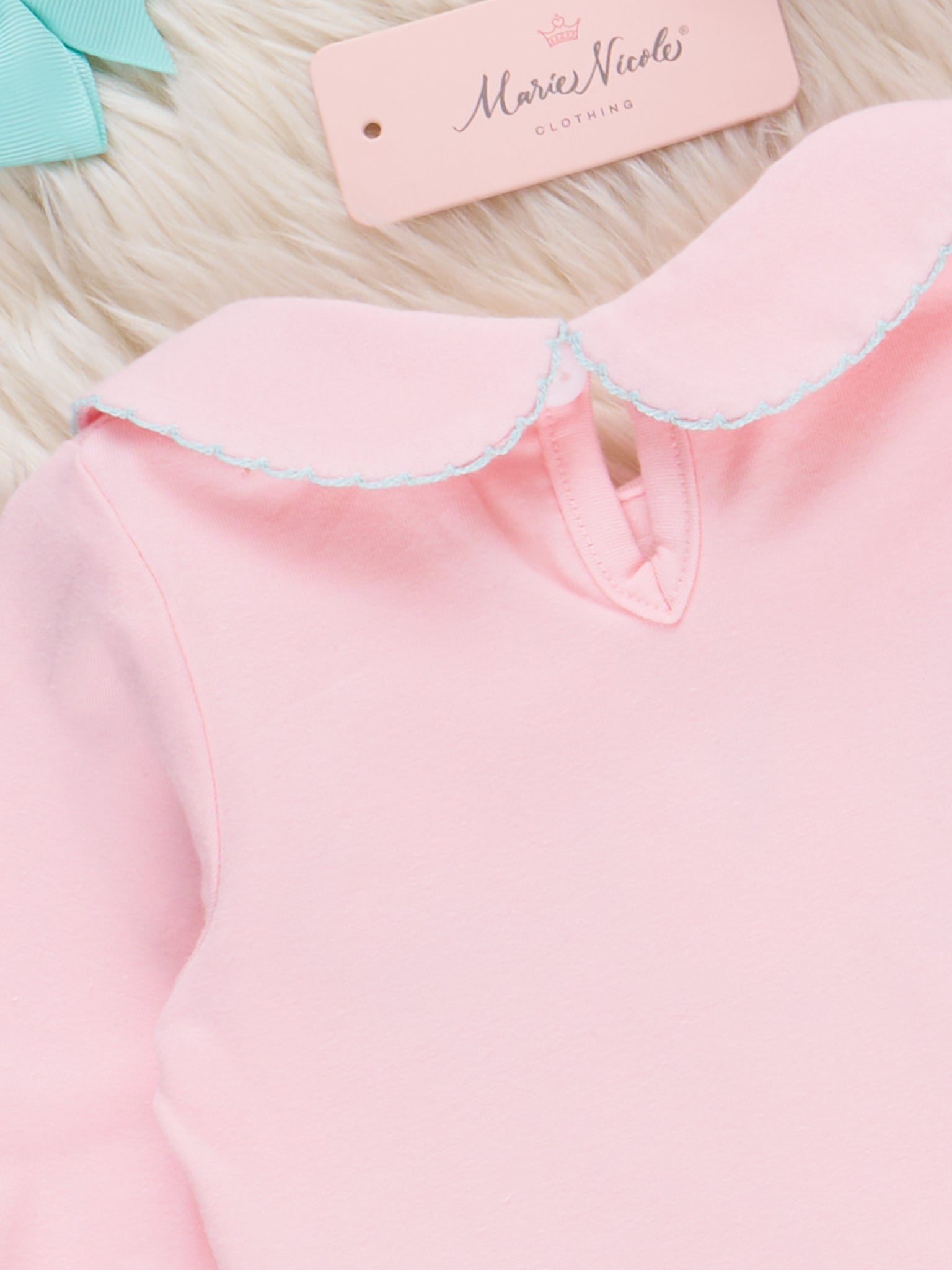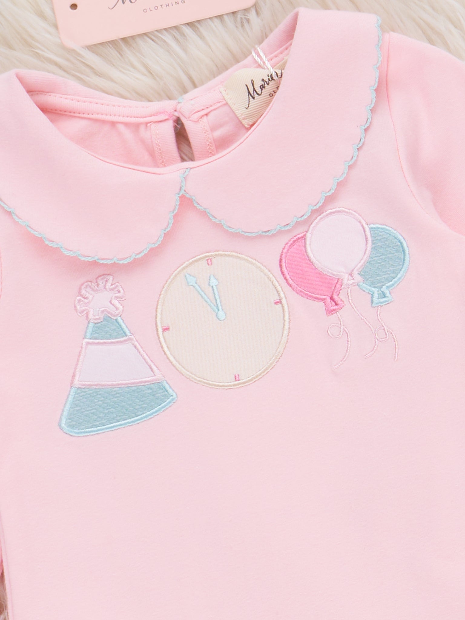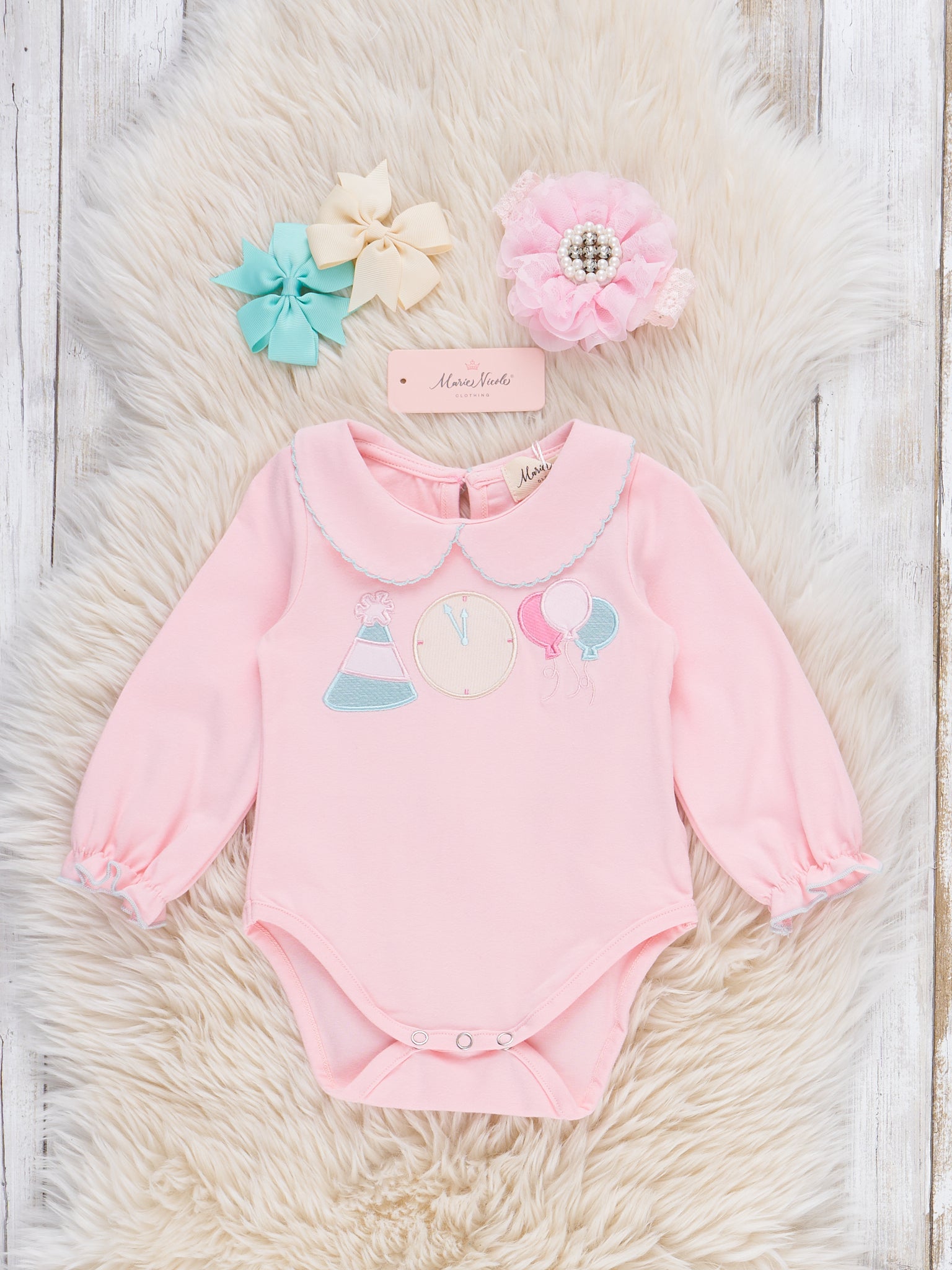 The Celebrate at Twelve Embroidered onsie is a festive outfit designed by Marie Nicole Clothing featuring detailed embroidery inspired by party themes like hats and balloons, finished with a classic peter pan collar and gentle gathers for comfortable wear. Designed for celebrating special milestones and joyful occasions, this bubble brings a charming touch to holiday gatherings or a memorable New Year's countdown.