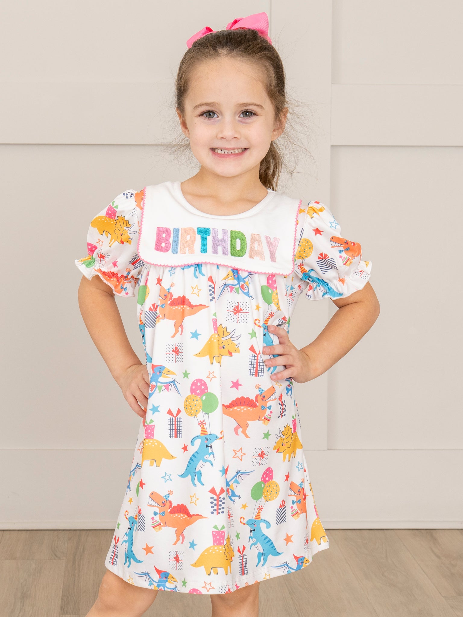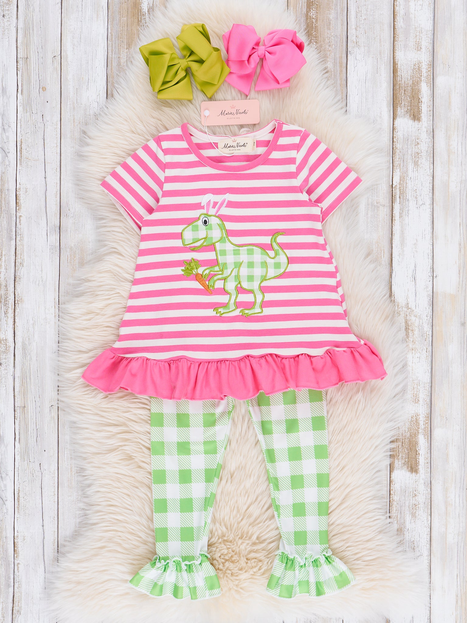 Pink & Green Gingham Embroidered T-Rex Ruffle Outfit