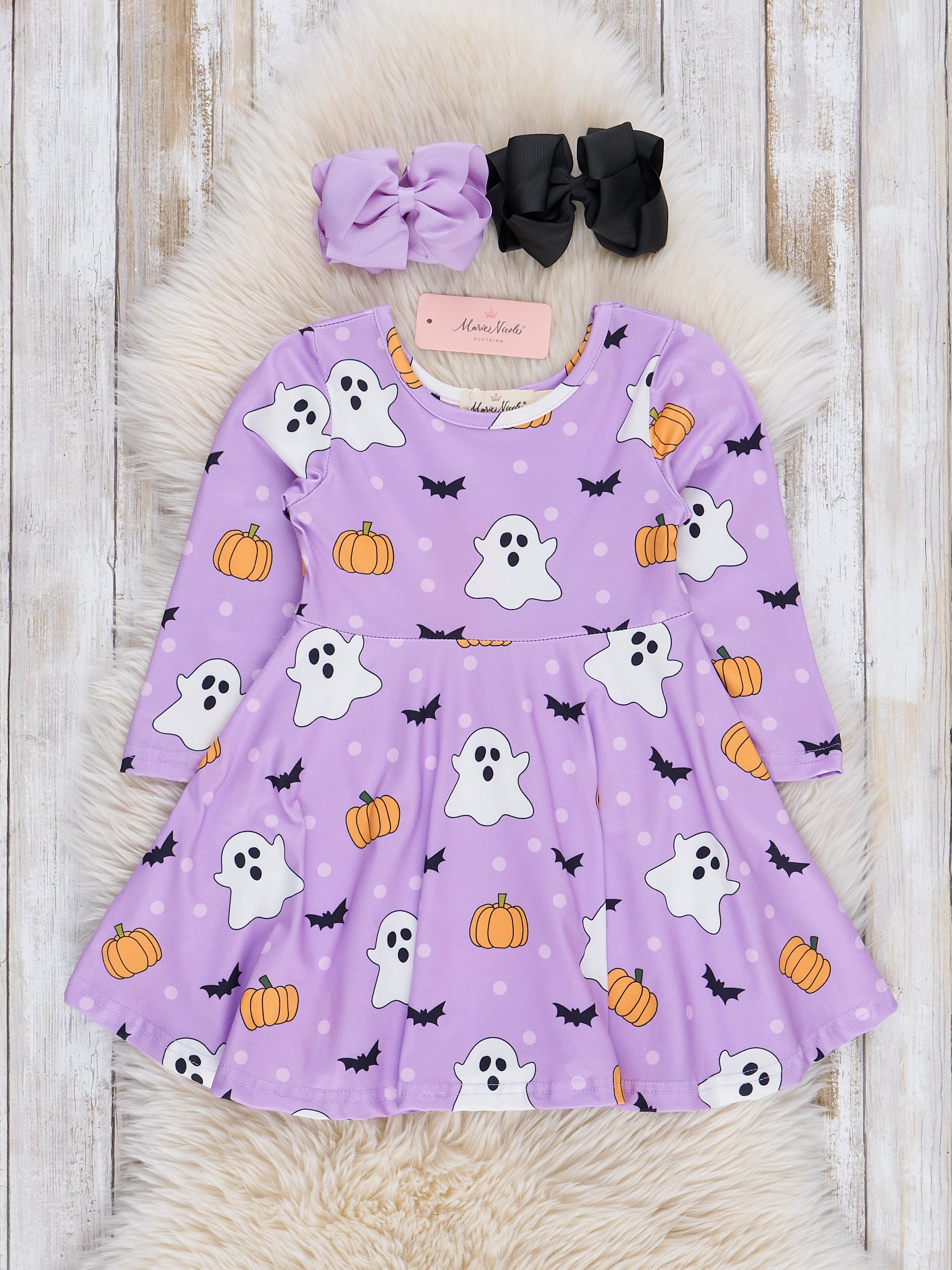 Long Sleeve Halloween Swing Dresses - Purple Ghosts