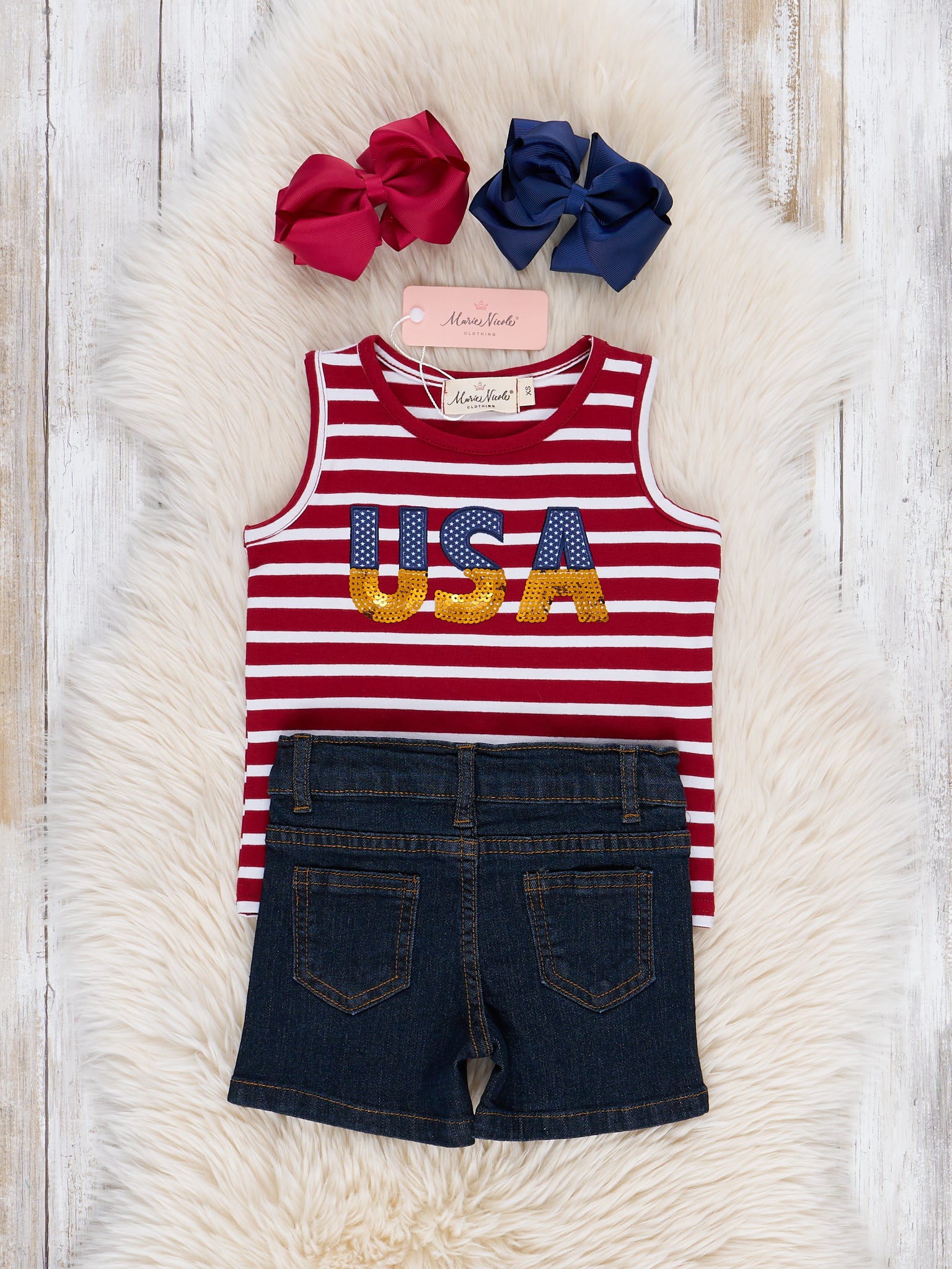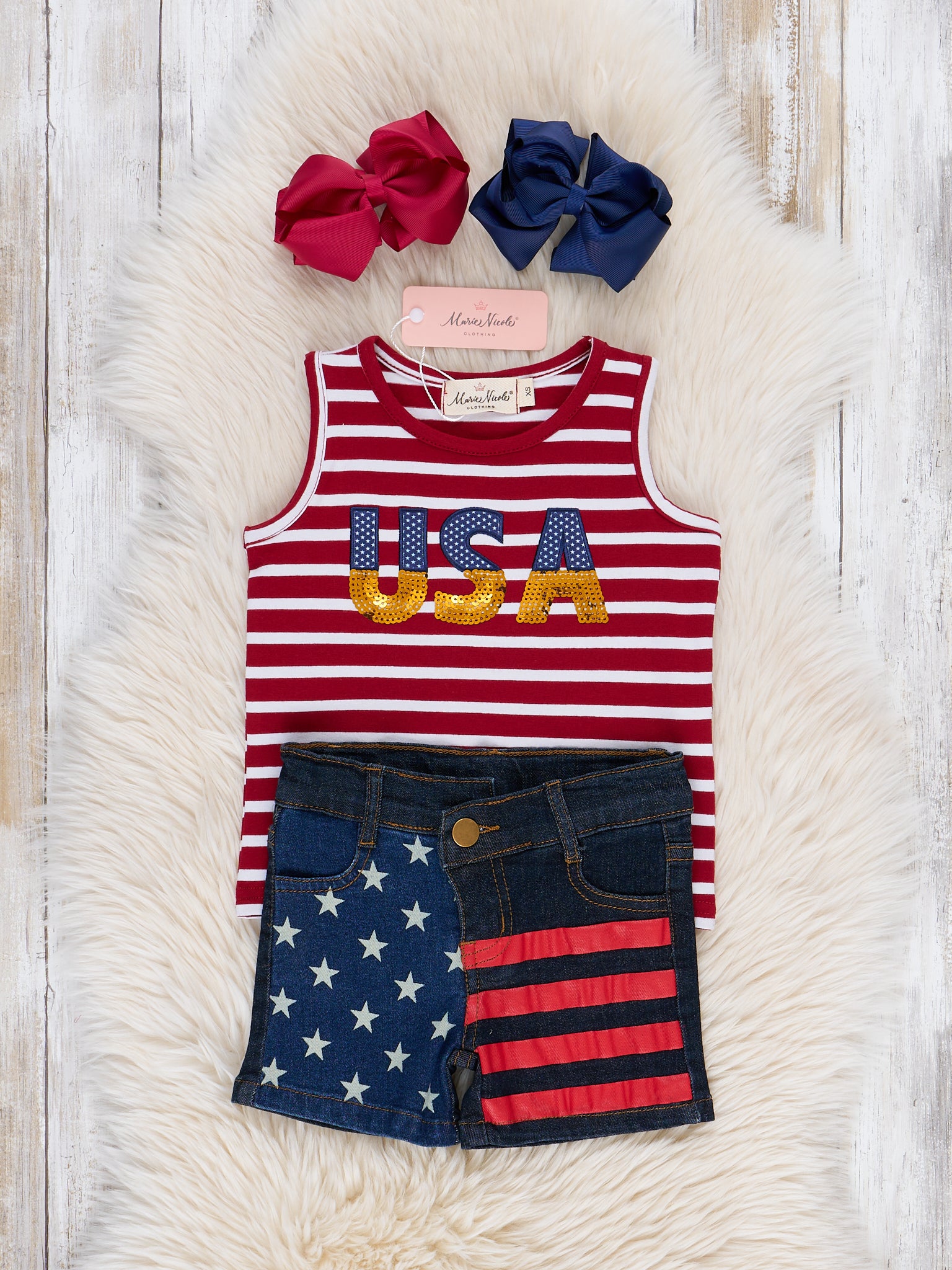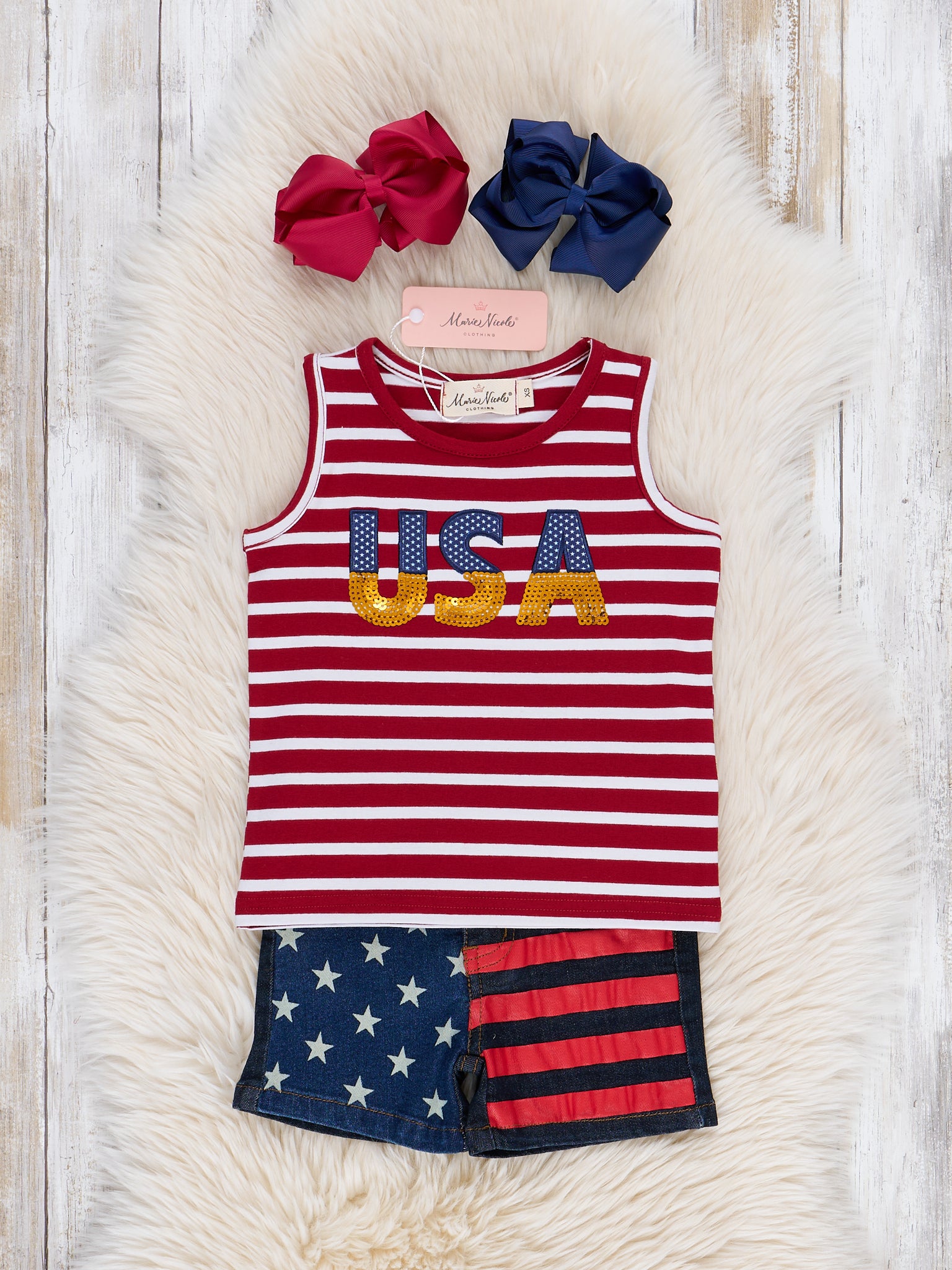 Get ready for a summer full of patriotic style with our Embroidered USA Stripes Denim Shorts Outfit! This girls' outfit features a red striped tank with a sequin USA design, paired with American flag printed denim shorts. Perfect for a fun and festive summer look from Marie Nicole Clothing.