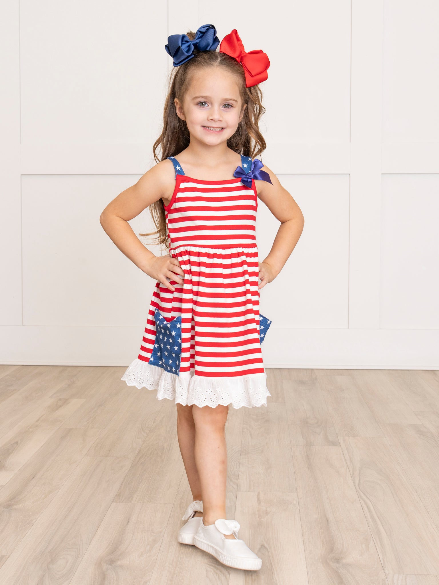 Unleash your little girl's patriotic spirit with our Patriotic Lace Hem Dress! Perfect for 4th of July celebrations, this dress features a playful mix of red stripes and blue stars, along with charming pocket and tie strap details. The delicate lace hem adds a touch of sweetness. From Marie Nicole Clothing.