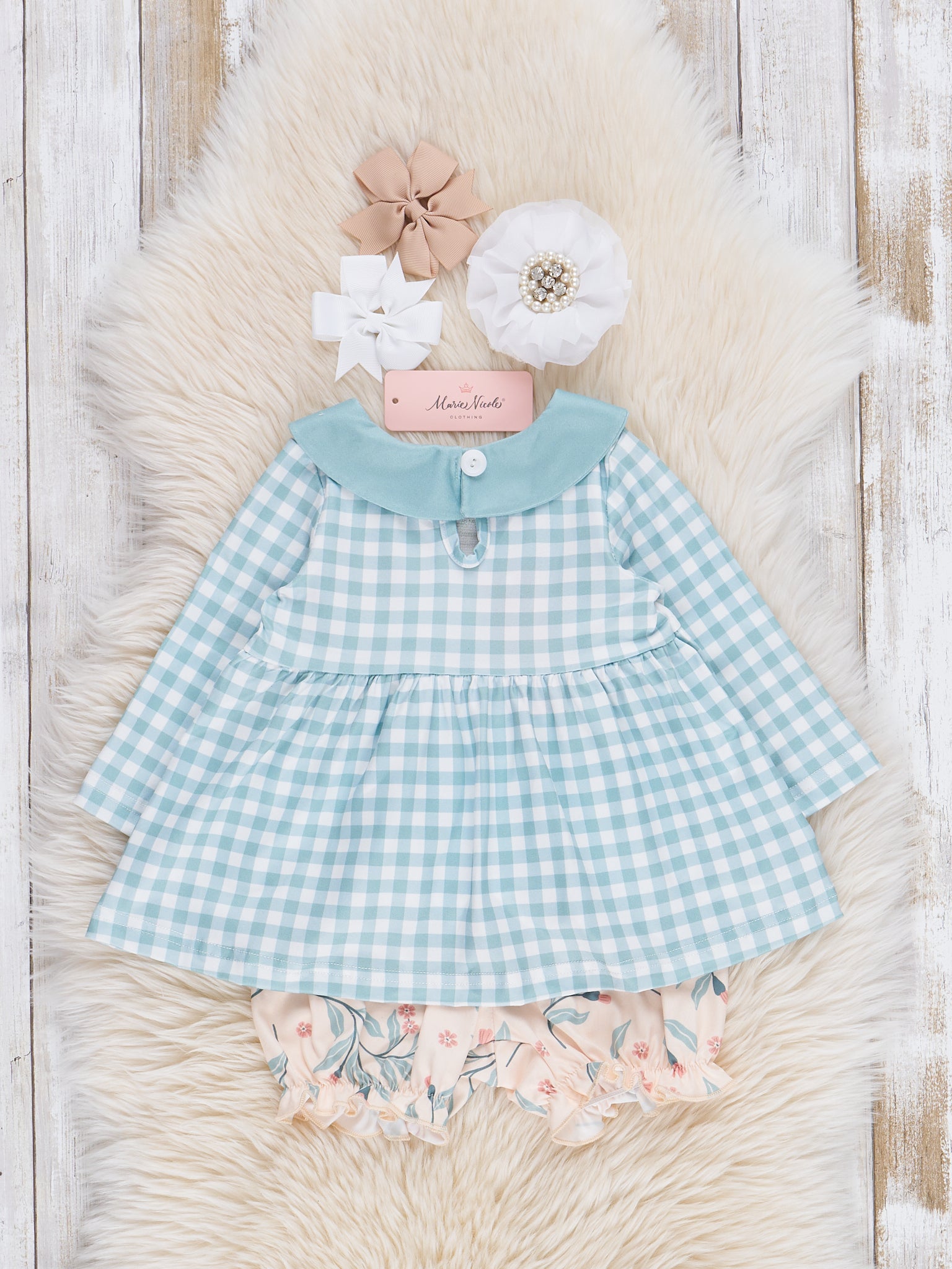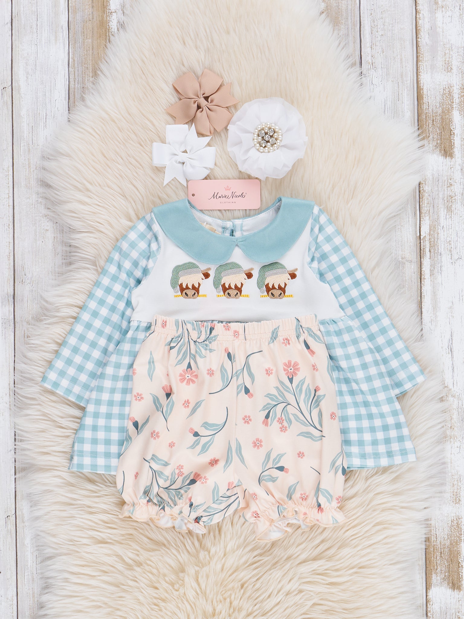 Turquoise Embroidered Floral Bunny Ruffle Dress